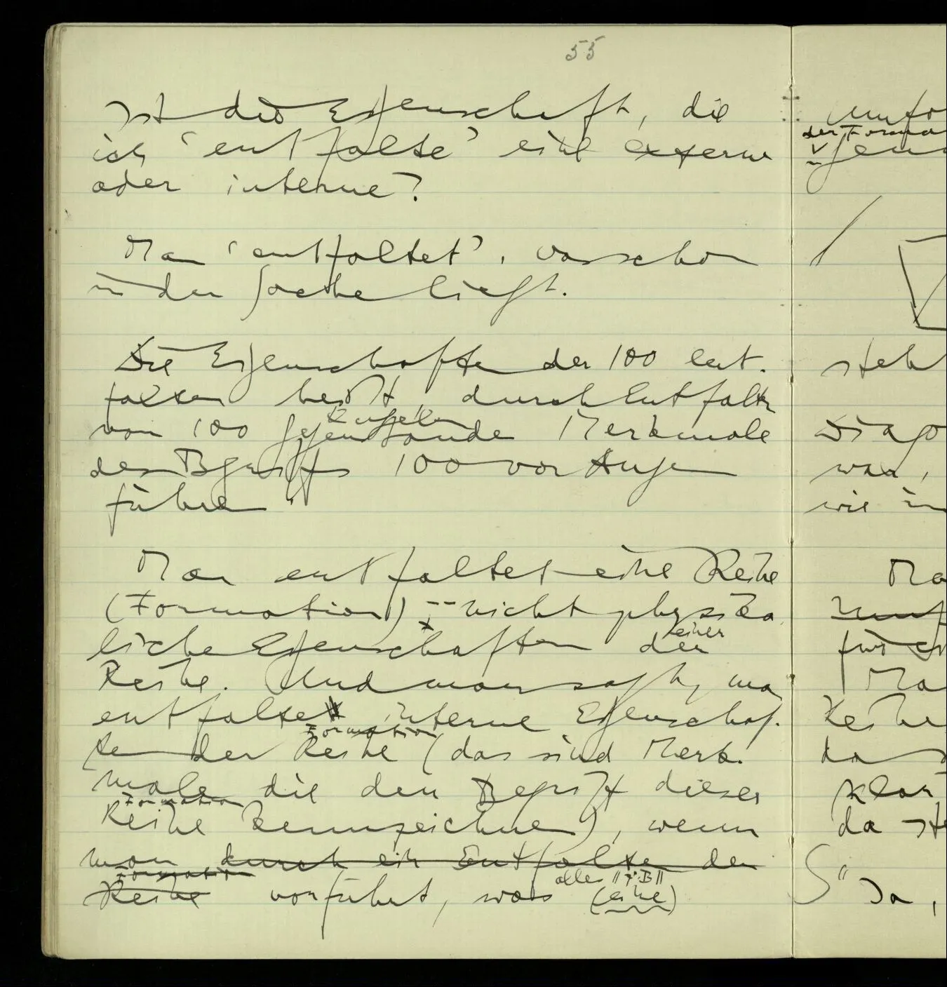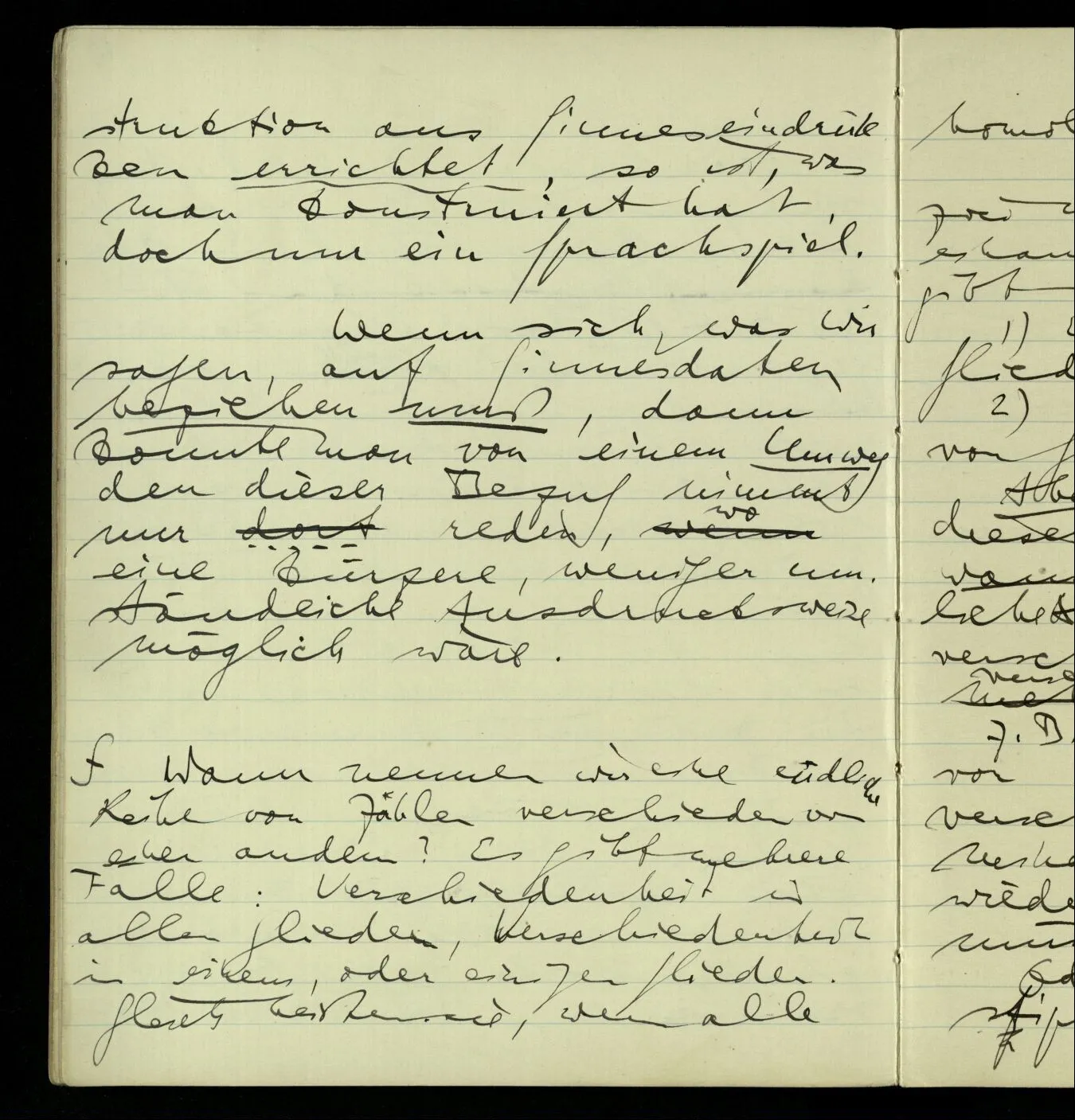 04.01.1939 ‘Man kann die Eigenschaften der Zahlen nicht in eine Reihe ordnen.’ Warum ist man (bin ich) geneigt, das zu sagen? – Wegen der Cantorschen Überlegung? Möchte ich nicht sagen: “Ein System hätte nicht die nötige Mannigfaltigkeit”? Aber warum? Weil es zu wenig Glieder hat? Ein System von Eigenschaften – möchte man sagen – ist schon eine zu große Spezialisierung. – Aber das heißt doch, daß man Eigenschaften muß angeben können, die im Gegensatz zu dem System stehen, das man etwa aufgestellt hat. Also, daß es hier wieder ein ‘anders als’ gibt. Nicht die Zahl der Glieder des Systems ist zu klein – was sollte denn das heißen? – aber indem Du ein System angabst, hast Du (selbst) neuen Bildungen den Weg gezeigt