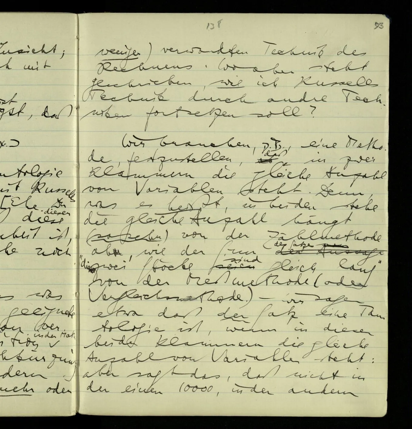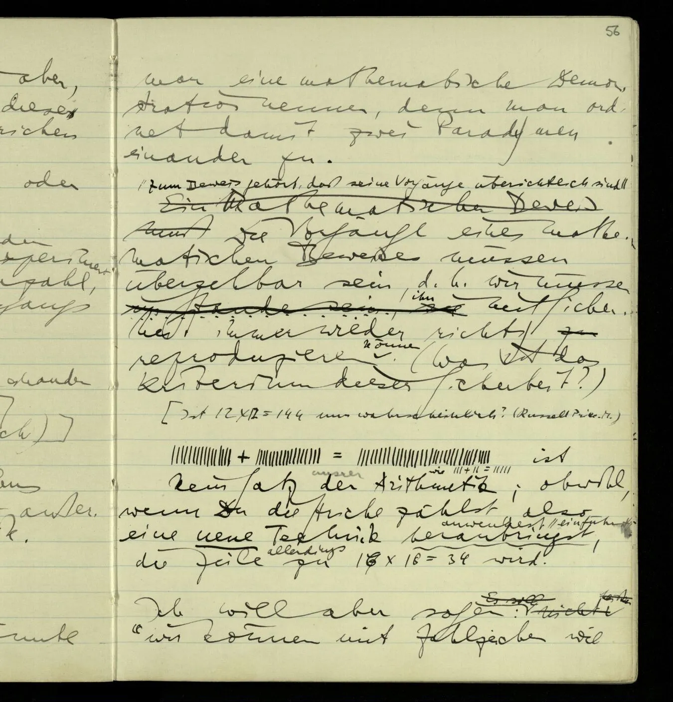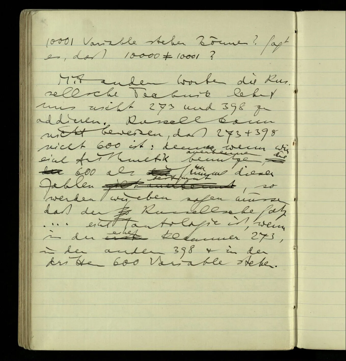 Mit andern Worten die Russellsche Technik lehrt uns nicht 273 und 398 zu addieren. Russell kann nicht beweisen, daß 273 & 398 nicht 600 ist: denn wenn wir eine Arithmetik benützen, die 600 als Summe dieser Zahlen bestimmt, so werden wir eben sagen müssen daß der Russellsche Satz … eine Tautologie ist, wenn in der einen Klammer 273, in der andern 398 & in der dritten 600 Variable stehen.