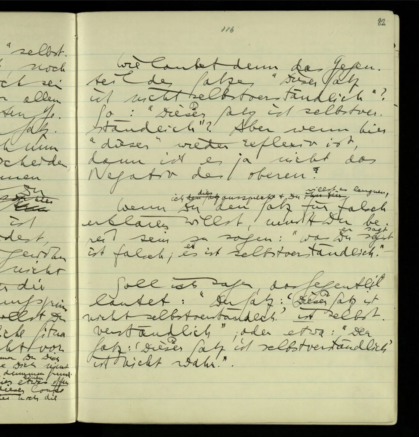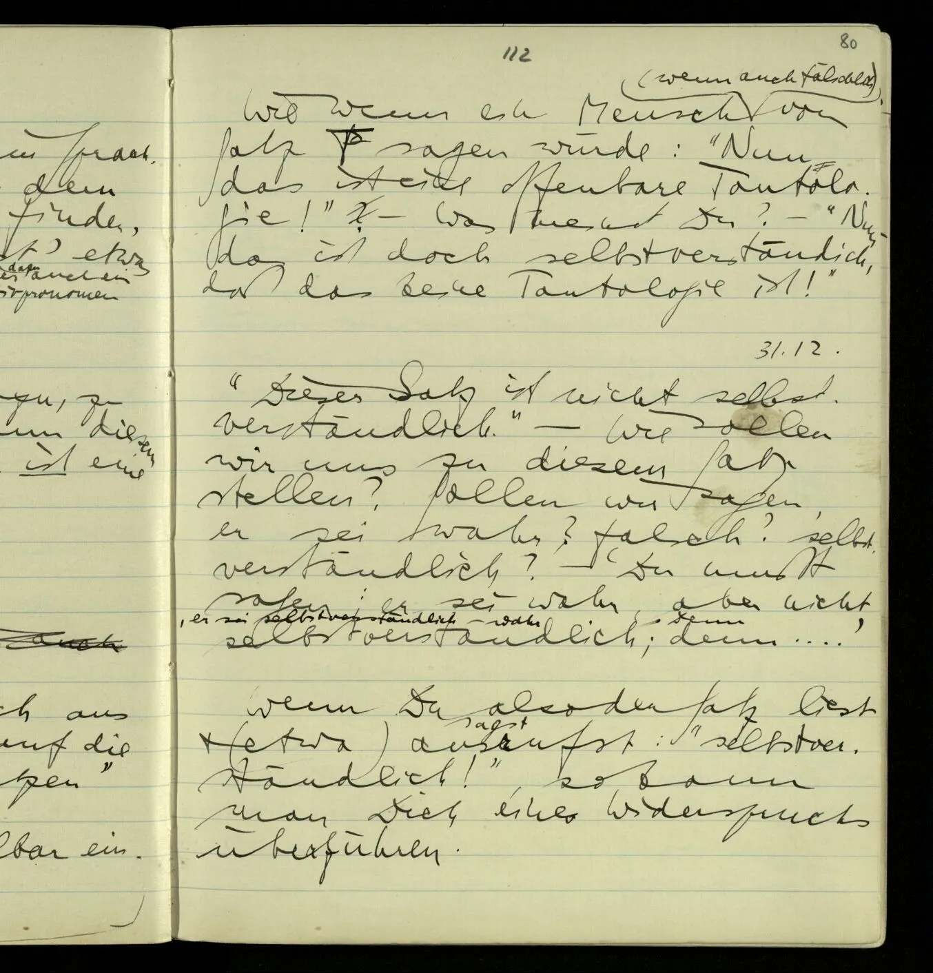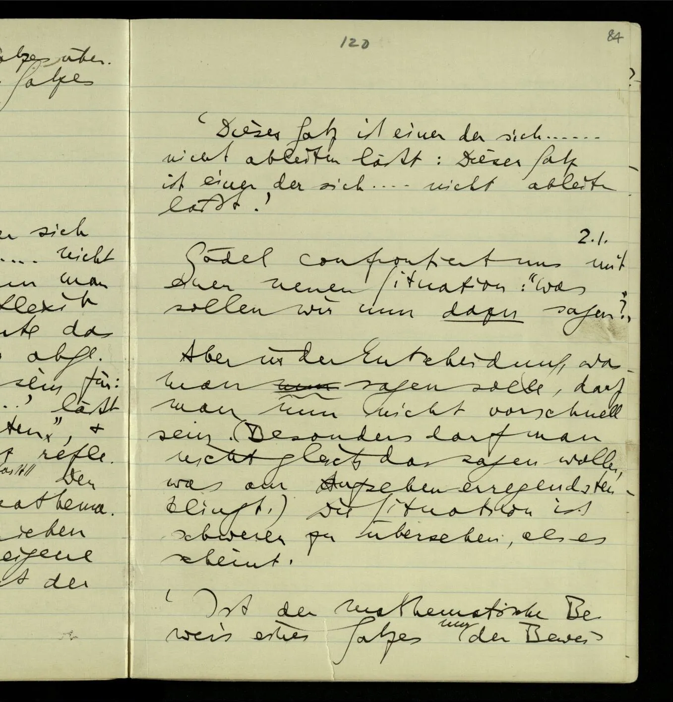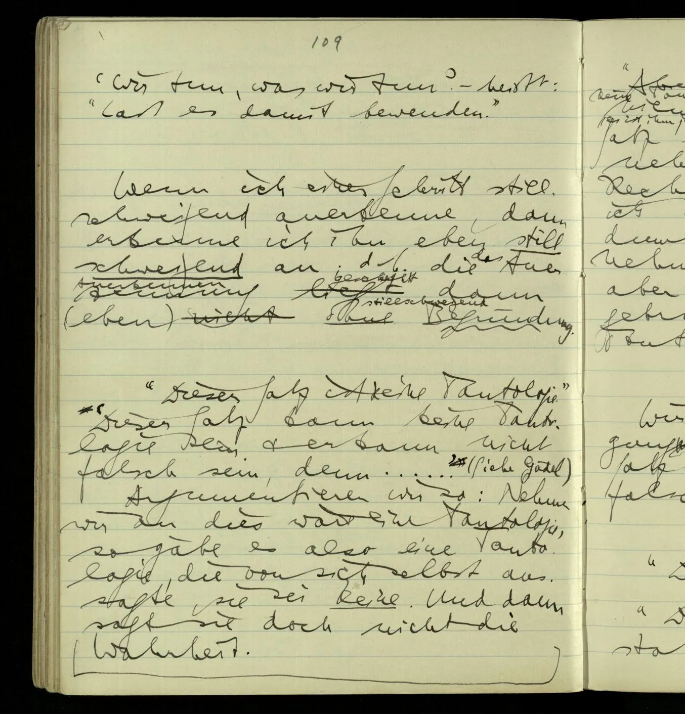 “Aber zum Teufel, er ist selbstverständlich, oder nicht selbstverständlich!” – Die Wahrheit ist, daß Du zu so etwas normalerweise nicht “selbstverständlich!” sagst, noch es behauptest, noch sein Gegenteil. Du hast vor allem gar nicht den geringsten Gebrauch für so einen Satz. Und dränge ich Dich nun doch, Dich zu entscheiden, ob Du ihn anerkennen wirst, etc., so sollst Du sehen, daß es hier ganz gleichgültig ist wie Du Dich entscheidest, daß also hier die gewöhnliche Entscheidung nicht vorliegt. Ich möchte beinahe sagen: Wofür immer Du Dich entscheidest, entscheide Dich nicht aus dem Gödelschen Grund, denn das ist ein dummer Grund. Ich wollte (lieber), Du hättest den Mut hier etwas offenbar Unsinniges zu sagen, statt daß Du vor dieser Konsequenz zurückscheust.