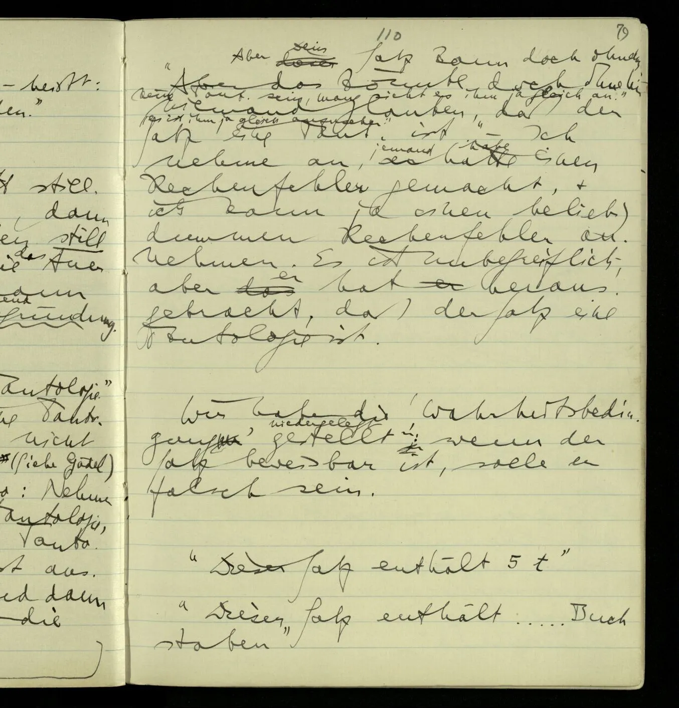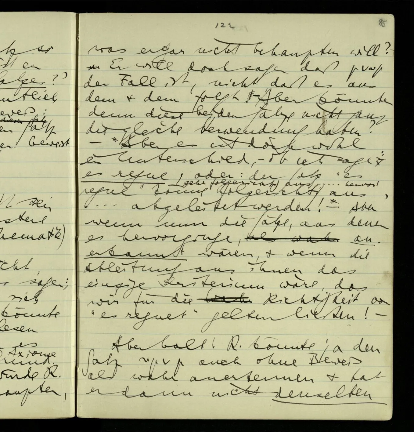 Könnte Russell nicht am Ende jedes Beweises sagen, der & der Satz ließe sich also beweisen? Ja es könnte das Zeichen “⊢” so gelesen werden, wenn man es nicht auch vor die Grundgesetze setzte. – Aber würde R. dann nicht etwas behaupten, was er gar nicht behaupten will? – Er will doch sagen daß p ⌵ ~p der Fall ist, nicht, daß es aus dem & dem folgt. – Aber könnten denn diese beiden Sätze nicht ganz die gleiche Verwendung haben? –Aber es ist doch wohl ein Unterschied, – ob ich sage: es regne; oder: der Satz “es regne” könne folgerichtig aus … abgeleitet werden! – Aber wenn nun die Sätze, aus denen es hervorginge, anerkannt wären, & wenn die Ableitung aus ihnen das einzige Kriterium wäre, das wir für die Richtigkeit von “es regnet” gelten ließen! –