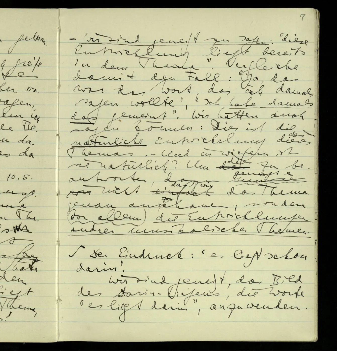 10.05.1938 ‘Brahms hat alles herausgebracht, was in dem Thema ist.’ Aber wäre es in dem Thema gewesen, wenn er’s nicht herausgebracht hätte? – D.h.: wenn das Ganze da ist, so ist es als hätte die Entwicklung in dem Thema gelegen. ‘Es liegt schon irgendwie in dem Thema, er holt es nur heraus.’ – Wir sind geneigt zu sagen: “diese Entwicklung liegt bereits in dem Thema”. Vergleiche damit den Fall: “Ja, das war das Wort, das ich damals sagen wollte”, “Ich habe damals das gemeint”. Wir hätten auch sagen können: Dies ist die natürliche Entwickelung dieses Themas. – Und in wiefern ist sie natürlich? Um dies zu beantworten, dazu genügt es nicht daß wir das Thema genau anschauen; sondern (vor allem) die Entwicklungen andrer musikalischer Themen.