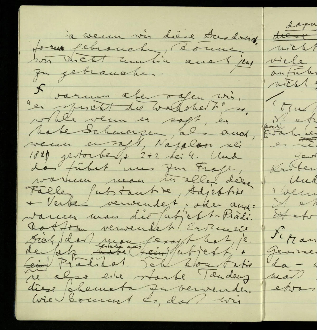 Warum aber sagen wir, “er spricht die Wahrheit”, sowohl wenn er sagt, er habe Schmerzen, als auch, wenn er sagt, Napoleon sei 1821 gestorben, & 2 + 2 sei 4. Und das führt uns zur Frage, warum man in allen diesen Fällen Substantive, Adjektive & Verben verwendet; oder auch: warum man die Subjekt-Prädikatform verwendet. Erinnere Dich, daß man gesagt hat, jeder Satz bestehe aus Subjekt & Prädikat. Ich konstatiere also eine starke Tendenz diese Schemata zu verwenden. Wie kommt es, daß wir dazu tendieren? Ich weiß nicht. Aber es lassen sich viele & interessante Gründe anführen. (Vielerlei Ursachen, nicht eine Ursache.)