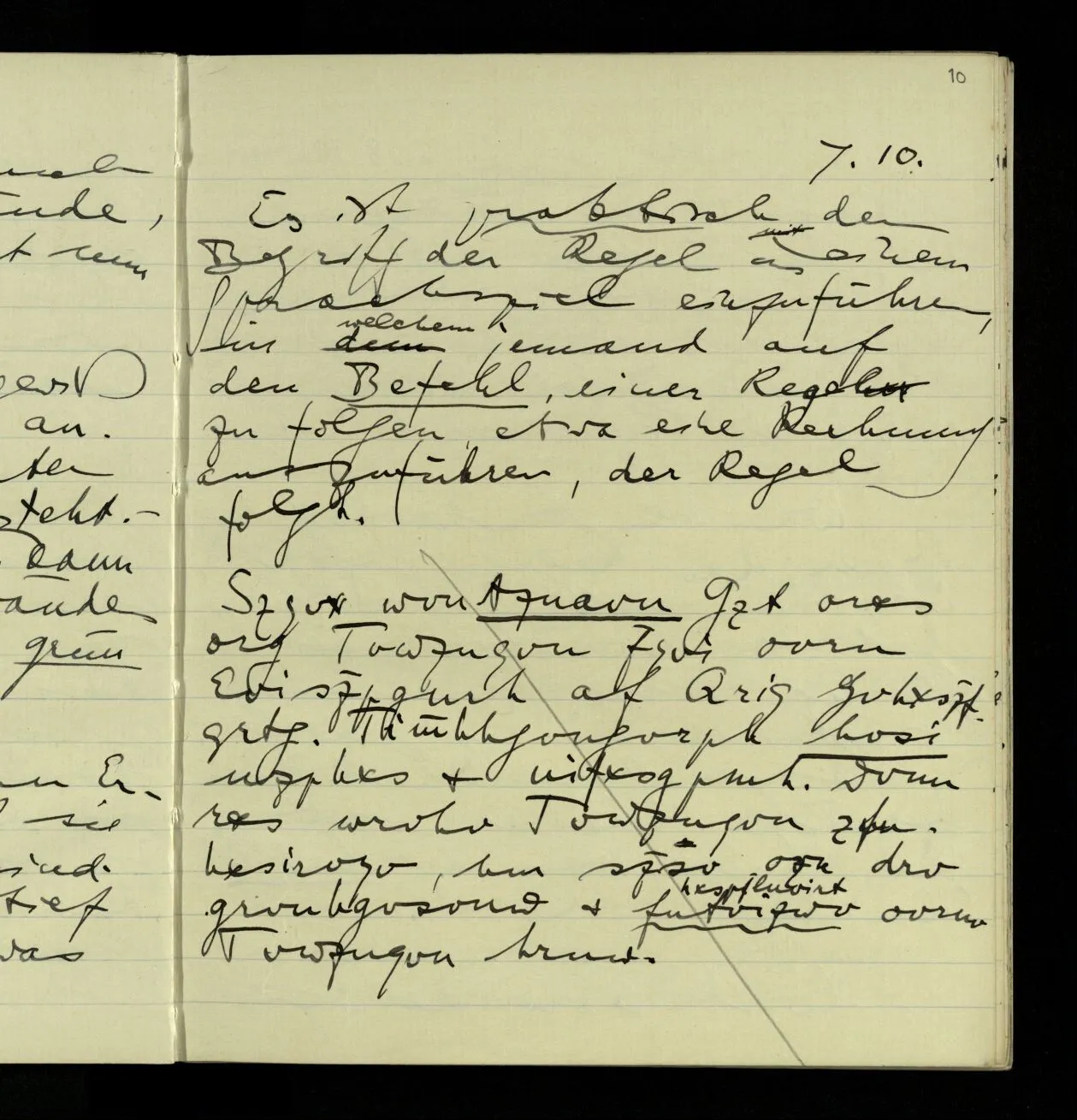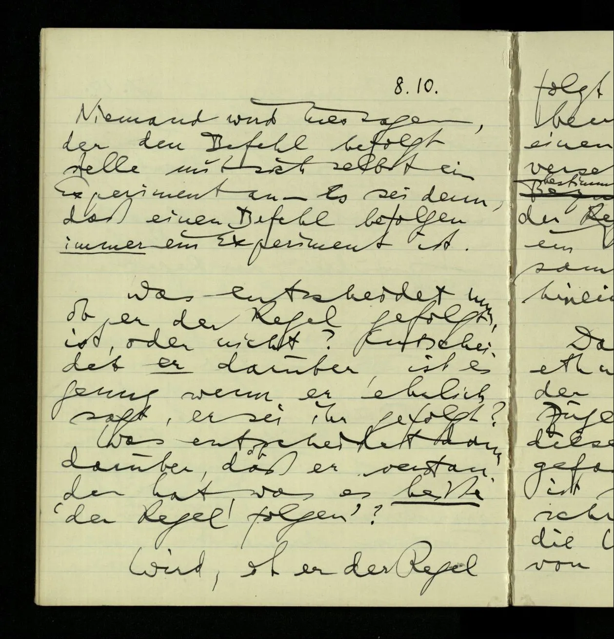 07.10.1940 Es ist praktisch den Begriff der Regel in einem Sprachspiel einzuführen, in welchem jemand auf den Befehl, einer Regel zu folgen, etwa eine Rechnung auszuführen, der Regel folgt.