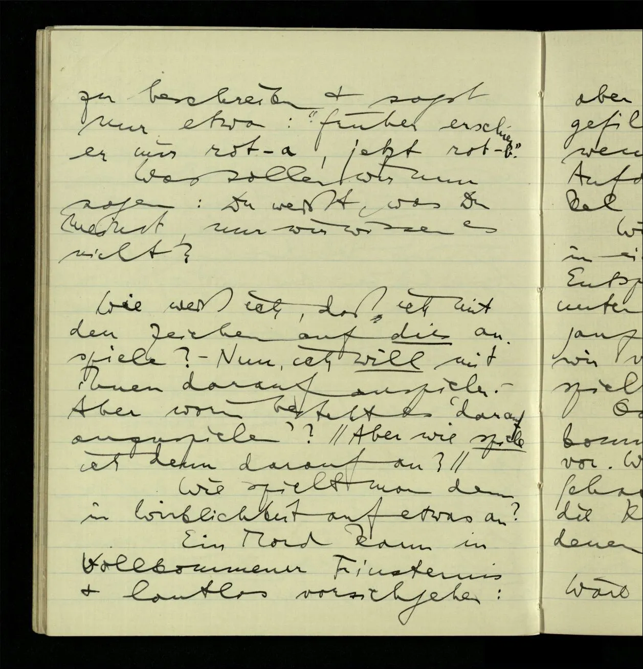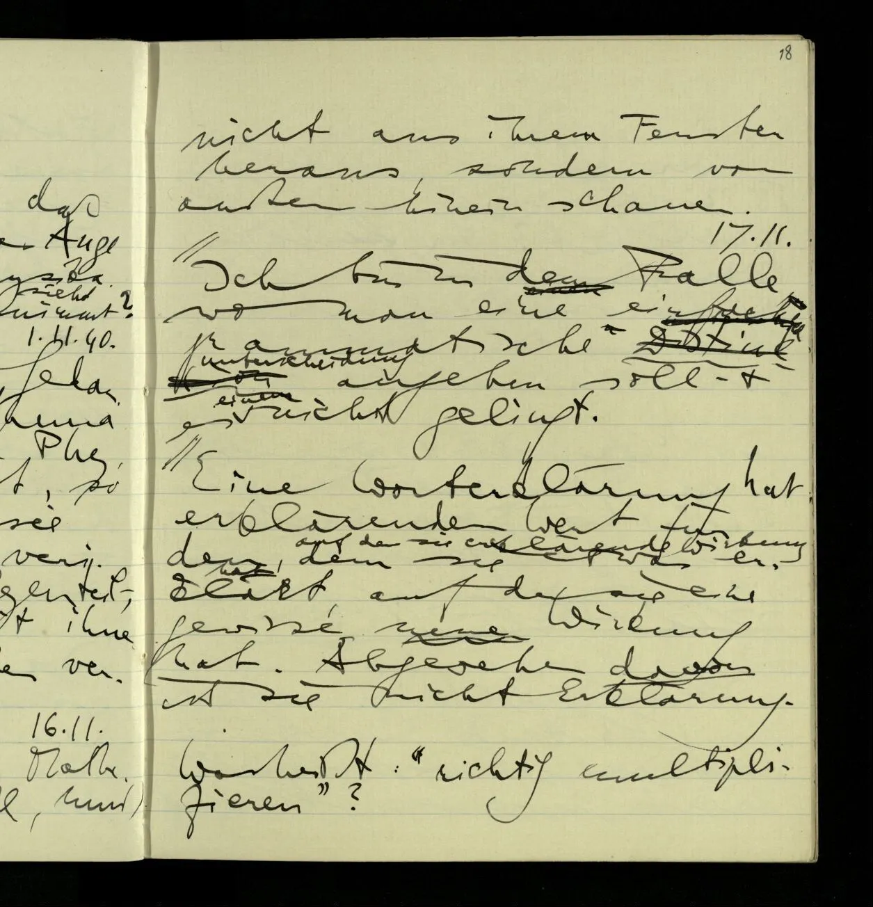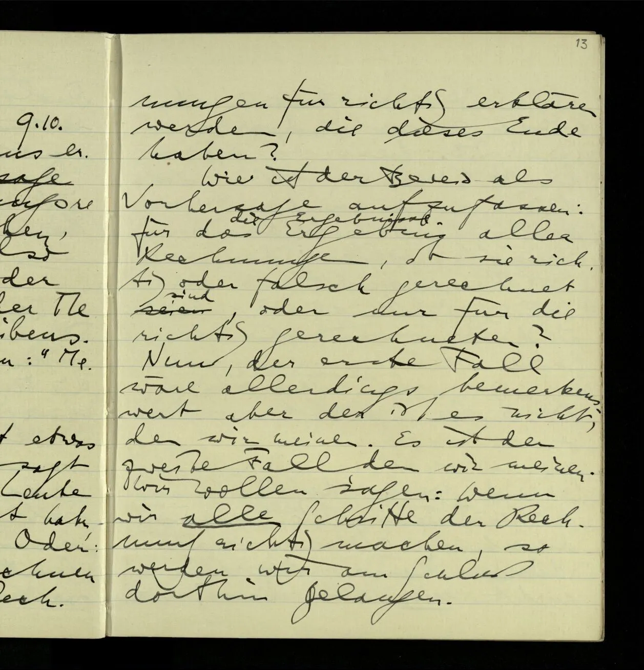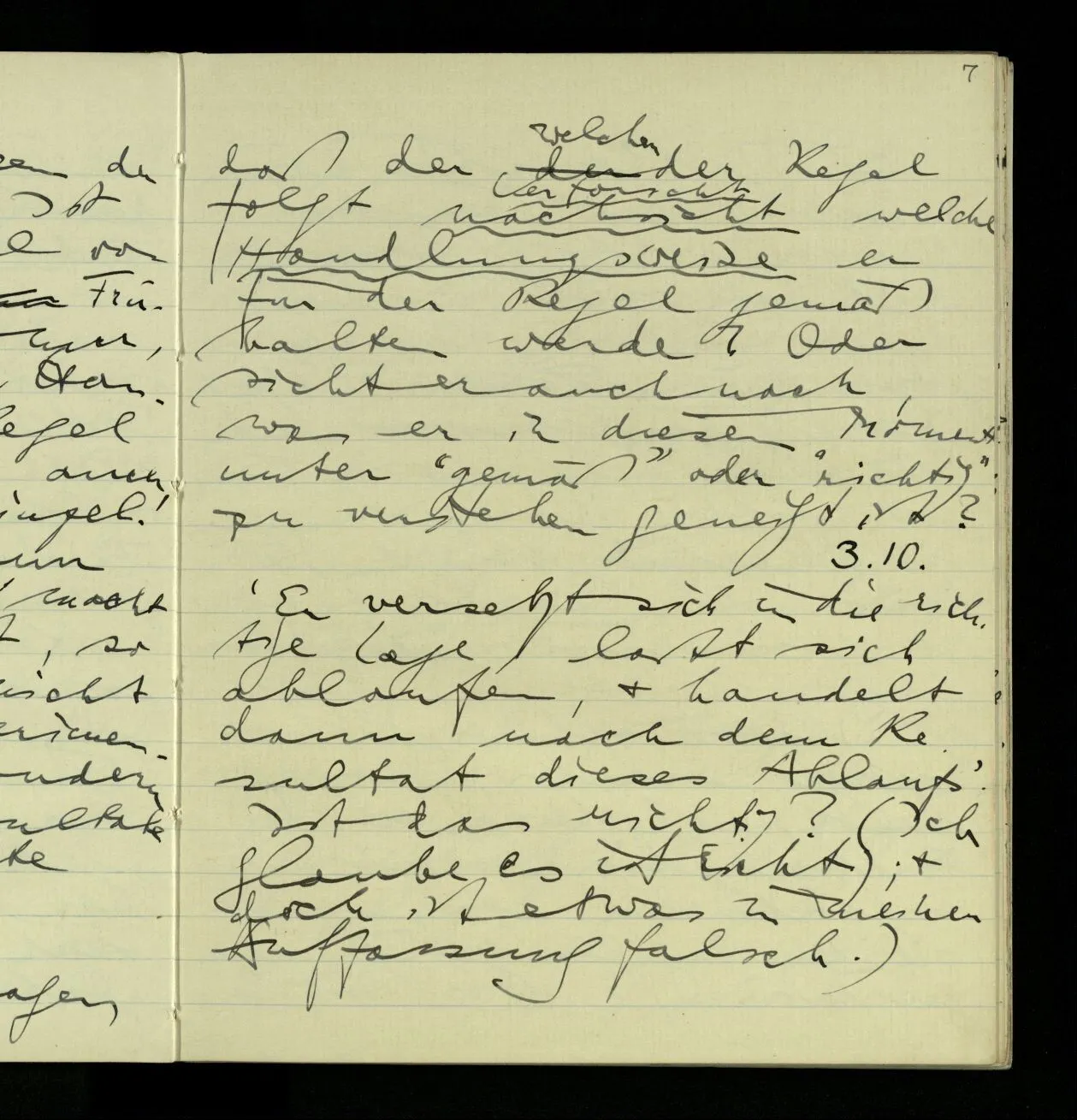 03.10.1940 ‘Er versetzt sich in die richtige Lage, läßt sich ablaufen, & handelt dann nach dem Resultat dieses Ablaufs’. Ist das richtig? (Ich glaube es ist richtig; & doch ist etwas in meiner Auffassung falsch.)