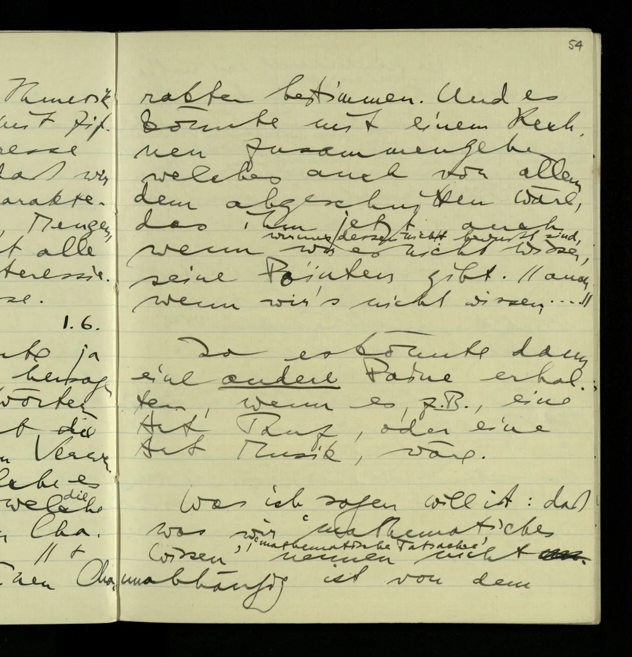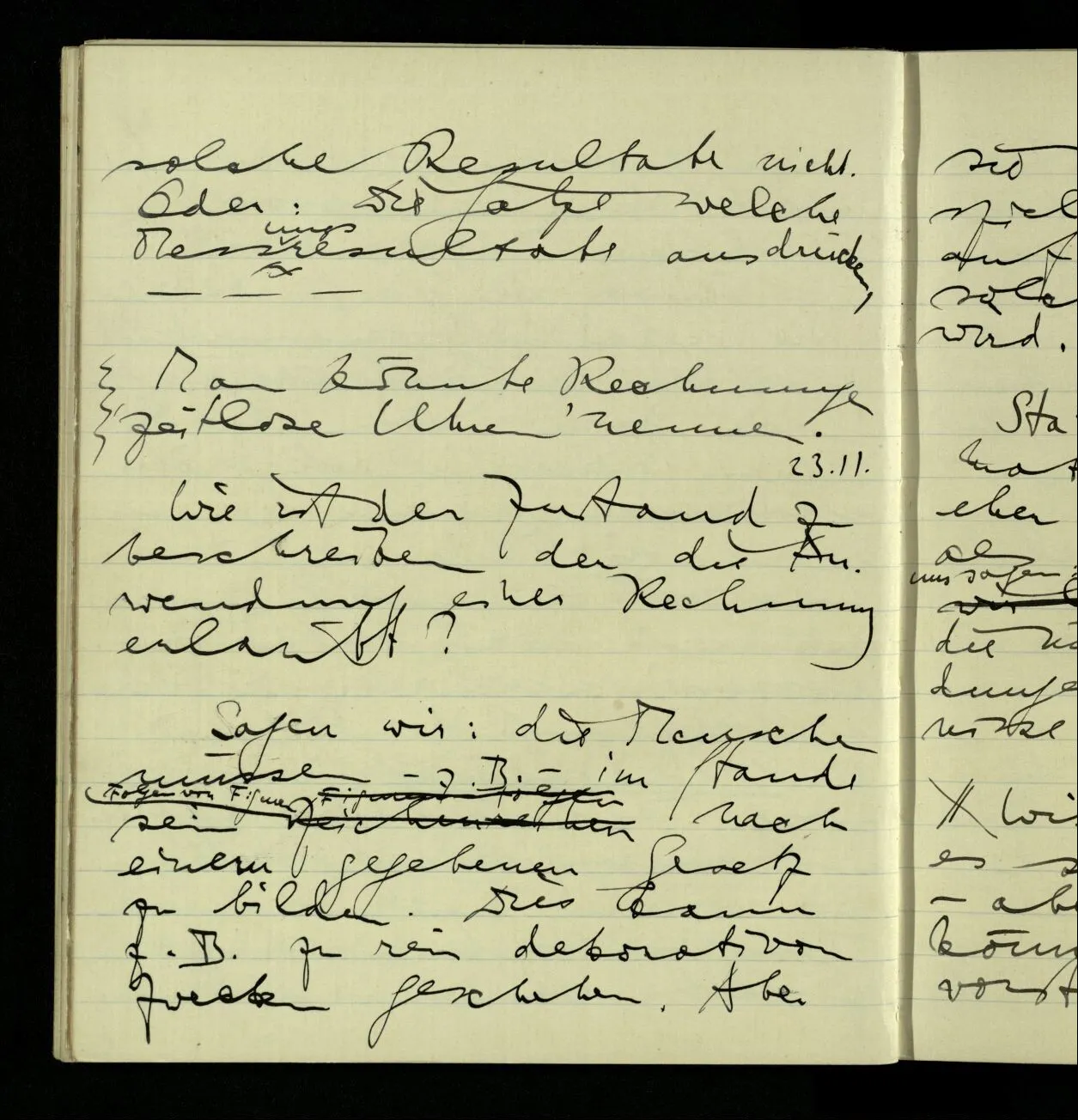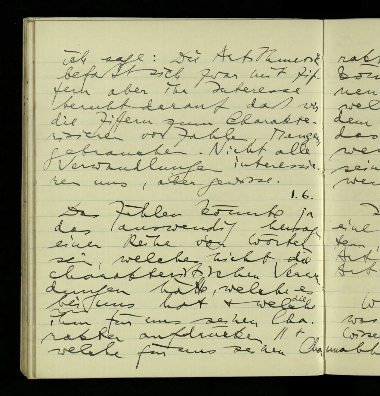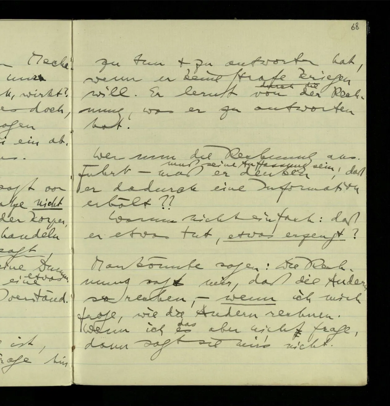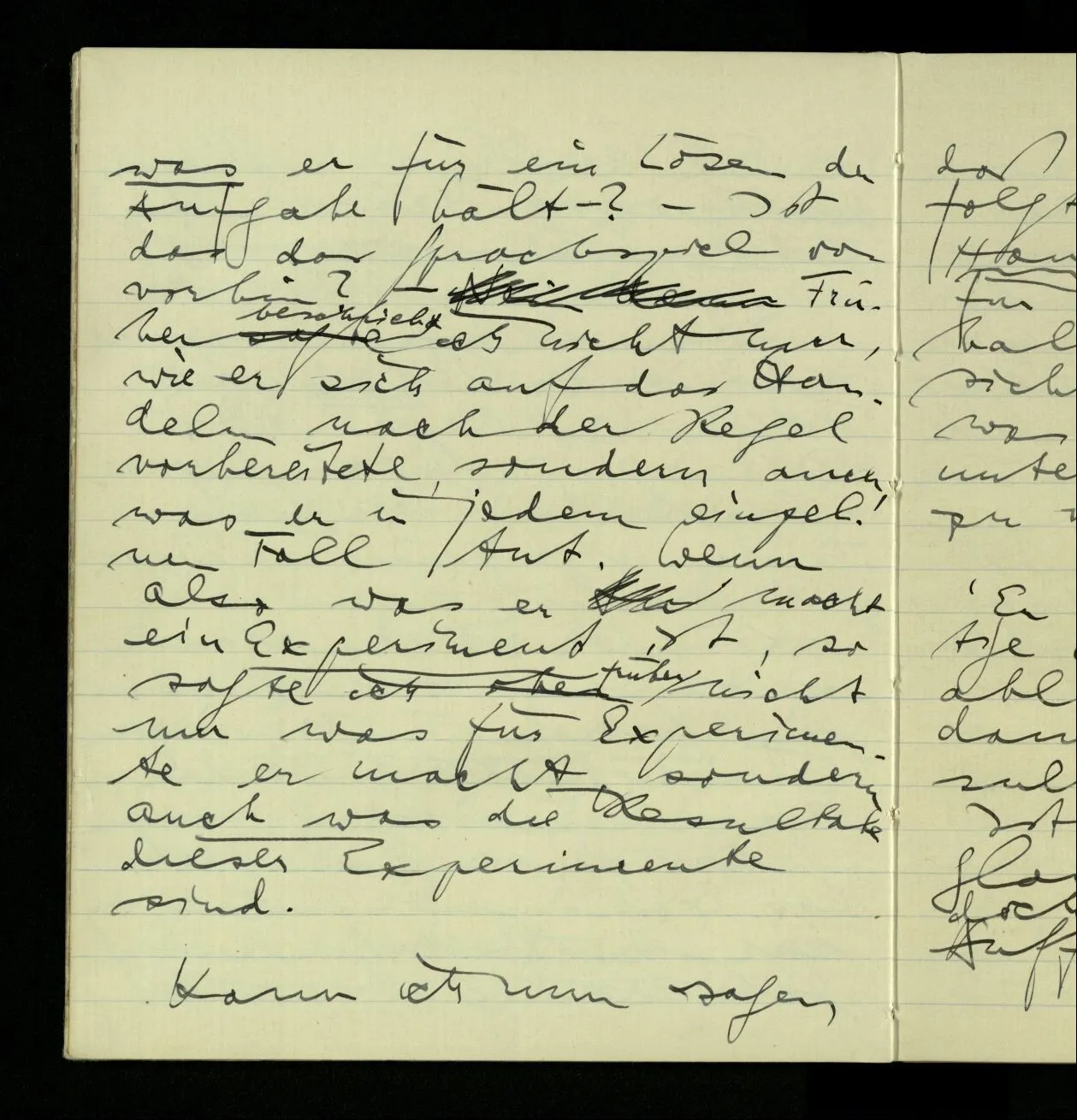 03.10.1940 ‘Er versetzt sich in die richtige Lage, läßt sich ablaufen, & handelt dann nach dem Resultat dieses Ablaufs’. Ist das richtig? (Ich glaube es ist richtig; & doch ist etwas in meiner Auffassung falsch.)
