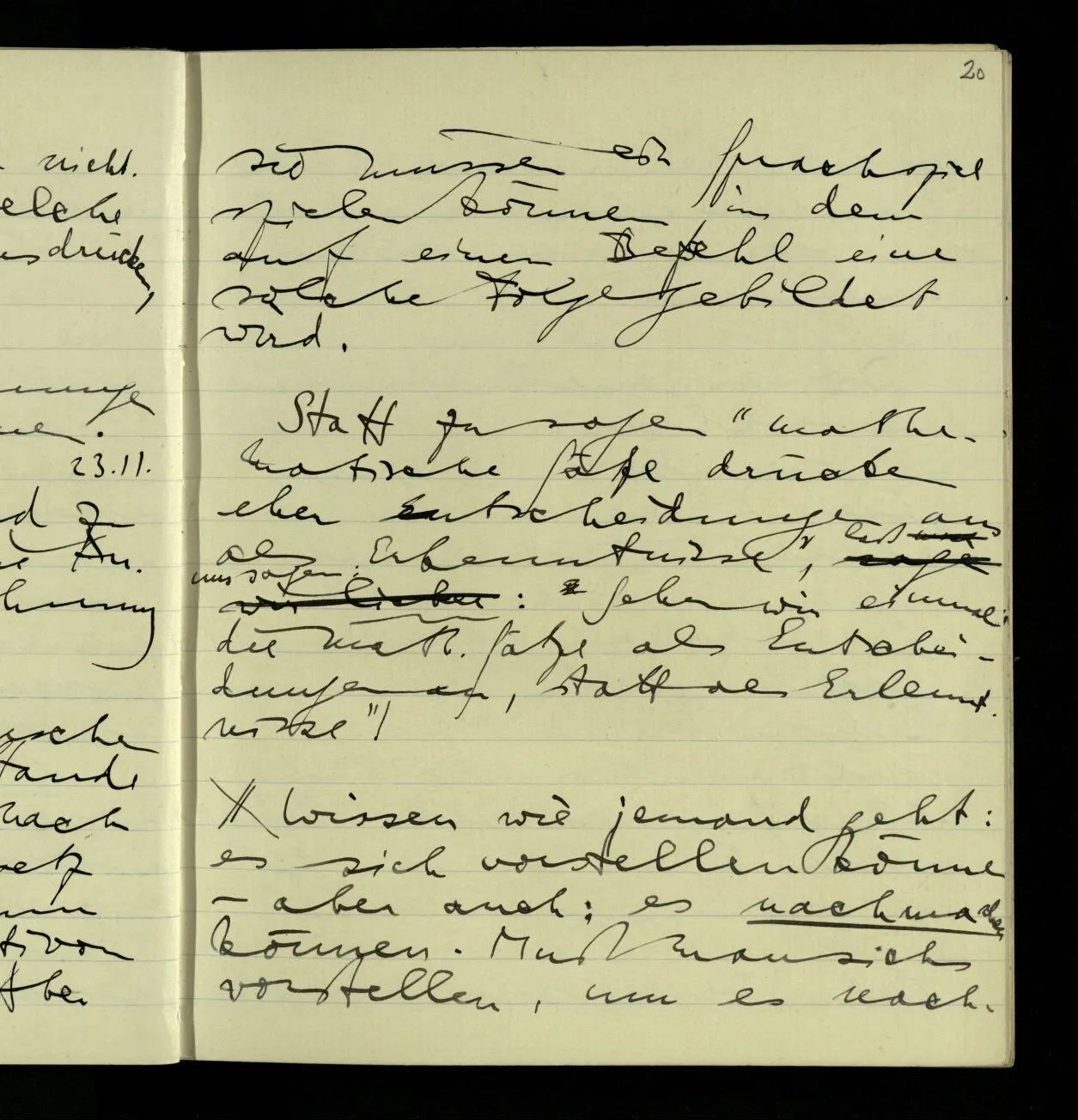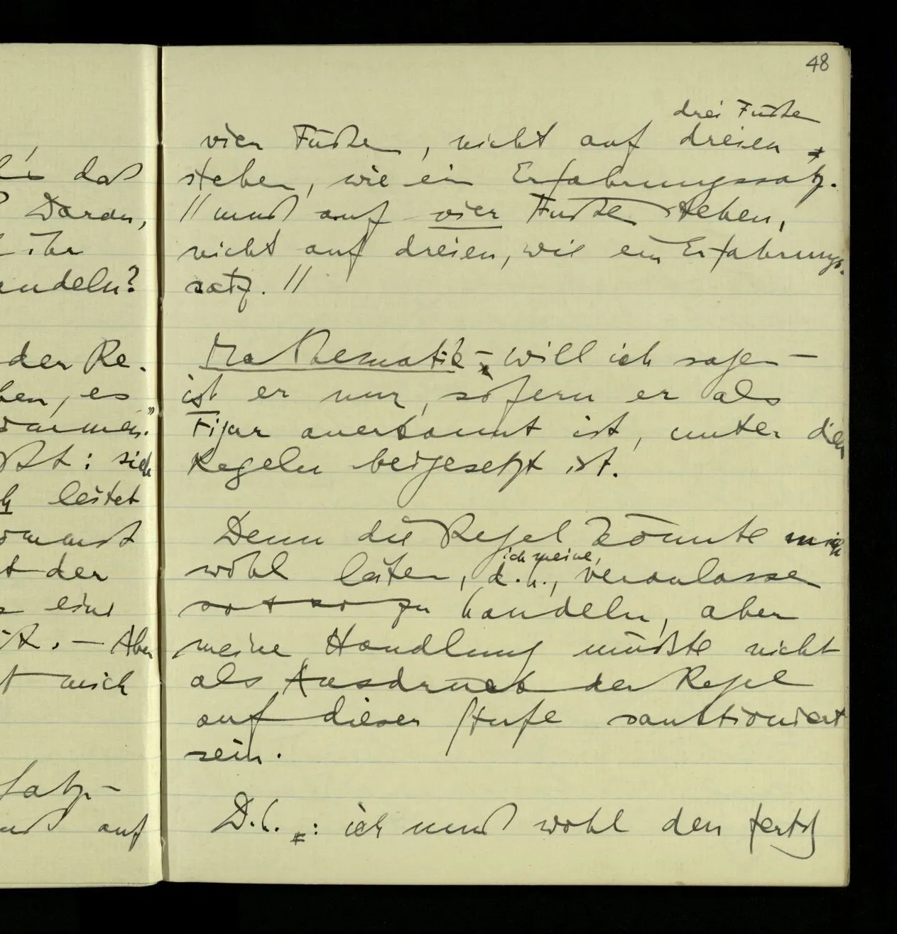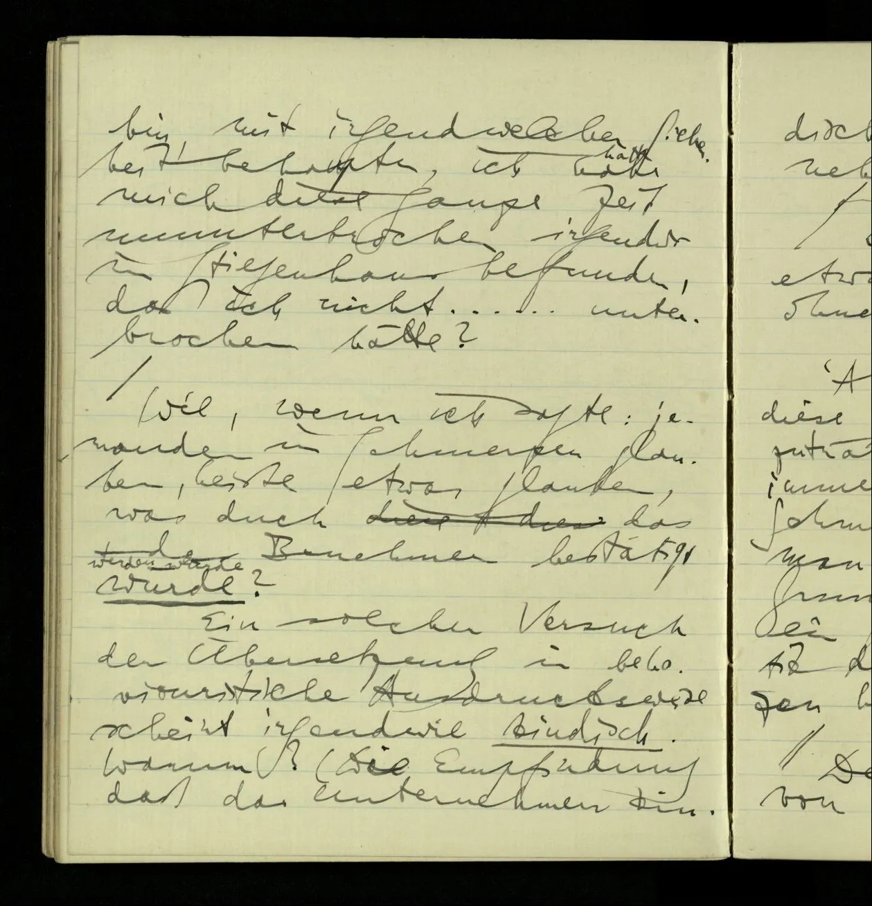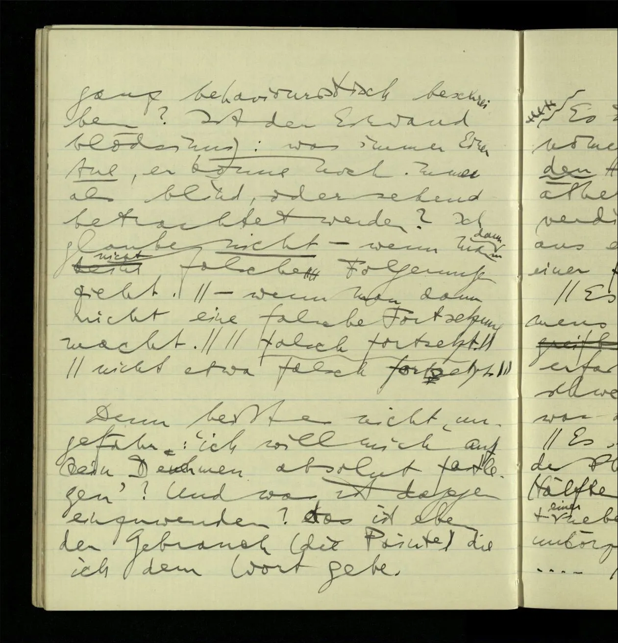 03.10.1940 ‘Er versetzt sich in die richtige Lage, läßt sich ablaufen, & handelt dann nach dem Resultat dieses Ablaufs’. Ist das richtig? (Ich glaube es ist richtig; & doch ist etwas in meiner Auffassung falsch.)