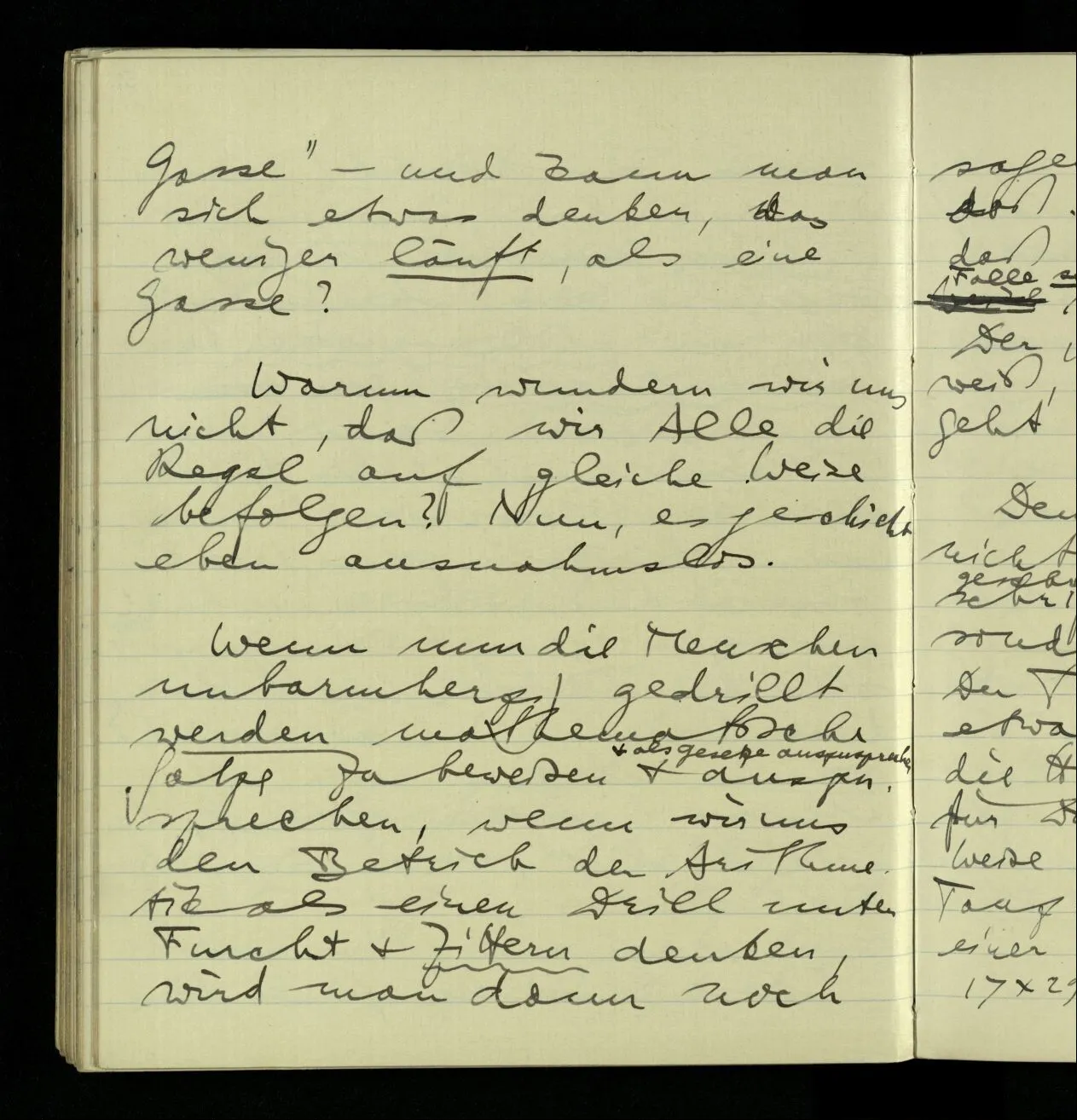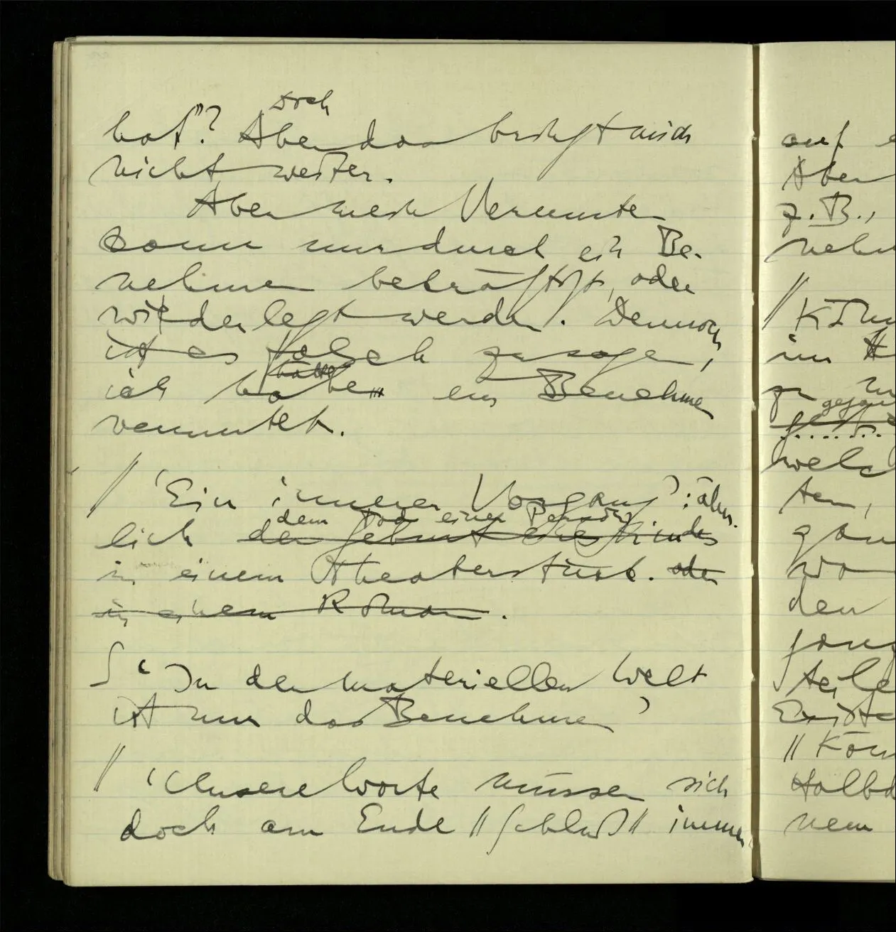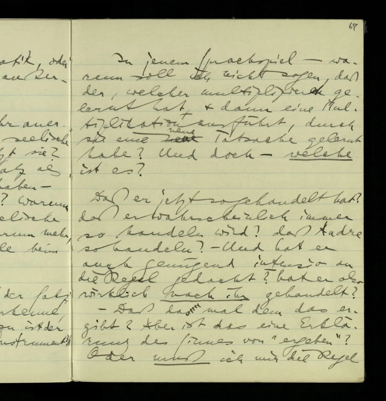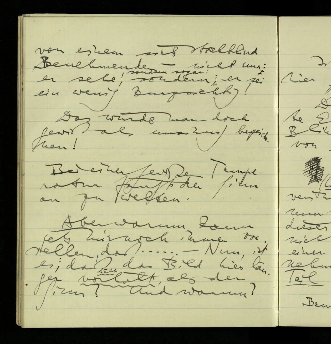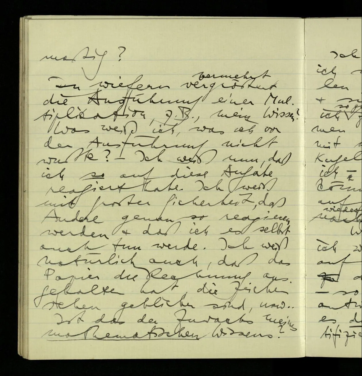 03.10.1940 ‘Er versetzt sich in die richtige Lage, läßt sich ablaufen, & handelt dann nach dem Resultat dieses Ablaufs’. Ist das richtig? (Ich glaube es ist richtig; & doch ist etwas in meiner Auffassung falsch.)