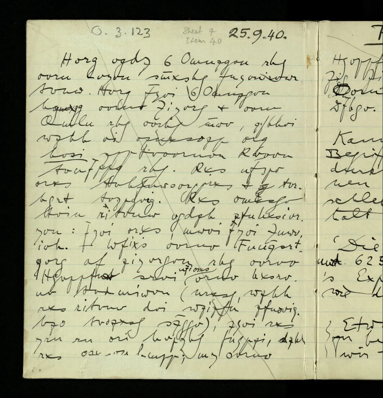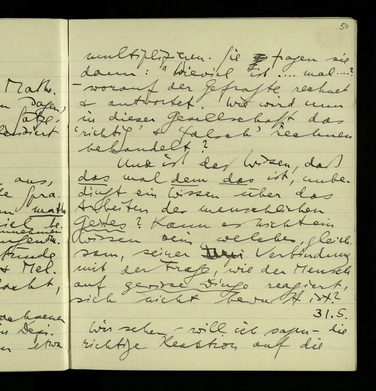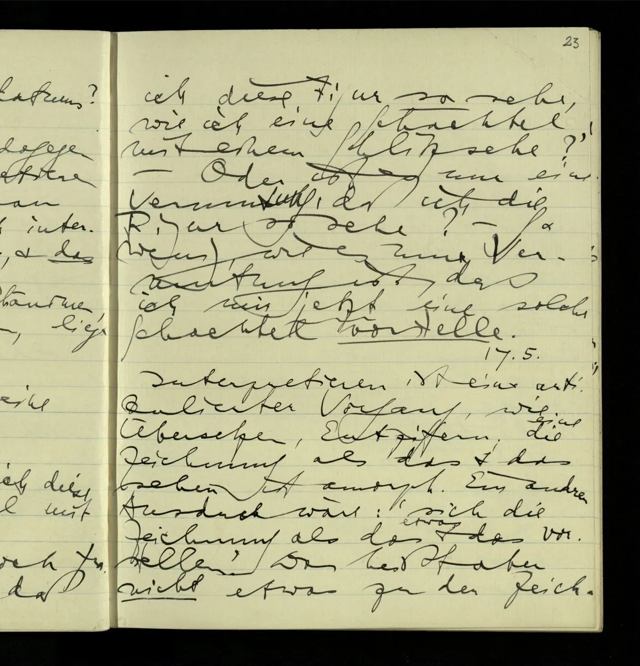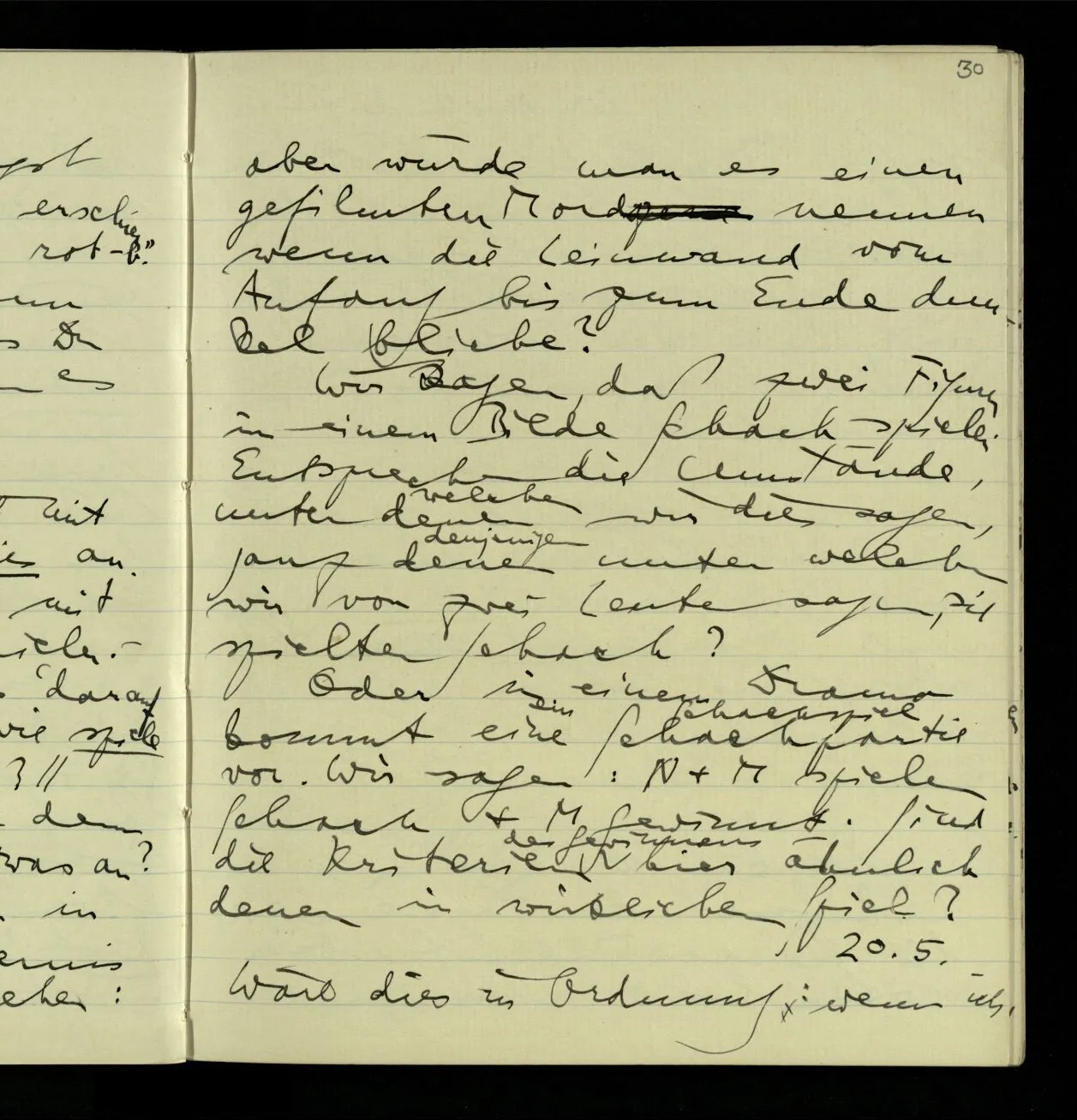 03.10.1940 ‘Er versetzt sich in die richtige Lage, läßt sich ablaufen, & handelt dann nach dem Resultat dieses Ablaufs’. Ist das richtig? (Ich glaube es ist richtig; & doch ist etwas in meiner Auffassung falsch.)