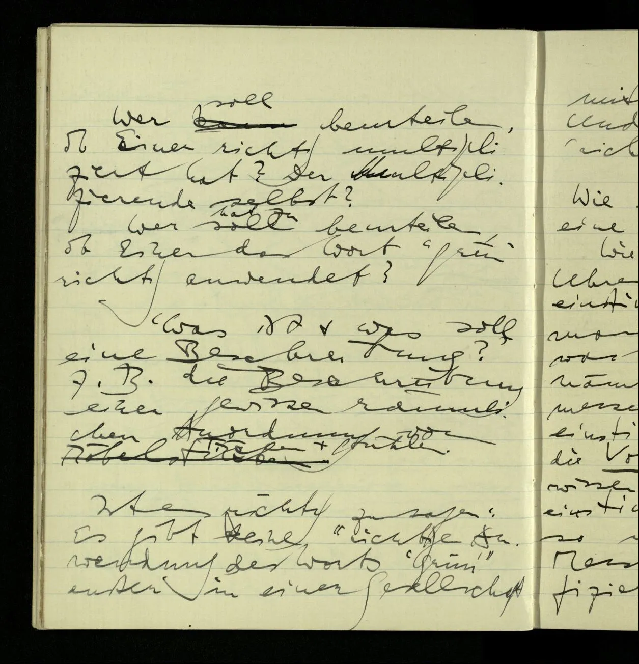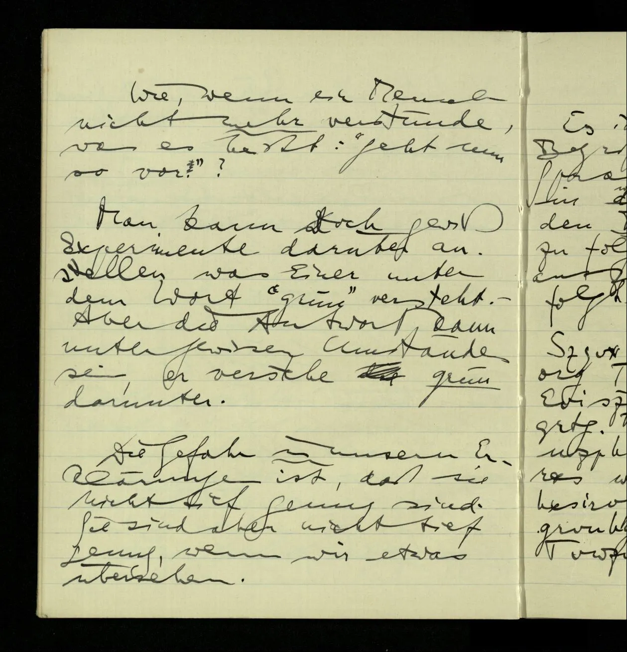 Man kann doch gewiß Experimente darüber anstellen was Einer unter dem Wort ‘grün’ versteht. – Aber die Antwort kann unter gewissen Umständen sein, er verstehe grün darunter.