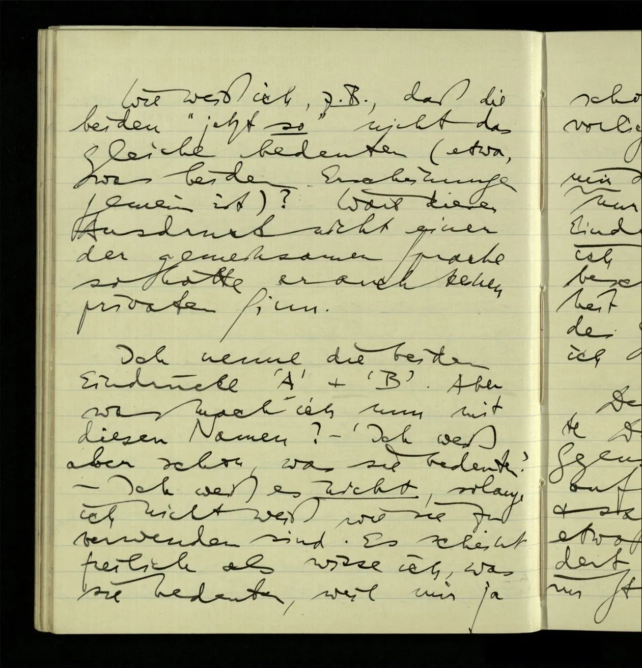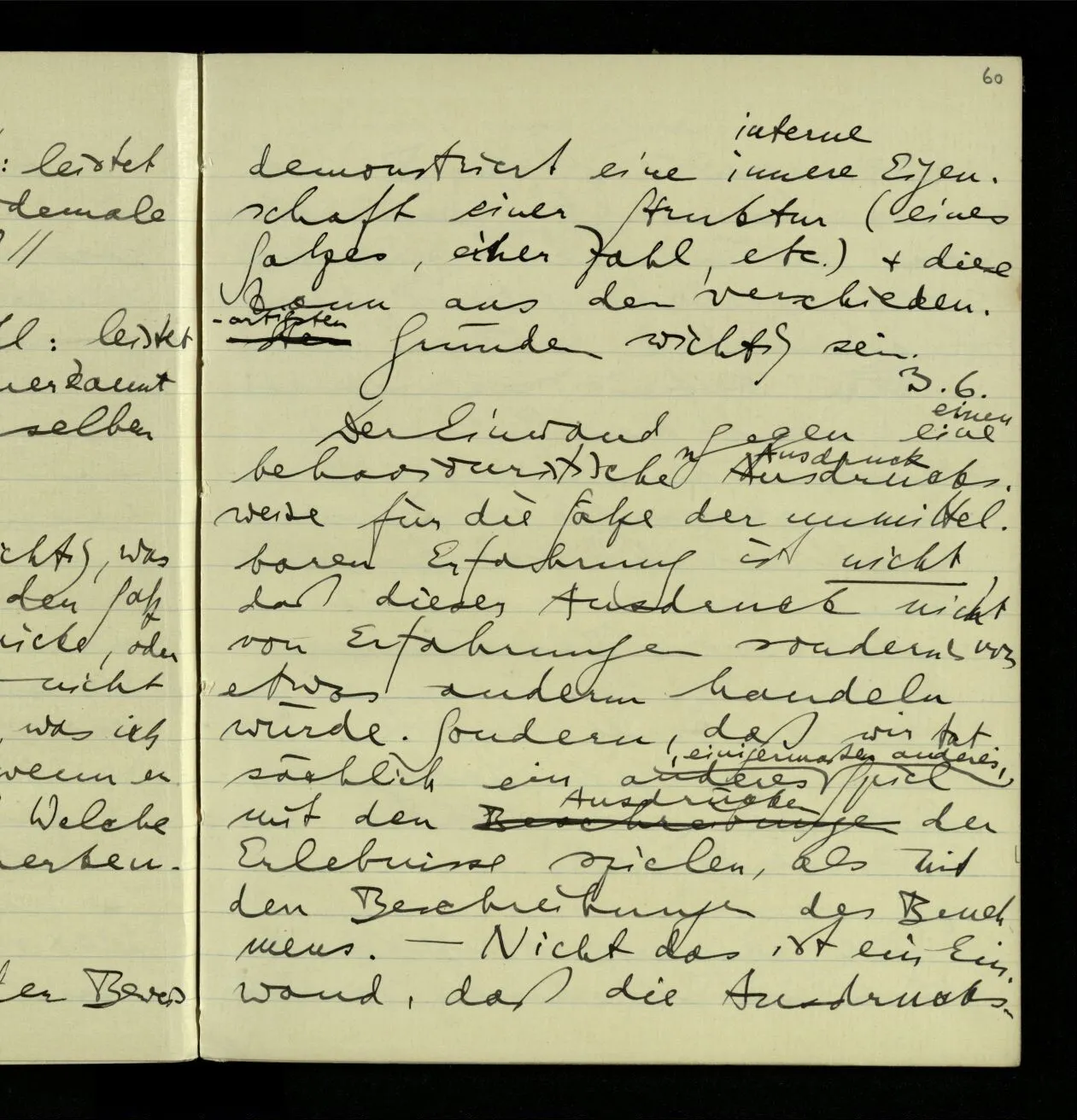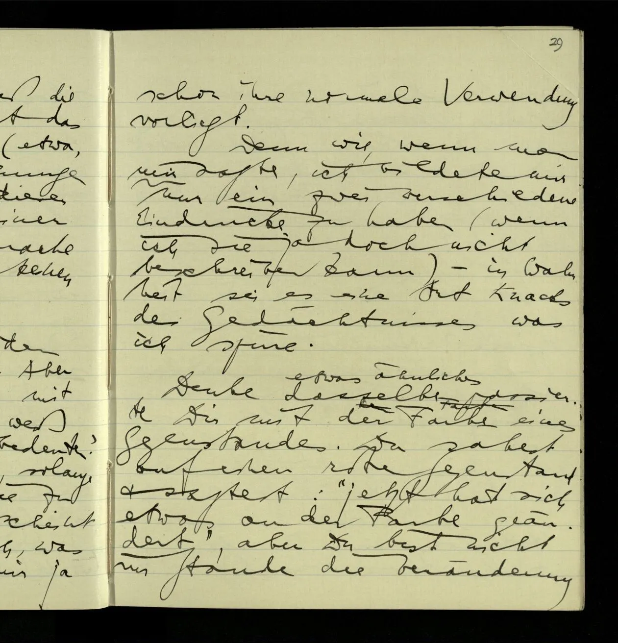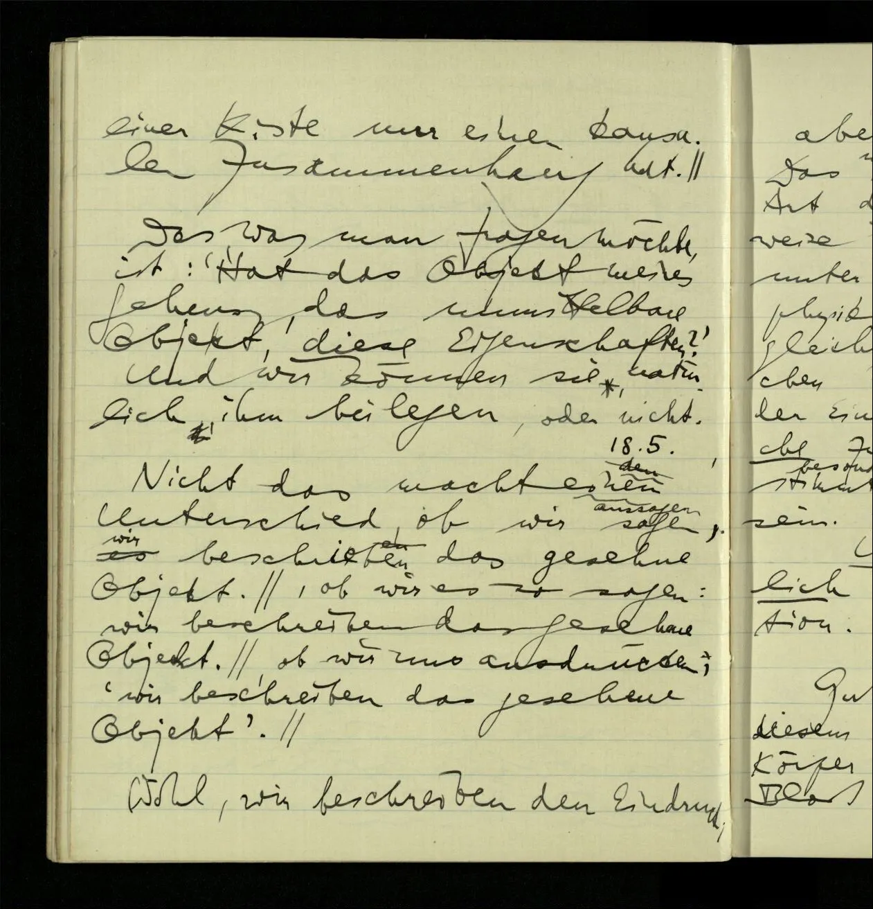 03.06.1941 Der Einwand gegen eine behavioristische Ausdrucksweise für die Sätze der unmittelbaren Erfahrung ist nicht, daß dieser Ausdruck nicht von Erfahrungen sondern von etwas anderm handeln würde. Sondern, daß wir tatsächlich ein anderes, einigermaßen anderes, Spiel mit den Ausdrücken der Erlebnisse spielen, als mit den Beschreibungen des Benehmens. – Nicht das ist ein Einwand, daß die Ausdrucksweise vom äußern Benehmen handelt, denn wovon sie ‘handelt’ zeigt sich nicht unbedingt in den Ausdrücken & ihren ostensiven Definitionen, sondern im System des Gebrauchs der Ausdrücke. Wenn Einer besorgt sagt: “Er stöhnt fürchterlich”, so kann man sagen, er rede nicht vom Benehmen.