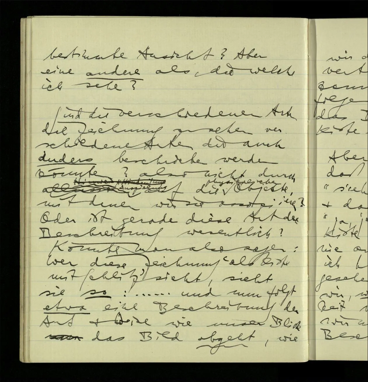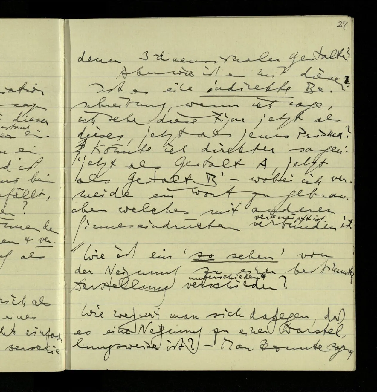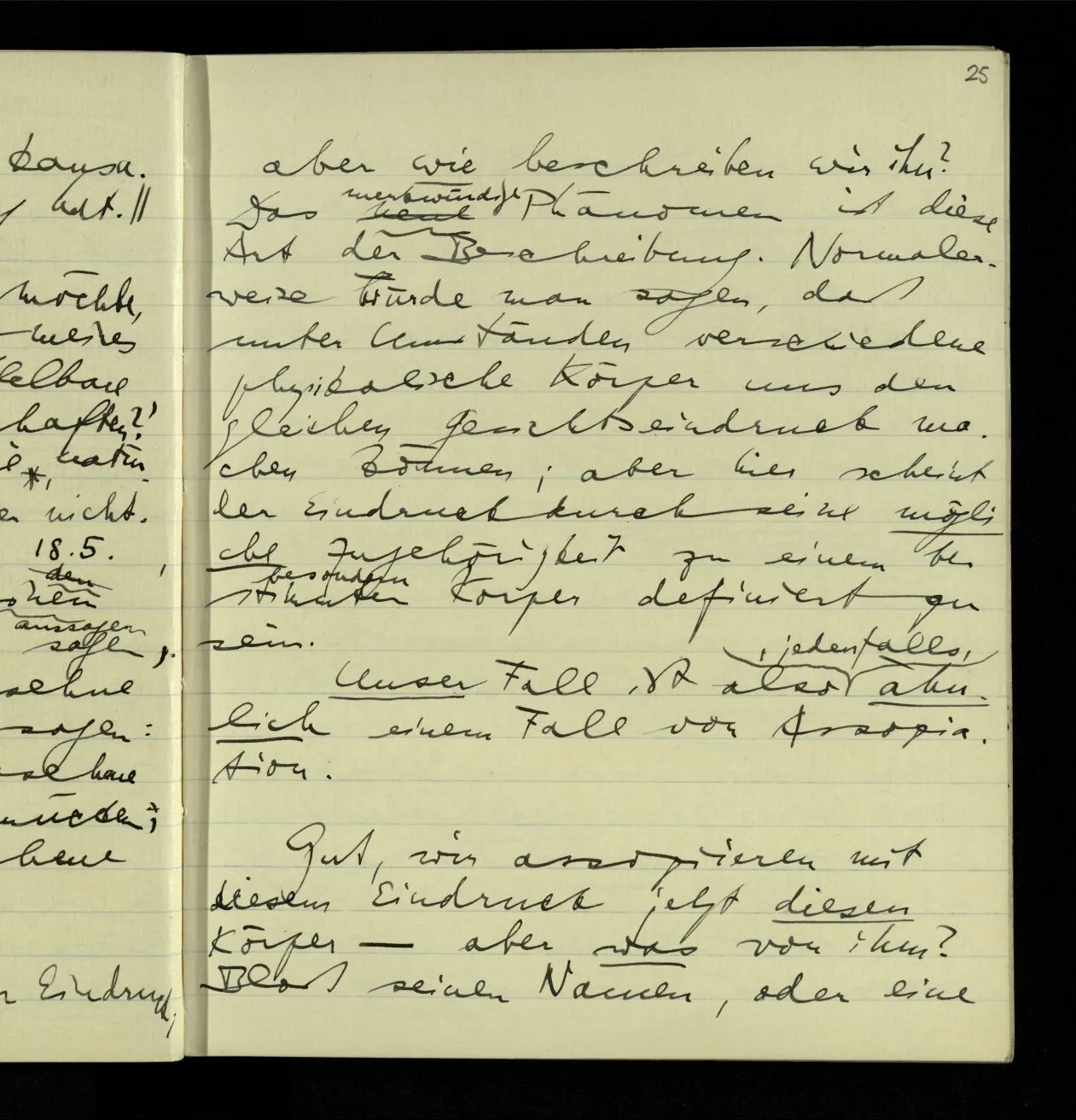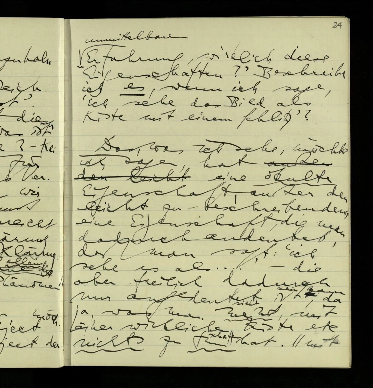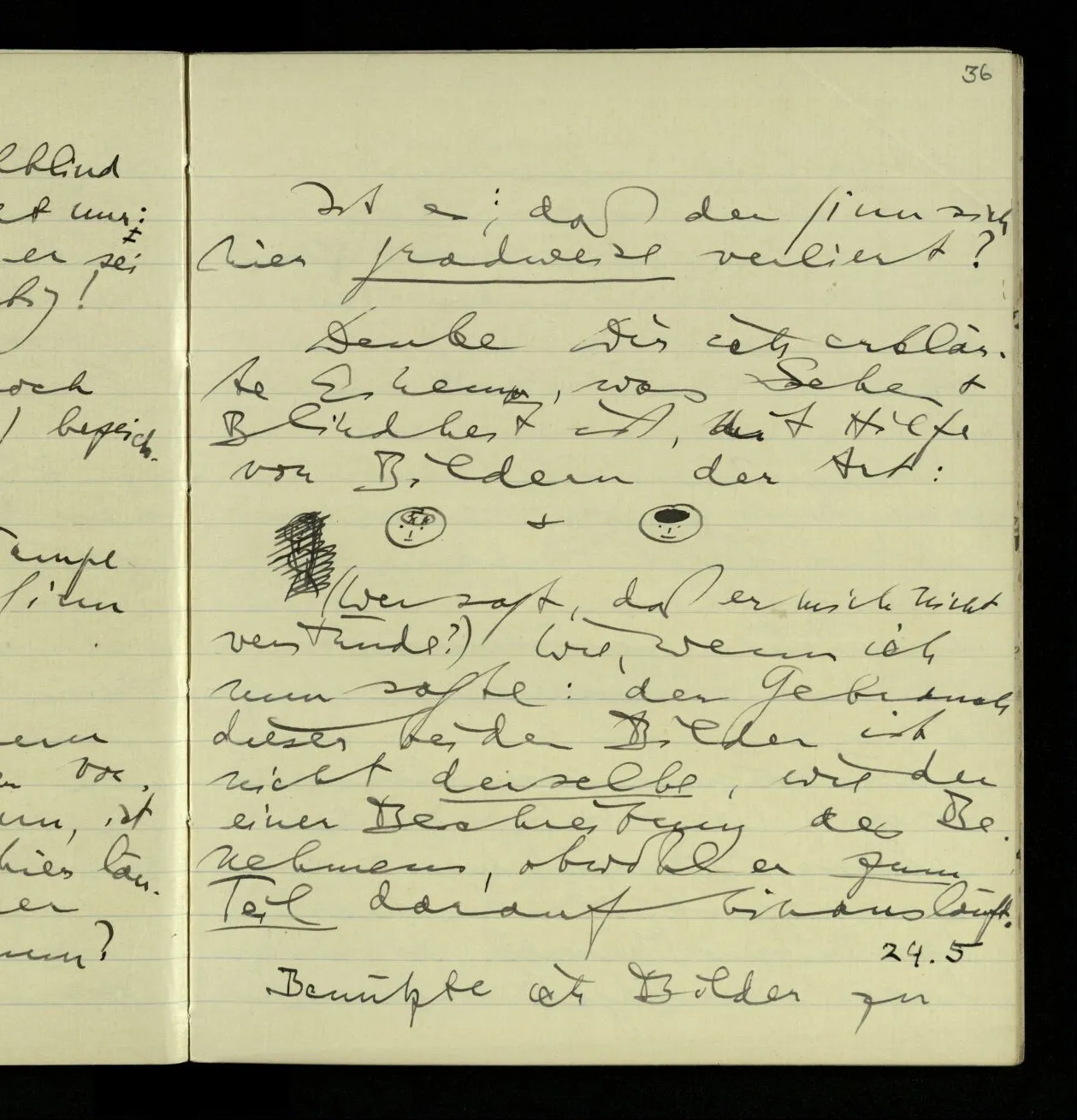 03.06.1941 Der Einwand gegen eine behavioristische Ausdrucksweise für die Sätze der unmittelbaren Erfahrung ist nicht, daß dieser Ausdruck nicht von Erfahrungen sondern von etwas anderm handeln würde. Sondern, daß wir tatsächlich ein anderes, einigermaßen anderes, Spiel mit den Ausdrücken der Erlebnisse spielen, als mit den Beschreibungen des Benehmens. – Nicht das ist ein Einwand, daß die Ausdrucksweise vom äußern Benehmen handelt, denn wovon sie ‘handelt’ zeigt sich nicht unbedingt in den Ausdrücken & ihren ostensiven Definitionen, sondern im System des Gebrauchs der Ausdrücke. Wenn Einer besorgt sagt: “Er stöhnt fürchterlich”, so kann man sagen, er rede nicht vom Benehmen.