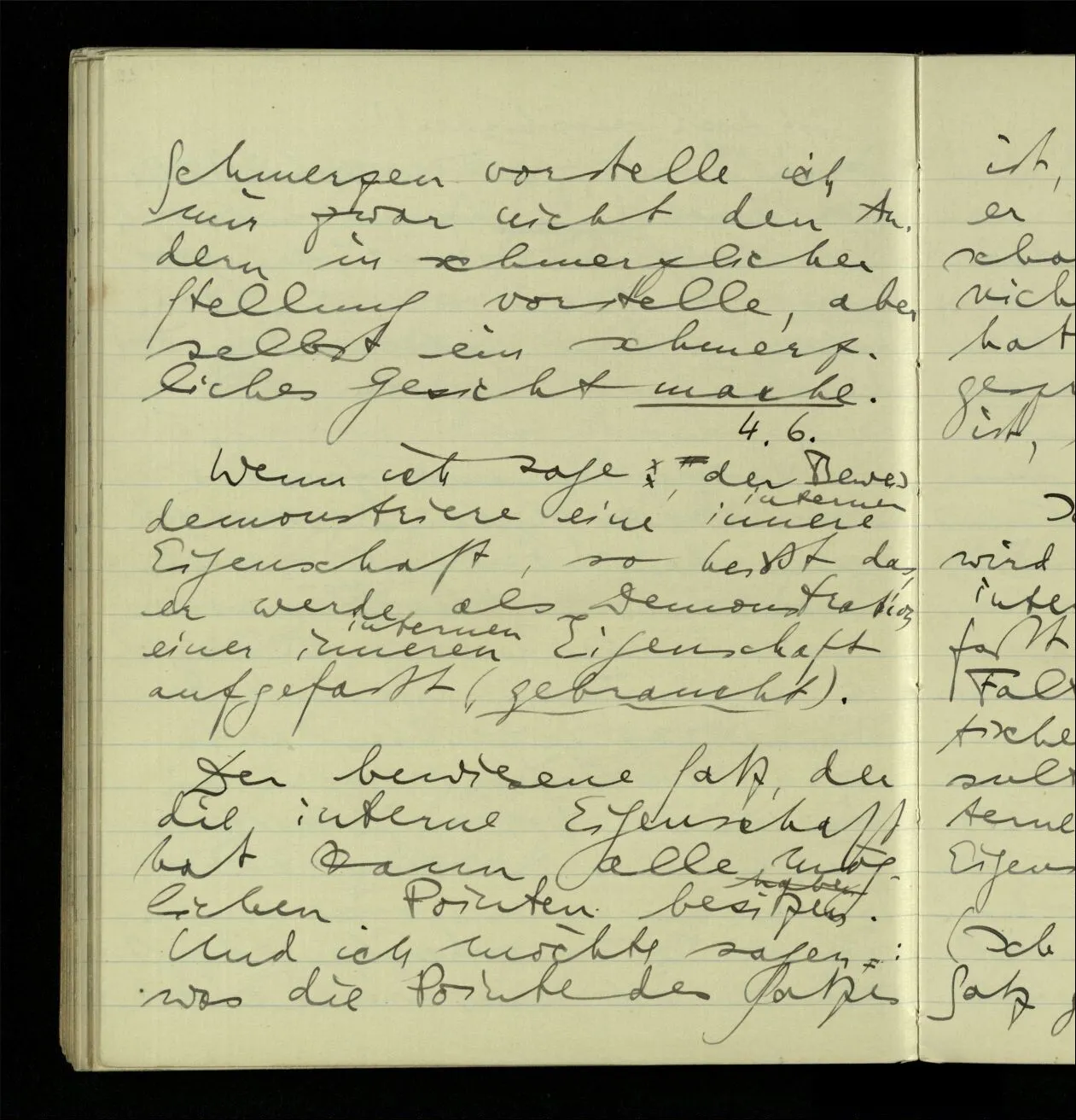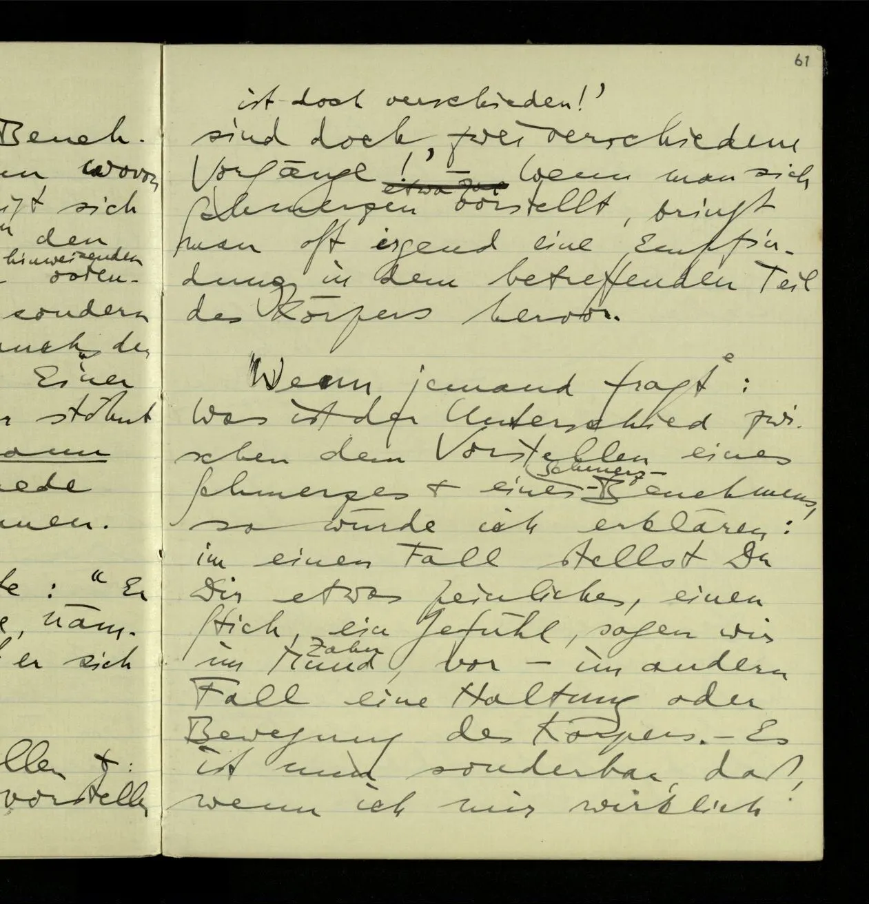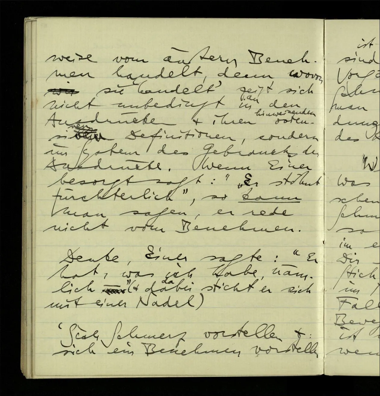 Wenn jemand fragt: Was ist der Unterschied zwischen dem Vorstellen eines Schmerzes & eines Benehmens, so würde ich erklären: im einen Fall stellst Du Dir etwas Peinliches, einen Stich, ein Gefühl, sagen wir im Mund, vor – im andern Fall eine Haltung oder Bewegung des Körpers. – Es ist nun sonderbar, daß, wenn ich mir wirklich Schmerzen vorstelle ich mir zwar nicht den Andern in schmerzlicher Stellung vorstelle, aber selbst ein schmerzliches Gesicht mache.