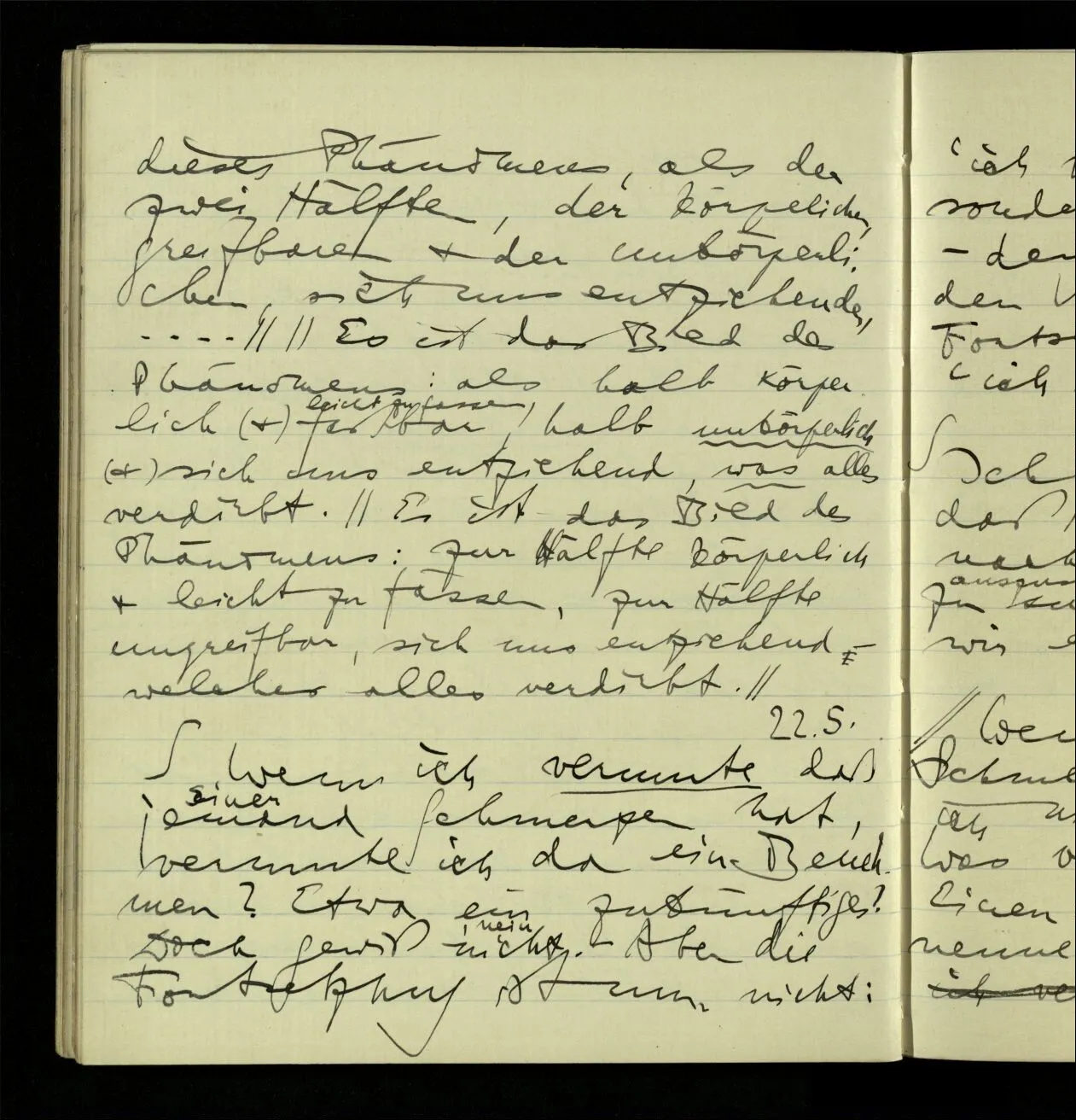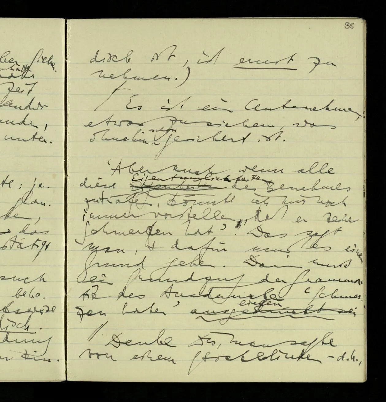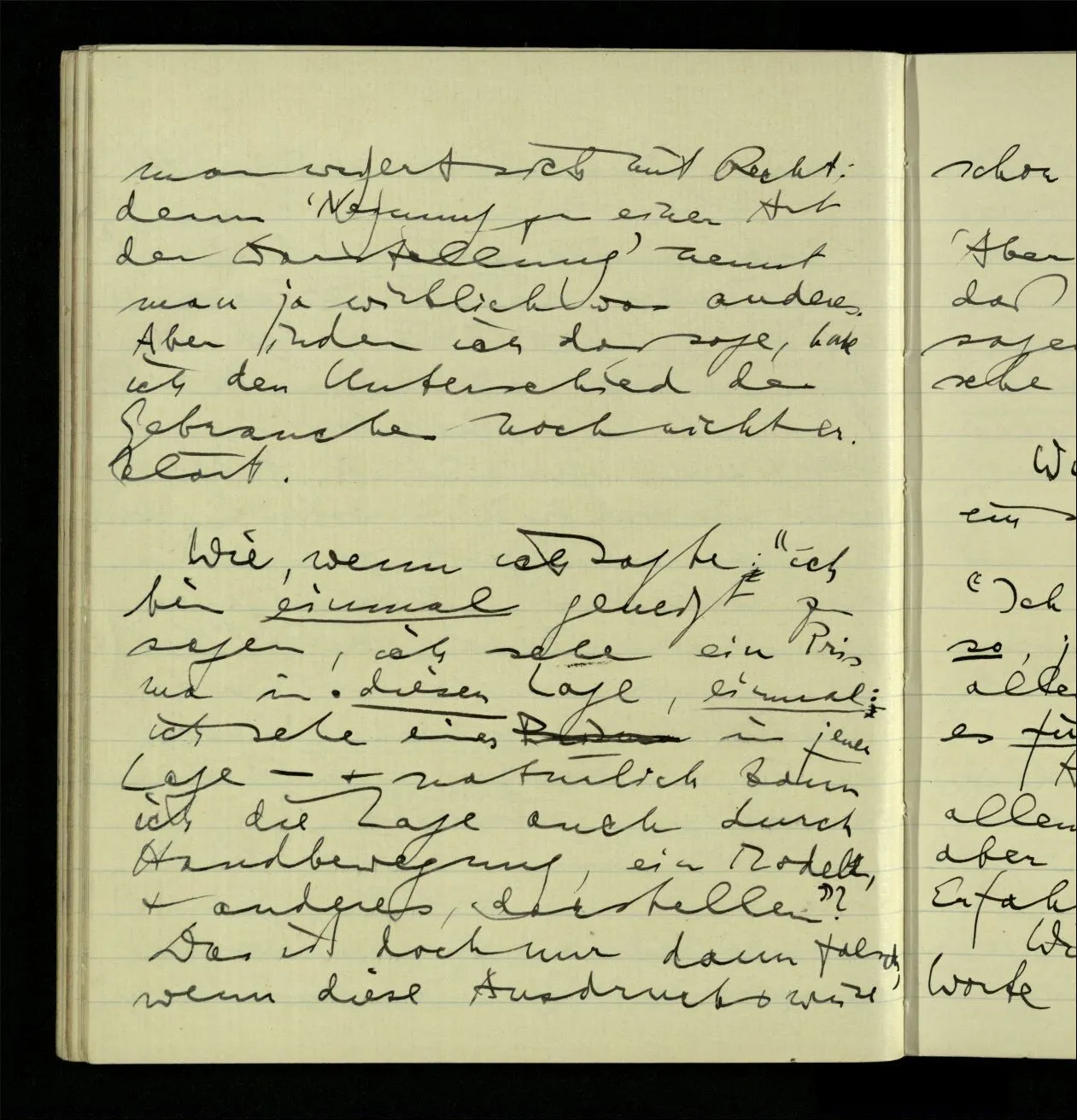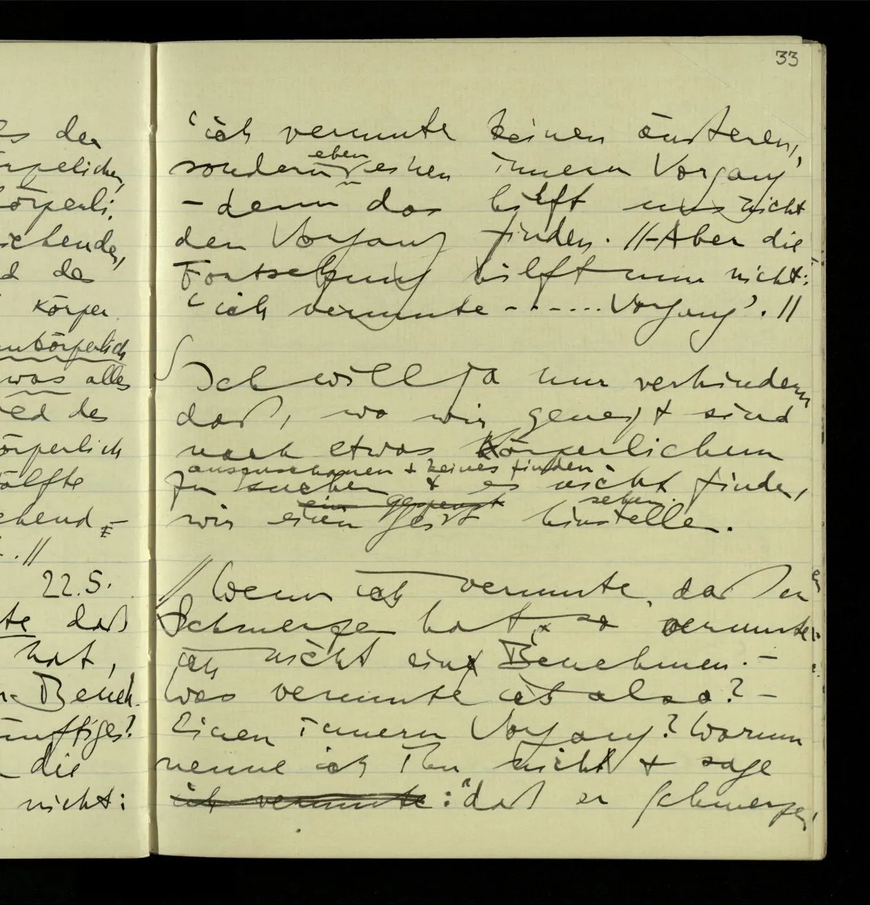 Wenn jemand fragt: Was ist der Unterschied zwischen dem Vorstellen eines Schmerzes & eines Benehmens, so würde ich erklären: im einen Fall stellst Du Dir etwas Peinliches, einen Stich, ein Gefühl, sagen wir im Mund, vor – im andern Fall eine Haltung oder Bewegung des Körpers. – Es ist nun sonderbar, daß, wenn ich mir wirklich Schmerzen vorstelle ich mir zwar nicht den Andern in schmerzlicher Stellung vorstelle, aber selbst ein schmerzliches Gesicht mache.
