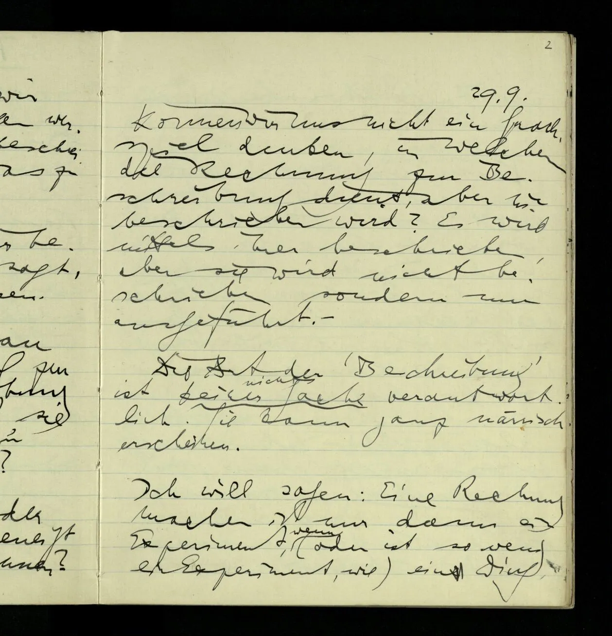 29.09.1940 Können wir uns nicht ein Sprachspiel denken, in welchem die Rechnung zur Beschreibung dient, aber nie beschrieben wird? Es wird mittels ihrer beschrieben, aber sie wird nicht beschrieben sondern nur ausgeführt. –