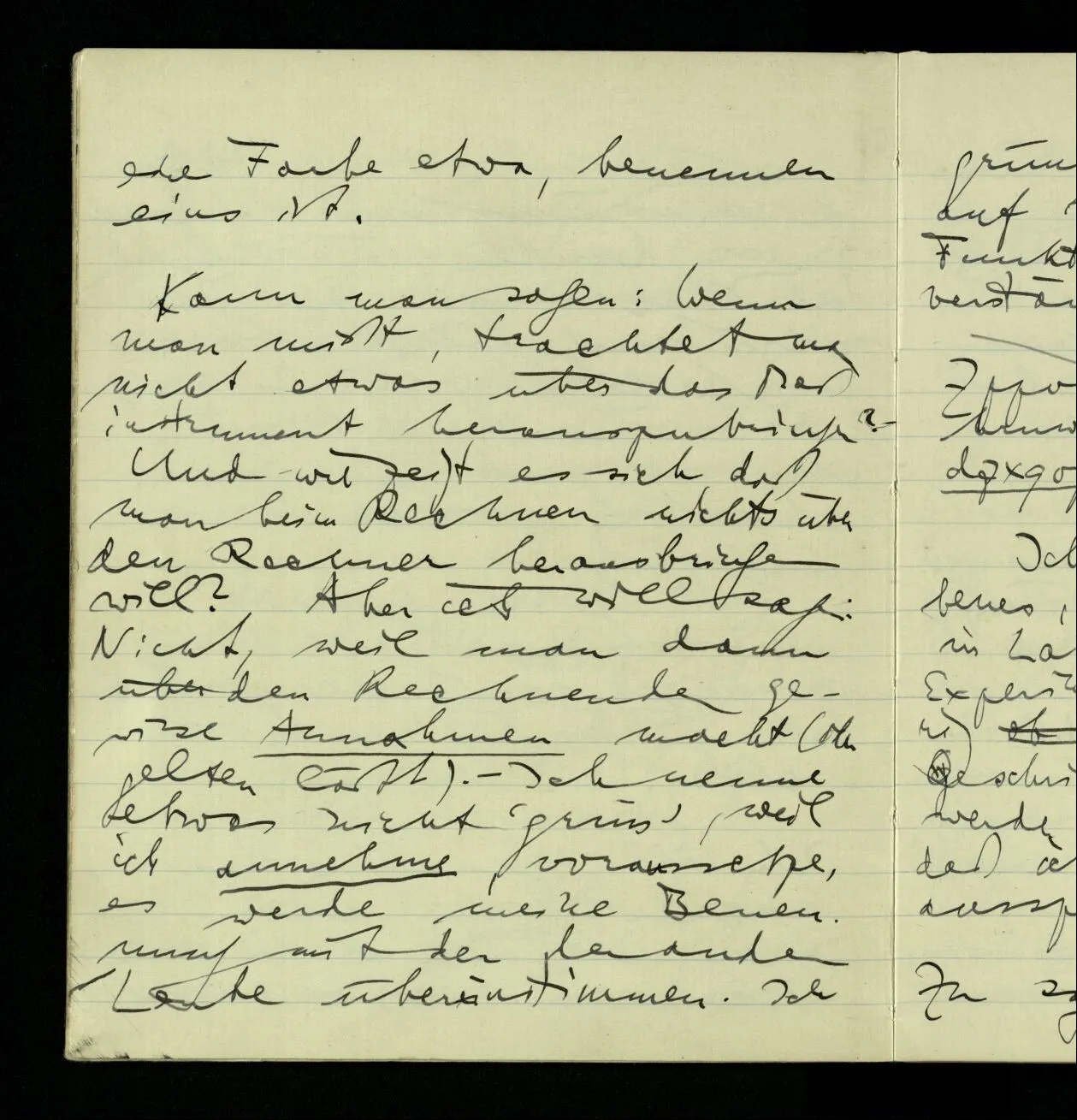 Kann man sagen: Wenn man mißt, trachtet man nicht etwas über das Meßinstrument herauszubringen? – Und wie zeigt es sich, daß man beim Rechnen nichts über den Rechner herausbringen will? Aber ich will sagen: Nicht, weil man dann über den Rechnenden gewisse Annahmen macht (oder gelten läßt). – Ich nenne etwas nicht ‘grün’, weil ich annehme, voraussetze, es werde meine Benennung mit der der andern Leute übereinstimmen. Ich gründe mein Urteil nicht auf Annahmen über das Funktionieren der Sprache.