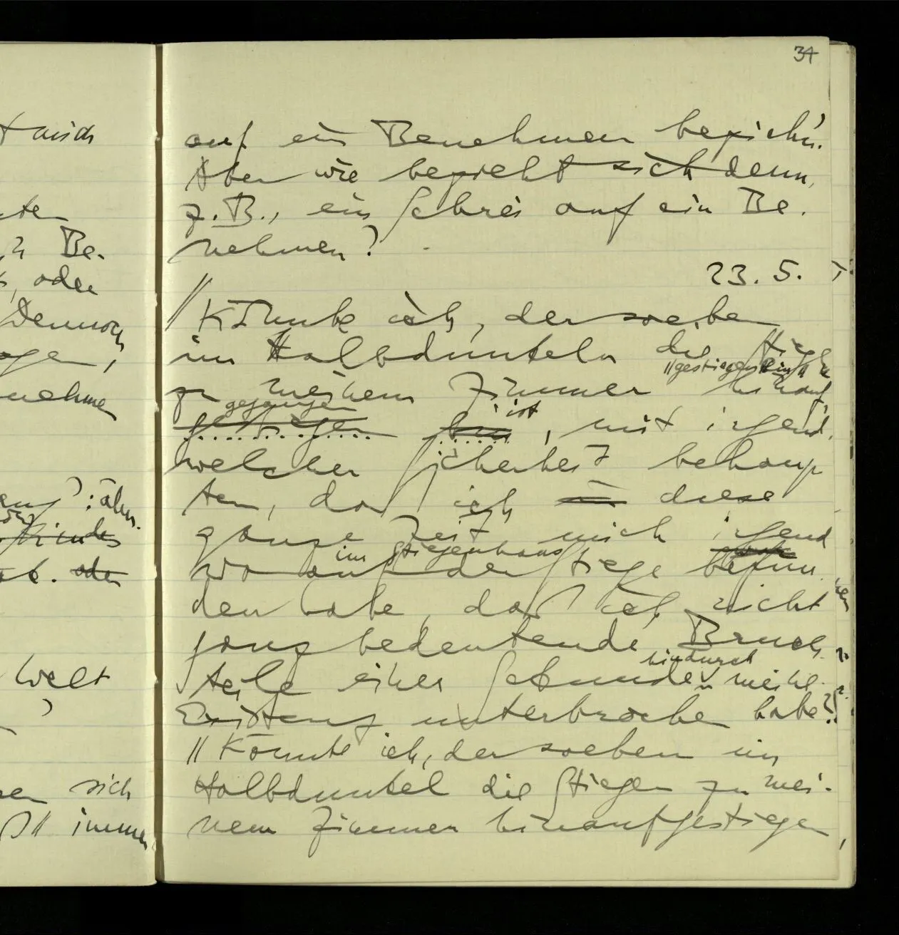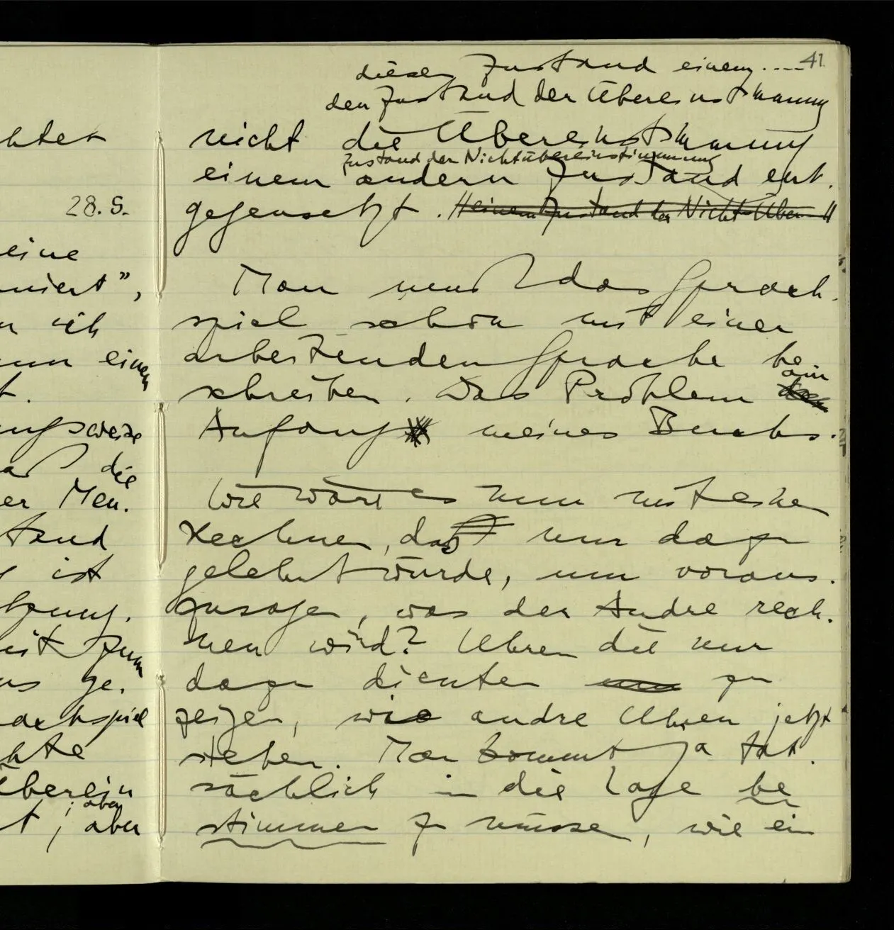 Seit etwa 6 Monaten ist mein Leben höchst unbefriedigend. Seit über 6 Monaten stockt meine Arbeit & mein Kopf ist meist öde, außer daß er manchmal mit sehr allgemeinen Ideen gefüllt ist. Ich fühle mich gesundheitlich & geistig gealtert. Ich möchte gern irgend etwas aufschreiben: über mich, oder über Anderes. – Durch meine Unfähigkeit zu arbeiten ist meine Stellung hier für mich eine schiefe geworden (nicht, daß ich irgendwen darauf aufmerksam gemacht hätte), aber ich bin in mir selbst unklar, was ich machen soll; ob meine Stellung aufgeben & eine andere Art Arbeit zu machen trachten. Mein Leben läuft in eine Wüste.