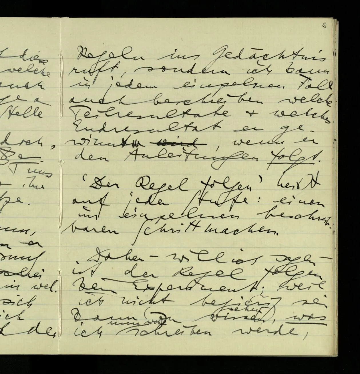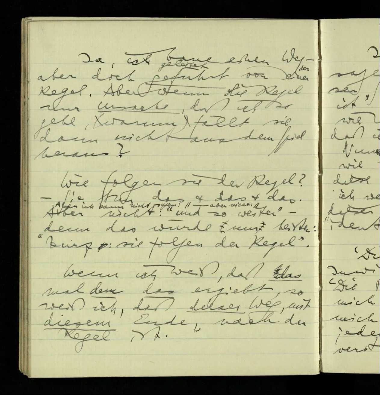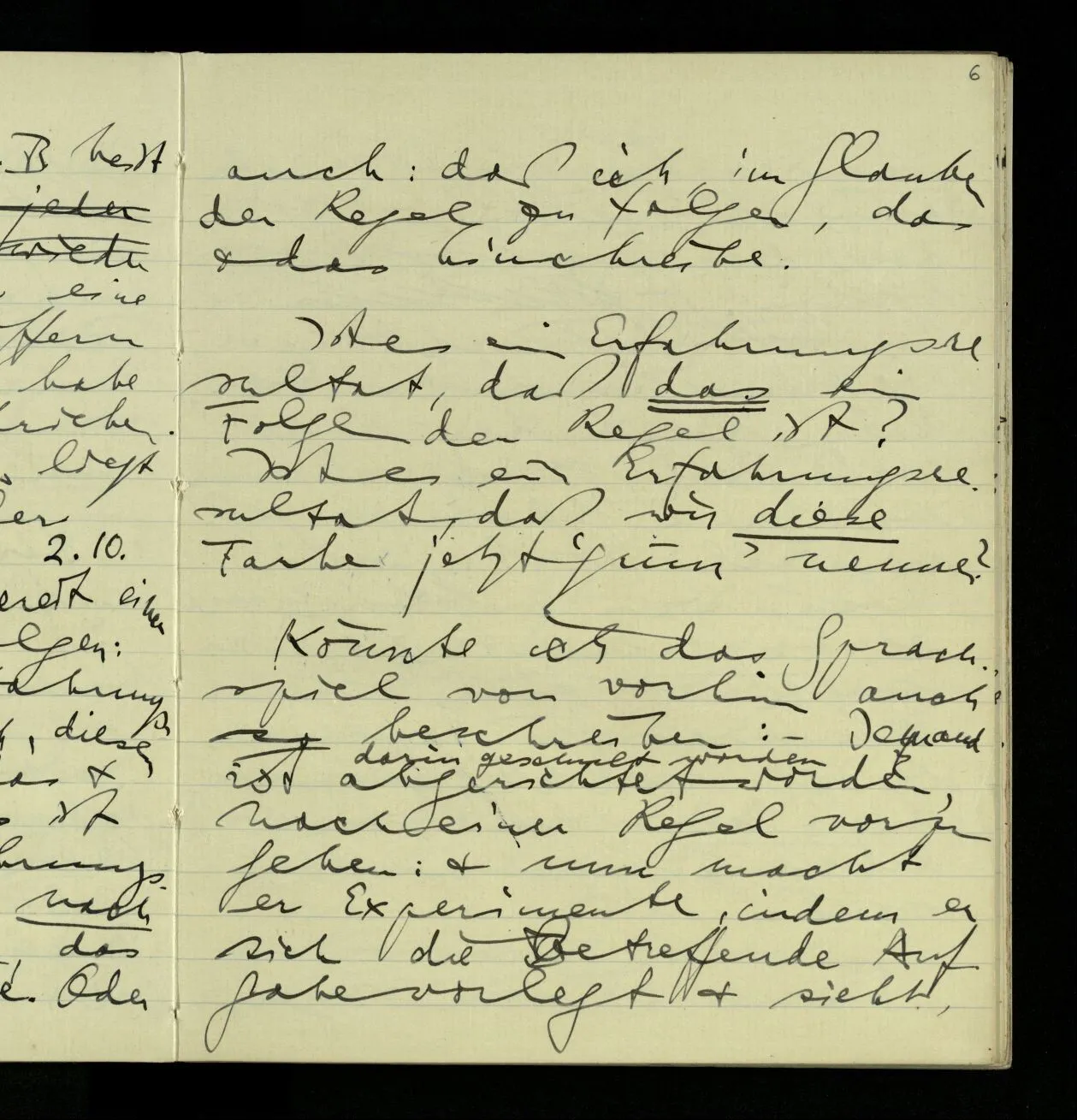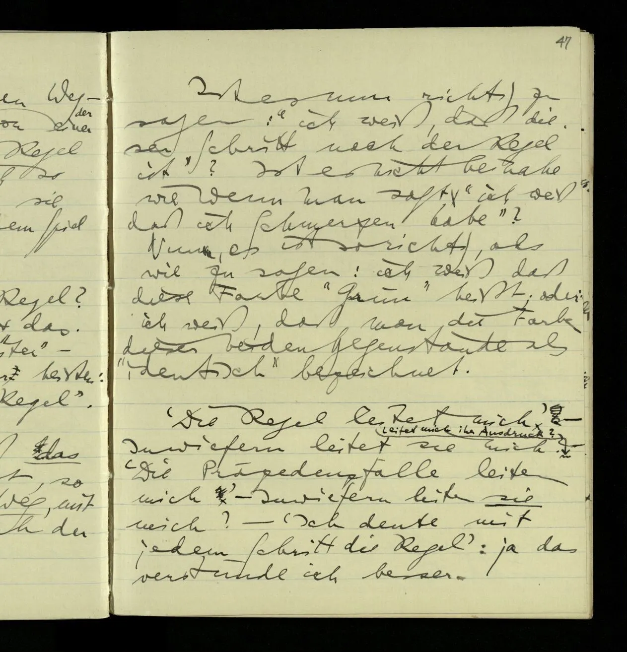 02.10.1940 Ich mache mich bereit einer gewissen Regel zu folgen: Ist es nun ein Erfahrungsresultat daß ich, dieser Regel folgend, das & das hinschreibe. Es ist natürlich ein Erfahrungsergebnis, daß ich, nach diesen Vorbereitungen, das & das hinschreibe. Oder auch: daß ich im Glauben der Regel zu folgen, das & das hinschreibe.
