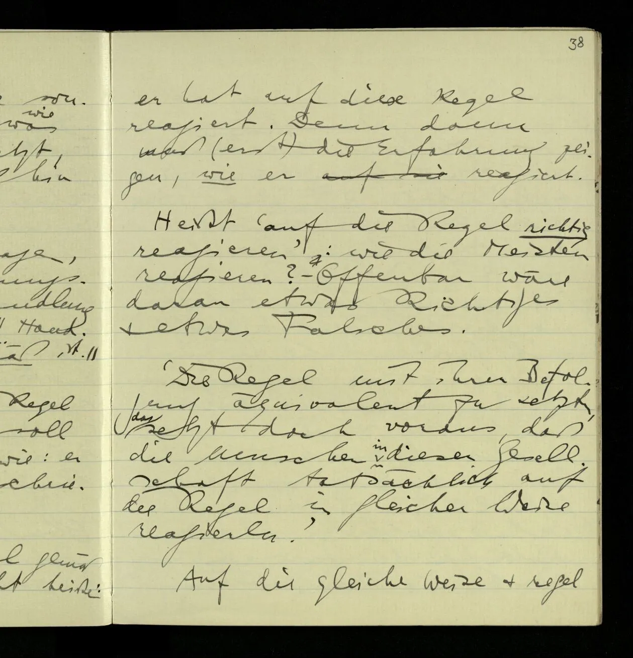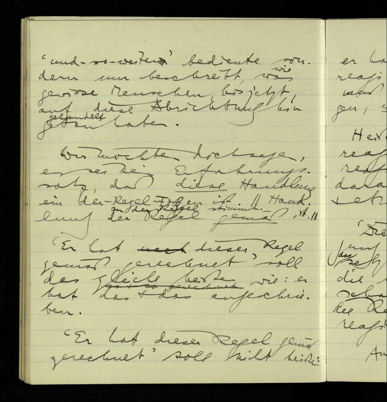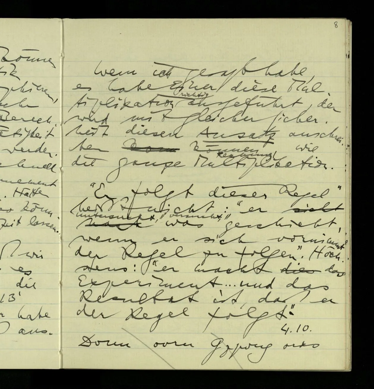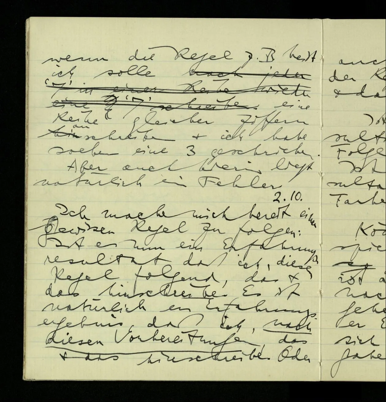 02.10.1940 Ich mache mich bereit einer gewissen Regel zu folgen: Ist es nun ein Erfahrungsresultat daß ich, dieser Regel folgend, das & das hinschreibe. Es ist natürlich ein Erfahrungsergebnis, daß ich, nach diesen Vorbereitungen, das & das hinschreibe. Oder auch: daß ich im Glauben der Regel zu folgen, das & das hinschreibe.