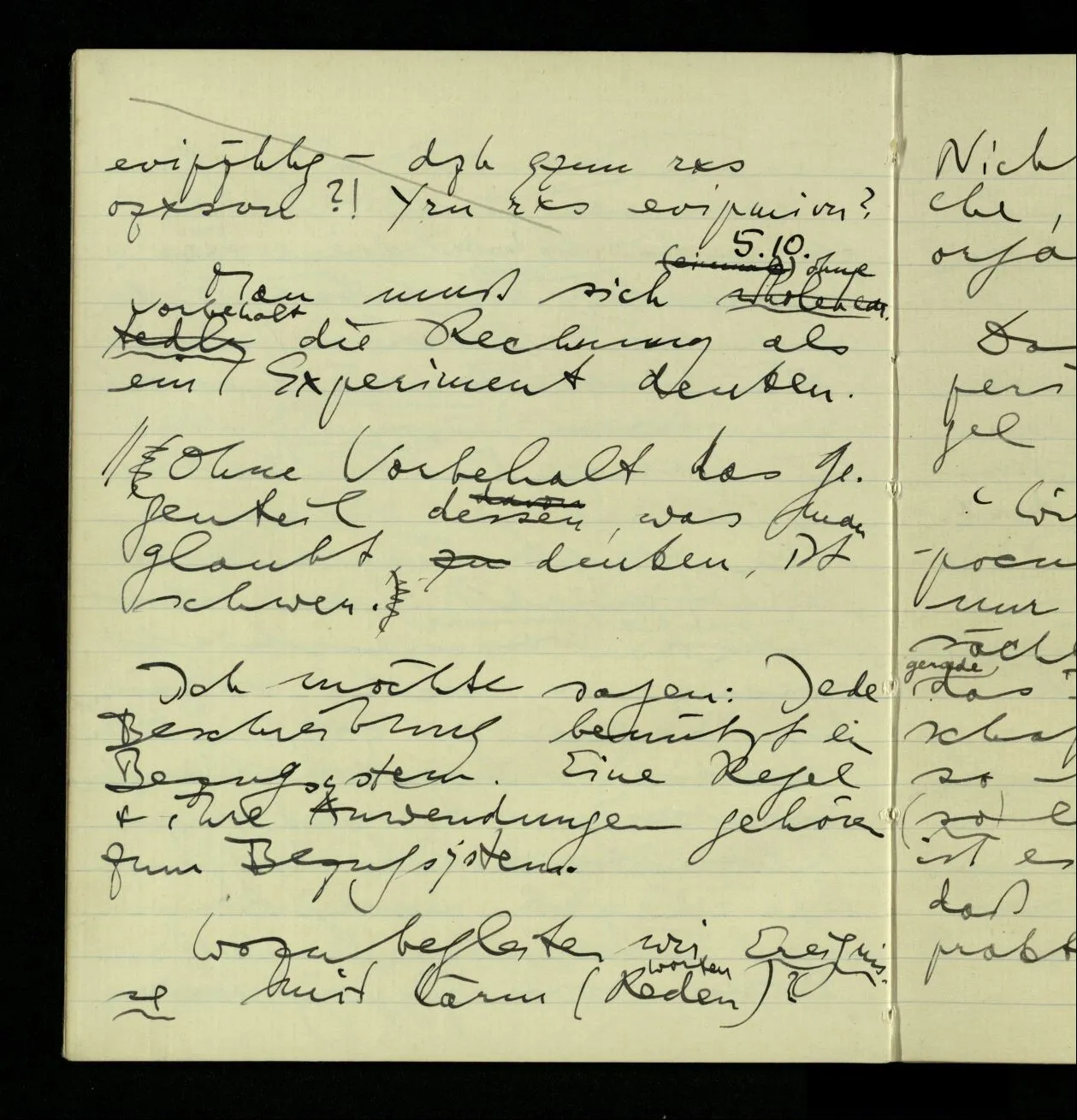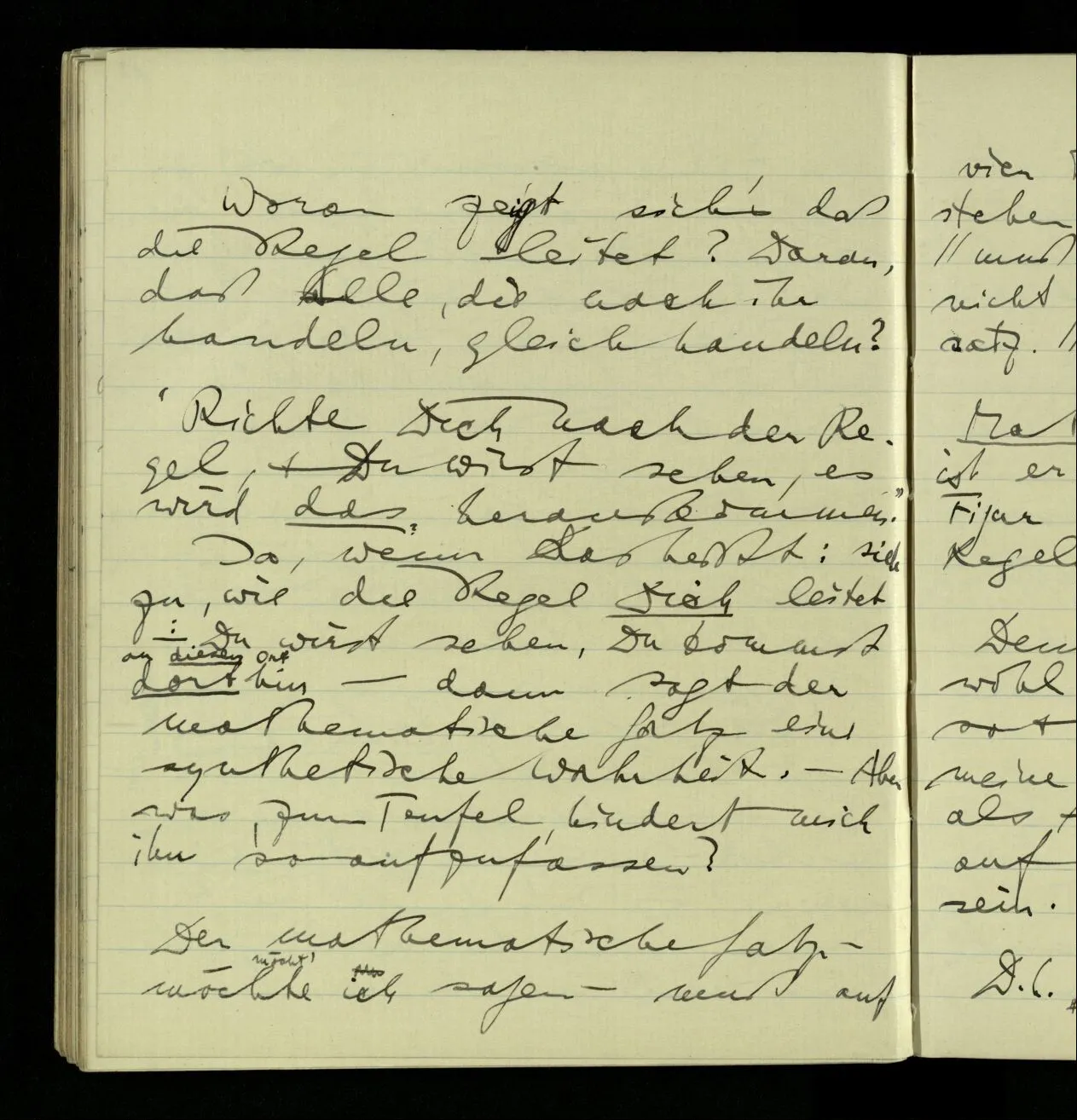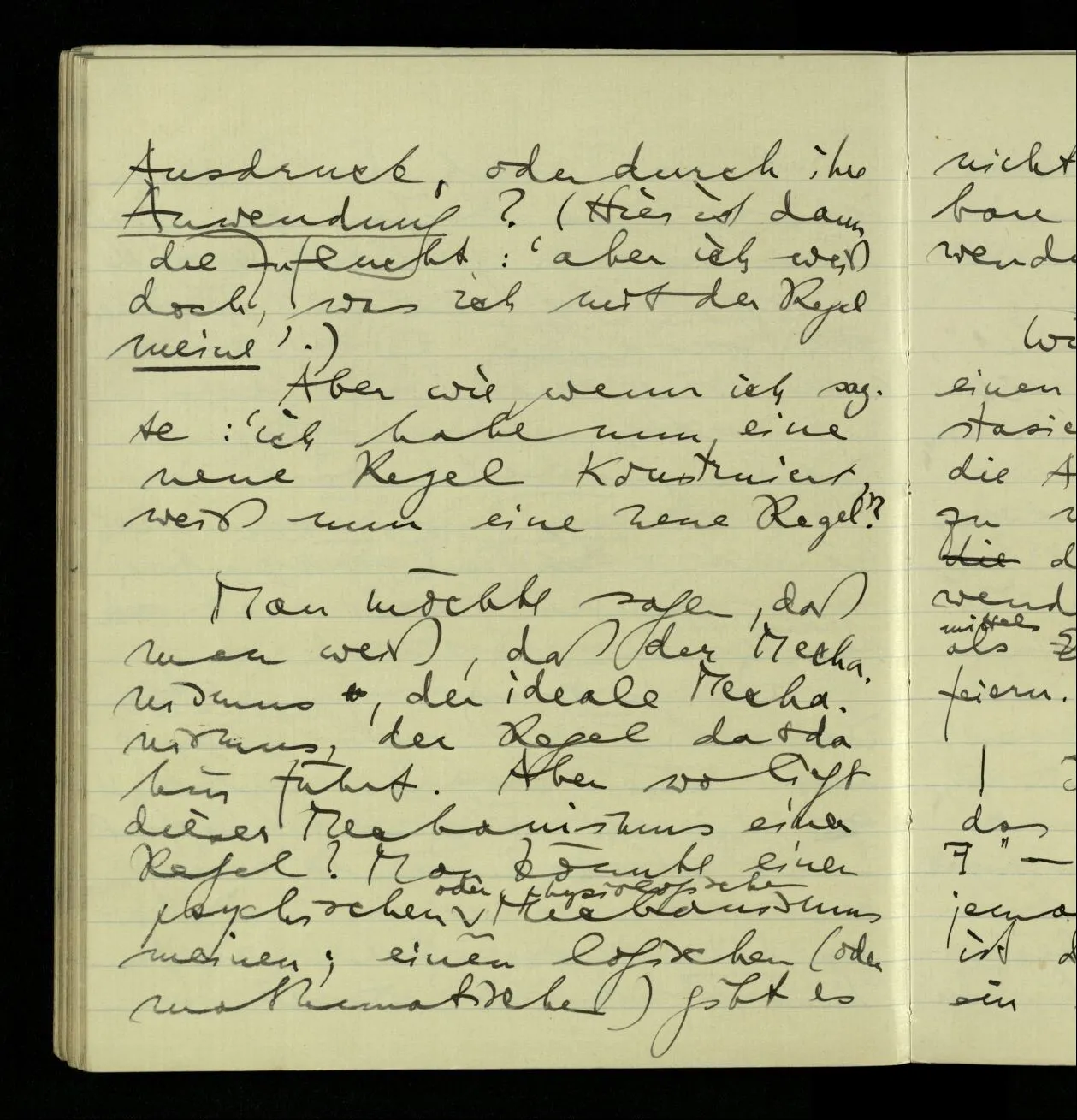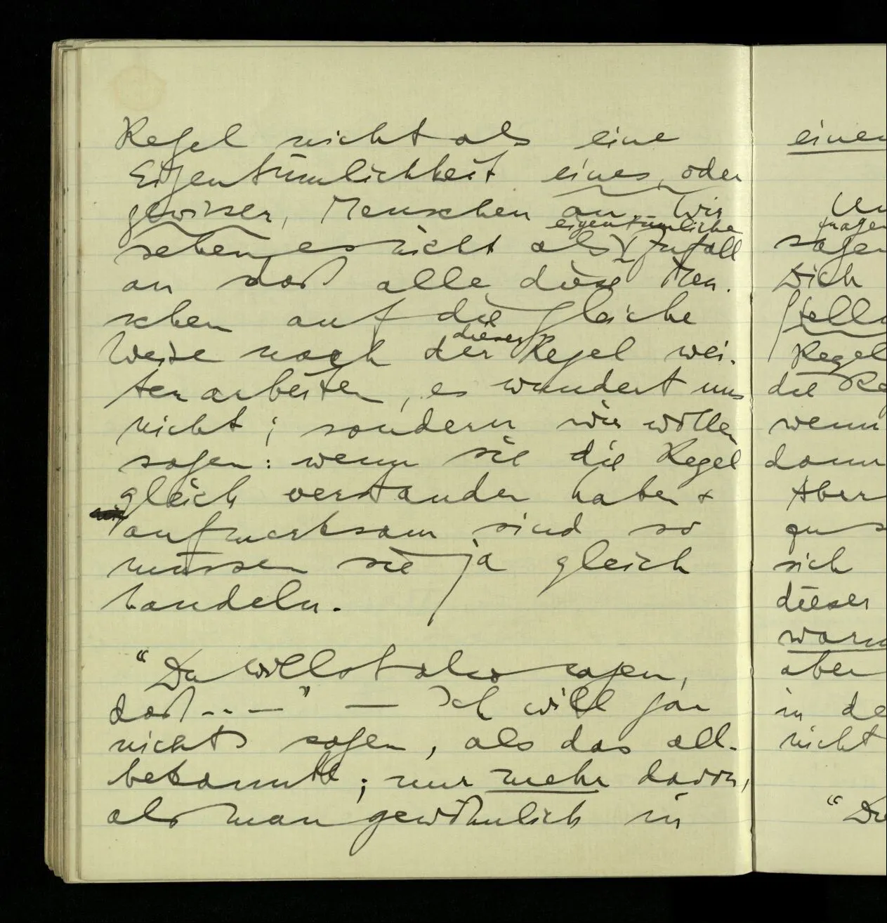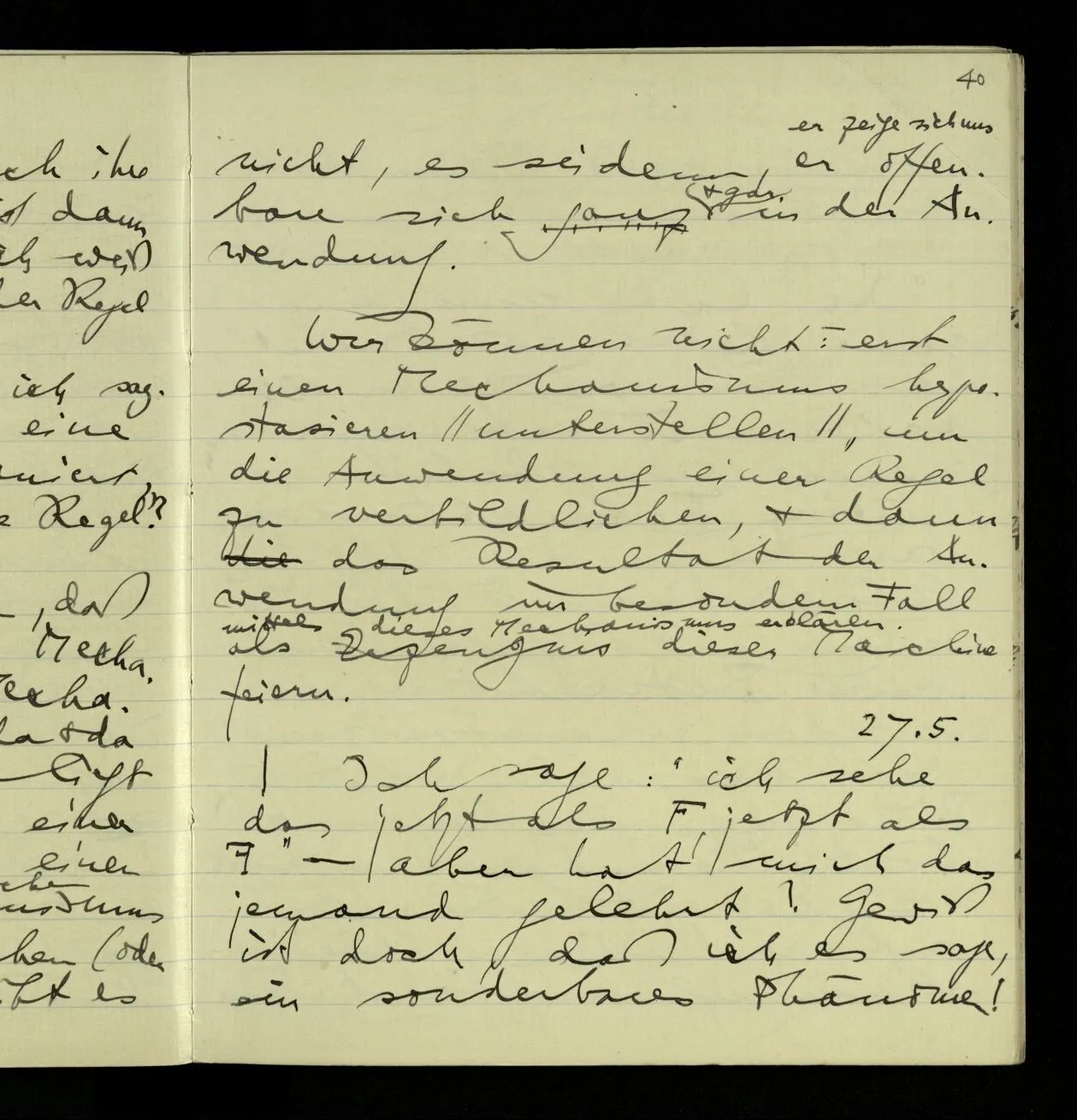 02.10.1940 Ich mache mich bereit einer gewissen Regel zu folgen: Ist es nun ein Erfahrungsresultat daß ich, dieser Regel folgend, das & das hinschreibe. Es ist natürlich ein Erfahrungsergebnis, daß ich, nach diesen Vorbereitungen, das & das hinschreibe. Oder auch: daß ich im Glauben der Regel zu folgen, das & das hinschreibe.