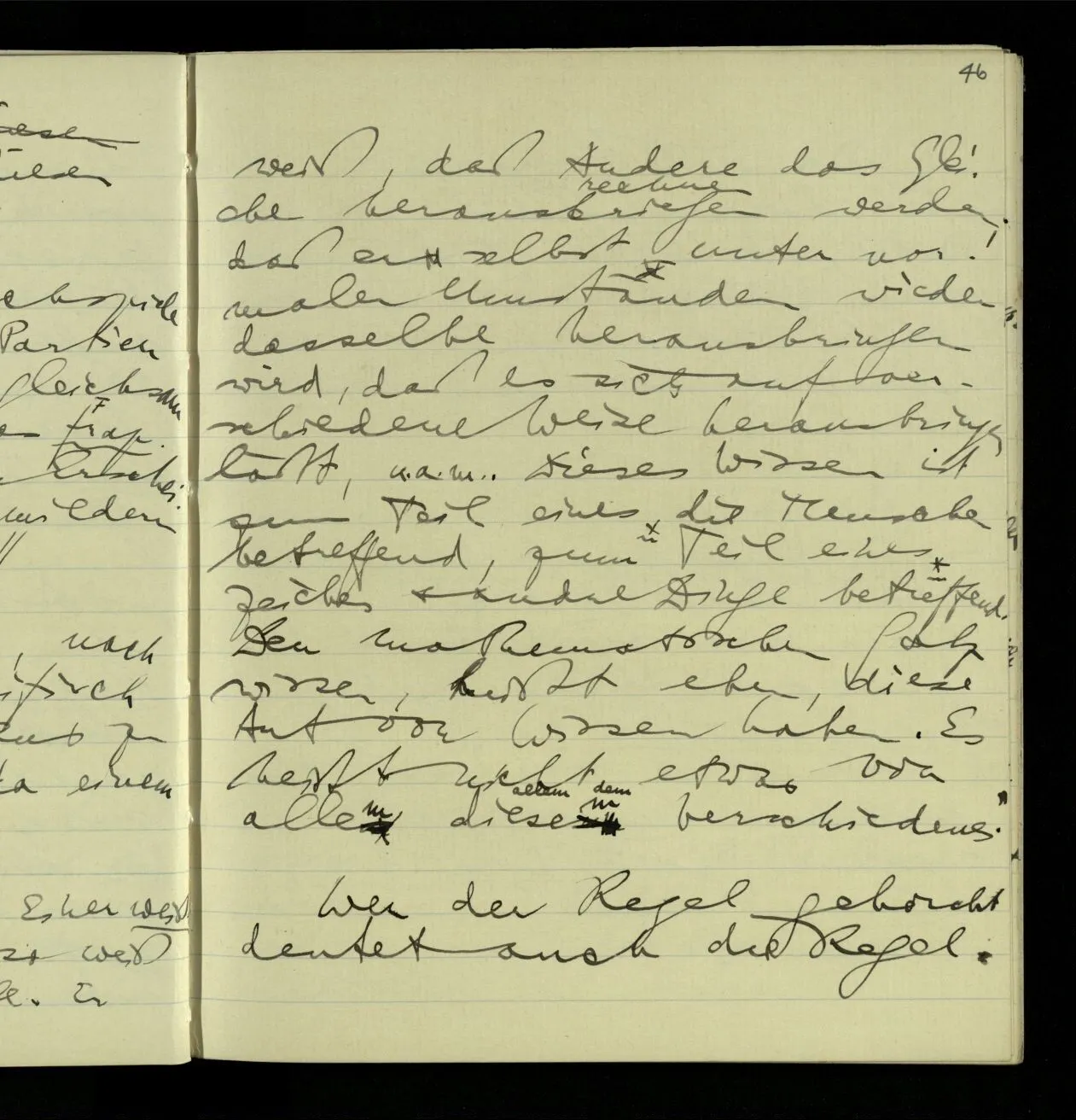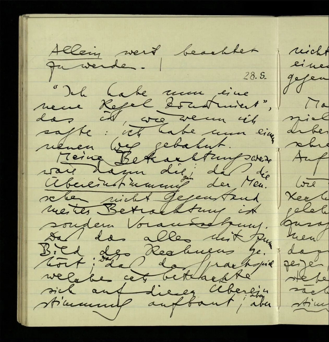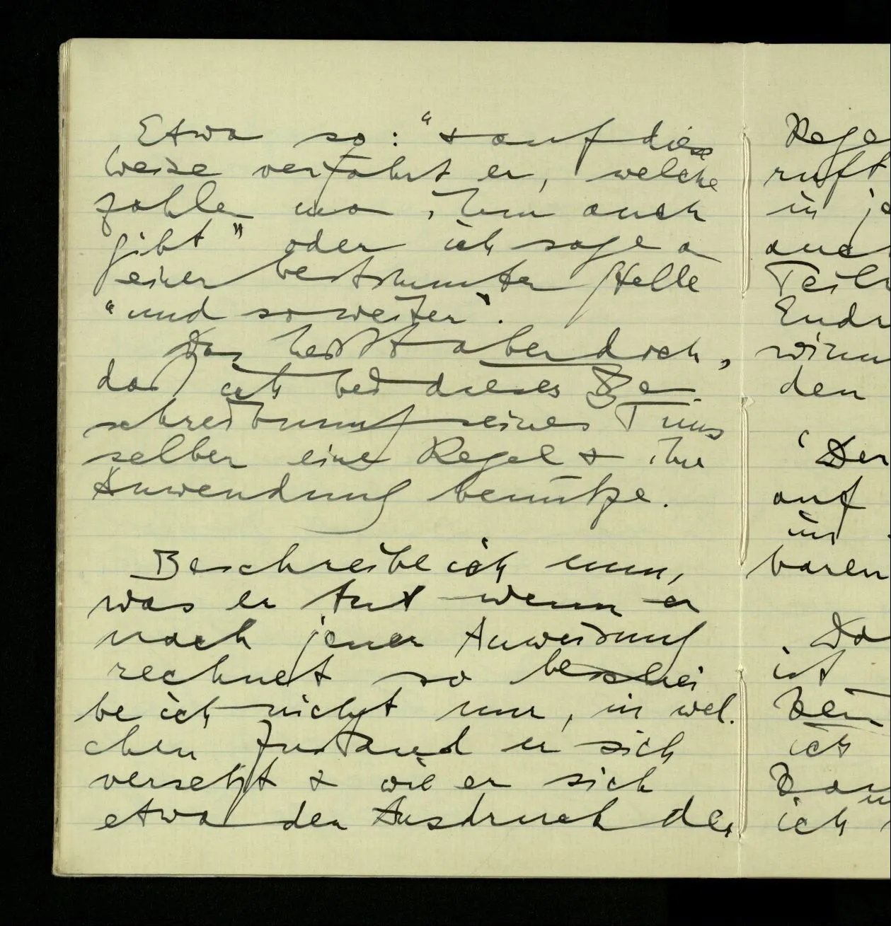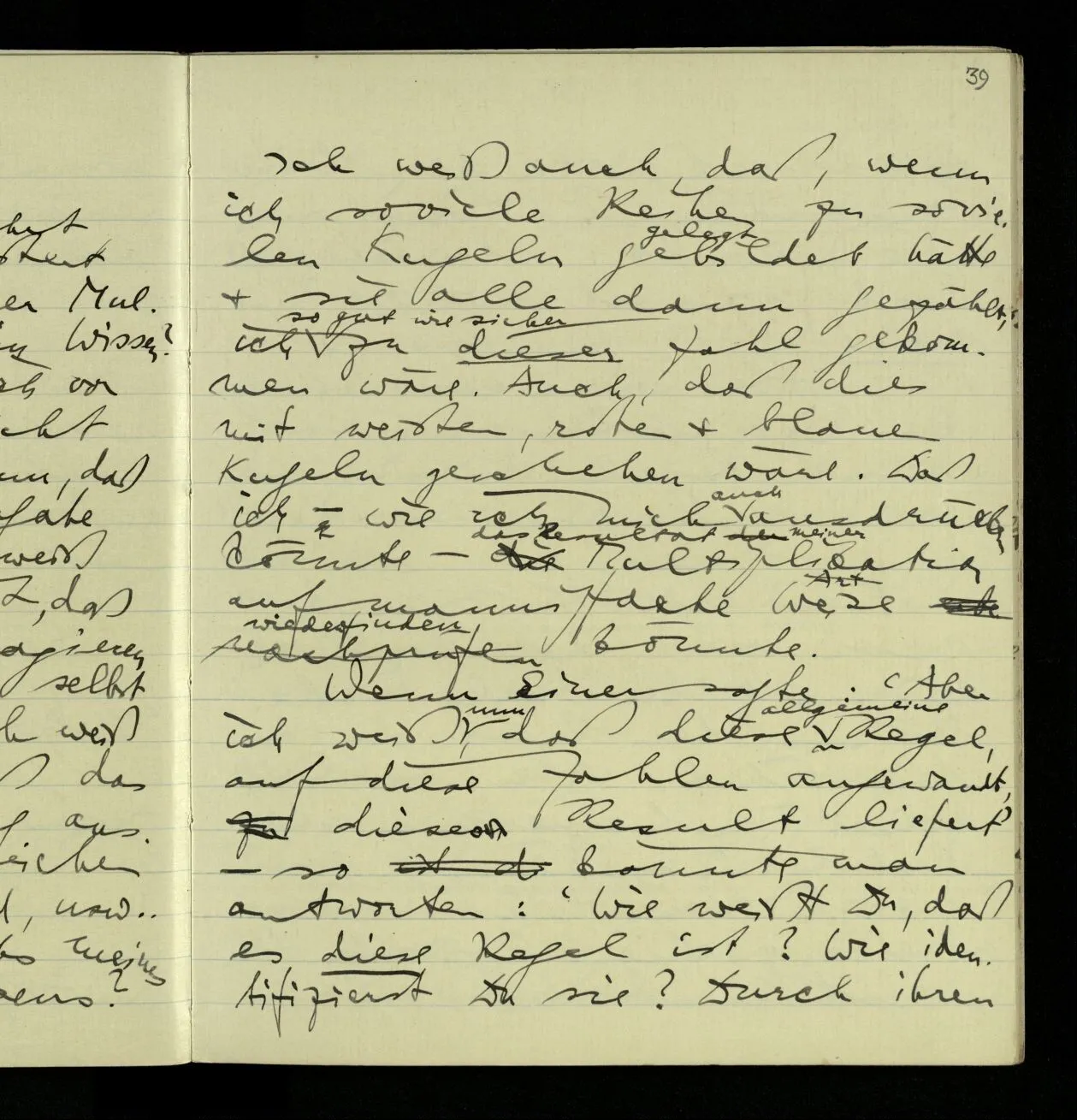 02.10.1940 Ich mache mich bereit einer gewissen Regel zu folgen: Ist es nun ein Erfahrungsresultat daß ich, dieser Regel folgend, das & das hinschreibe. Es ist natürlich ein Erfahrungsergebnis, daß ich, nach diesen Vorbereitungen, das & das hinschreibe. Oder auch: daß ich im Glauben der Regel zu folgen, das & das hinschreibe.