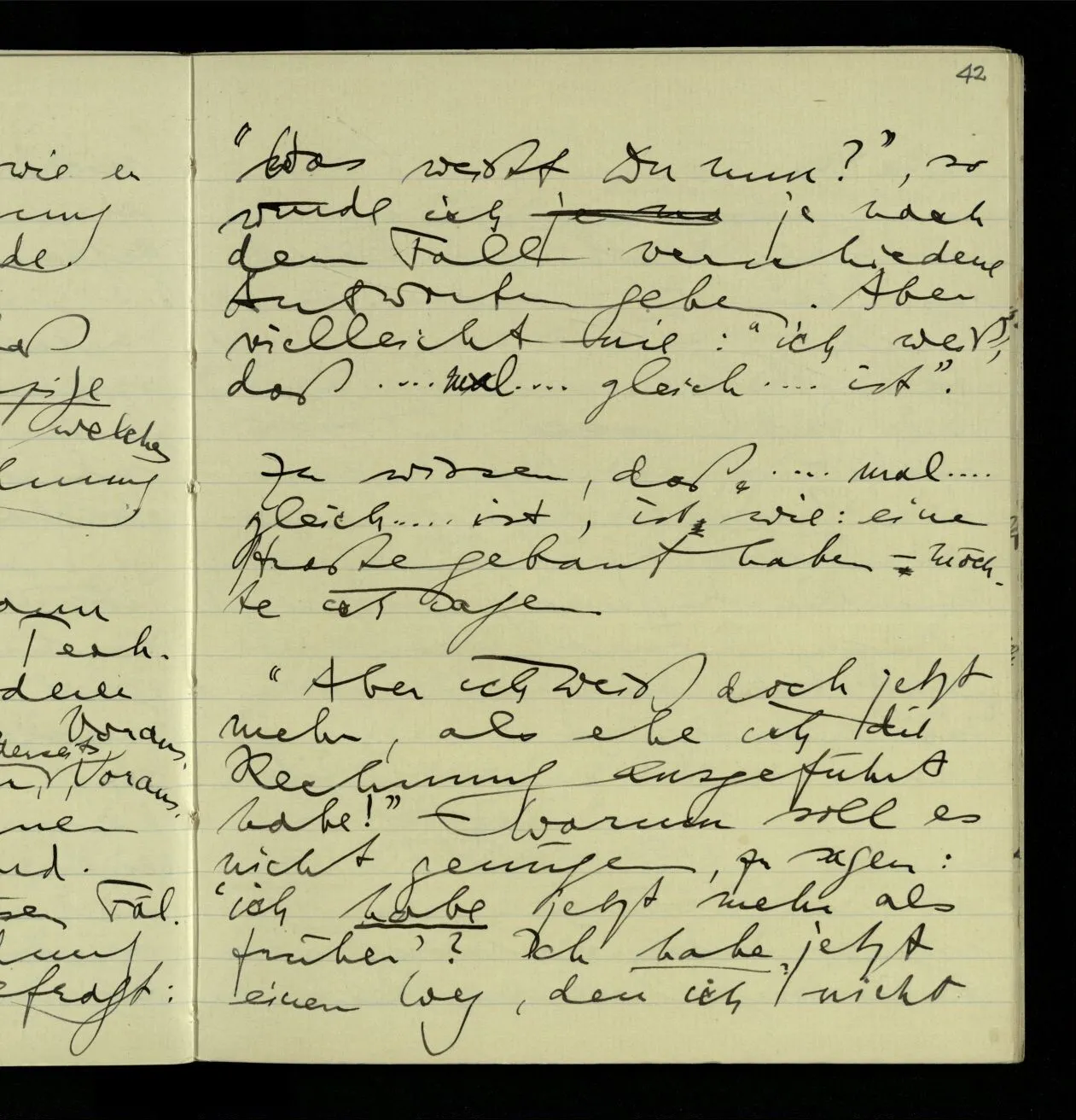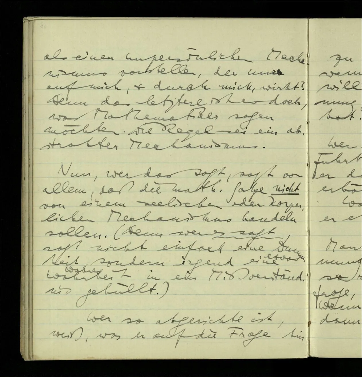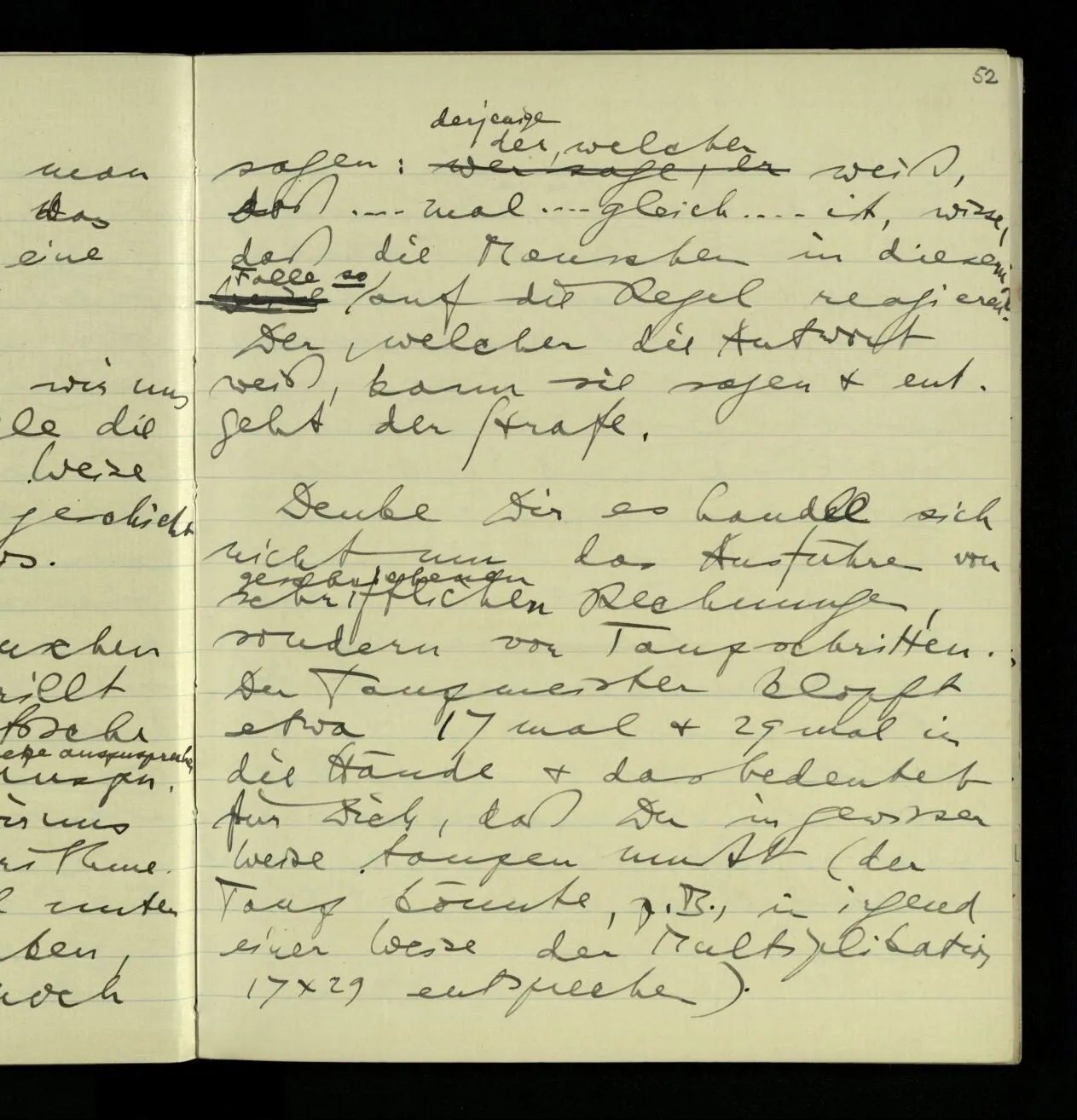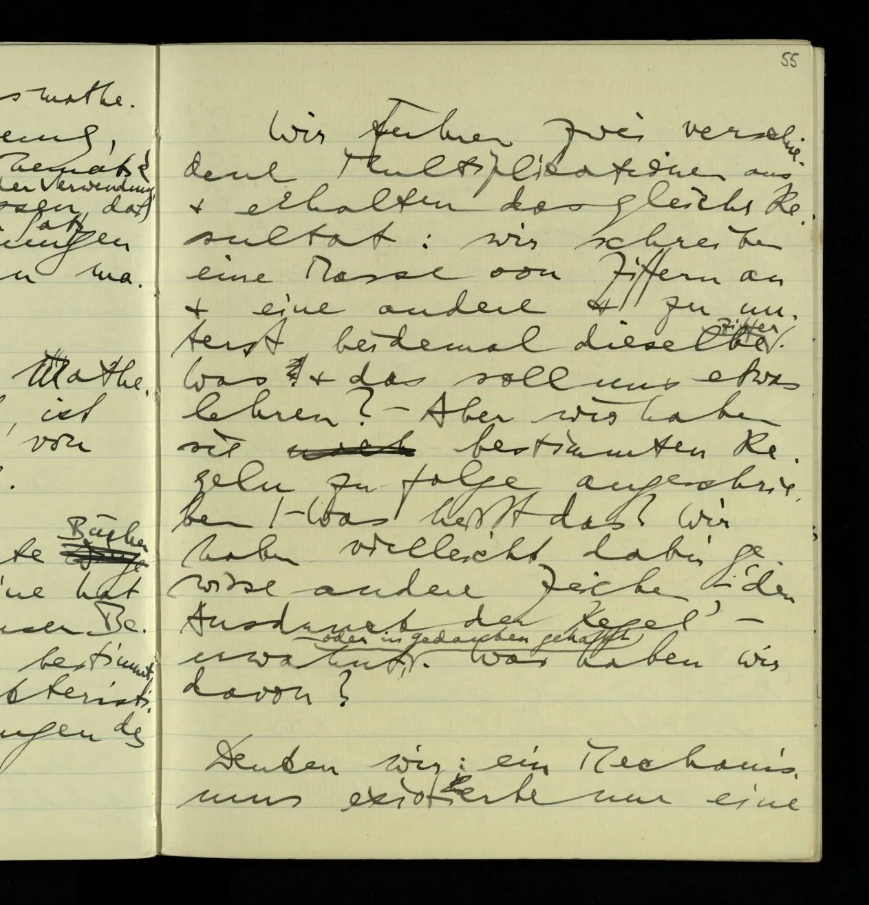 Daß er jetzt so gehandelt hat? daß er wahrscheinlich immer so handeln wird? daß Andre so handeln? – Und hat er auch genügend intensiv an die Regel gedacht? hat er also wirklich nach ihr gehandelt? – Daß das mal dem das ergibt? Aber ist das eine Erklärung des Sinnes von “ergeben”? Oder muß ich mir die Regel als einen unpersönlichen Mechanismus vorstellen, der nur auf mich, & durch mich, wirkt? Denn das letztere ist es doch, was Mathematiker sagen möchten. Die Regel sei ein abstrakter Mechanismus.