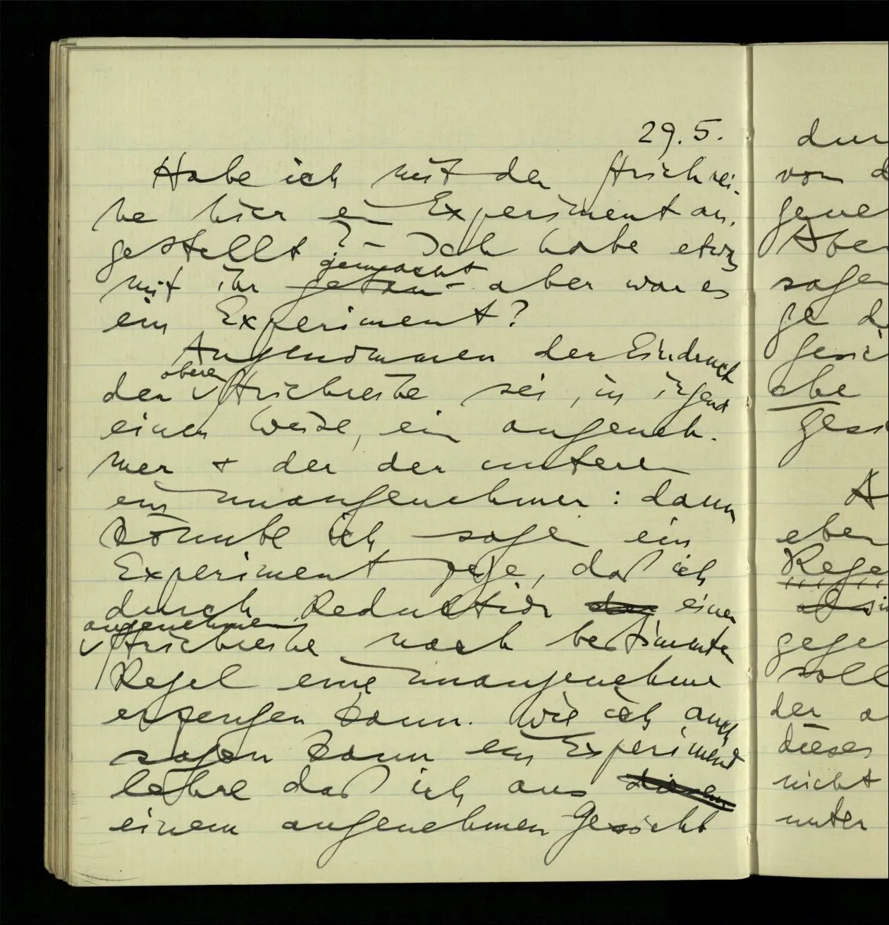 Daher – will ich sagen – ist der Regel folgen kein Experiment; weil ich nicht begierig sein kann (zu wissen), was ich nun wohl schreiben werde, wenn die Regel z.B. heißt ich solle eine Reihe gleicher Ziffern anschreiben & ich habe soeben eine 3 geschrieben. Aber auch hierin liegt natürlich ein Fehler.