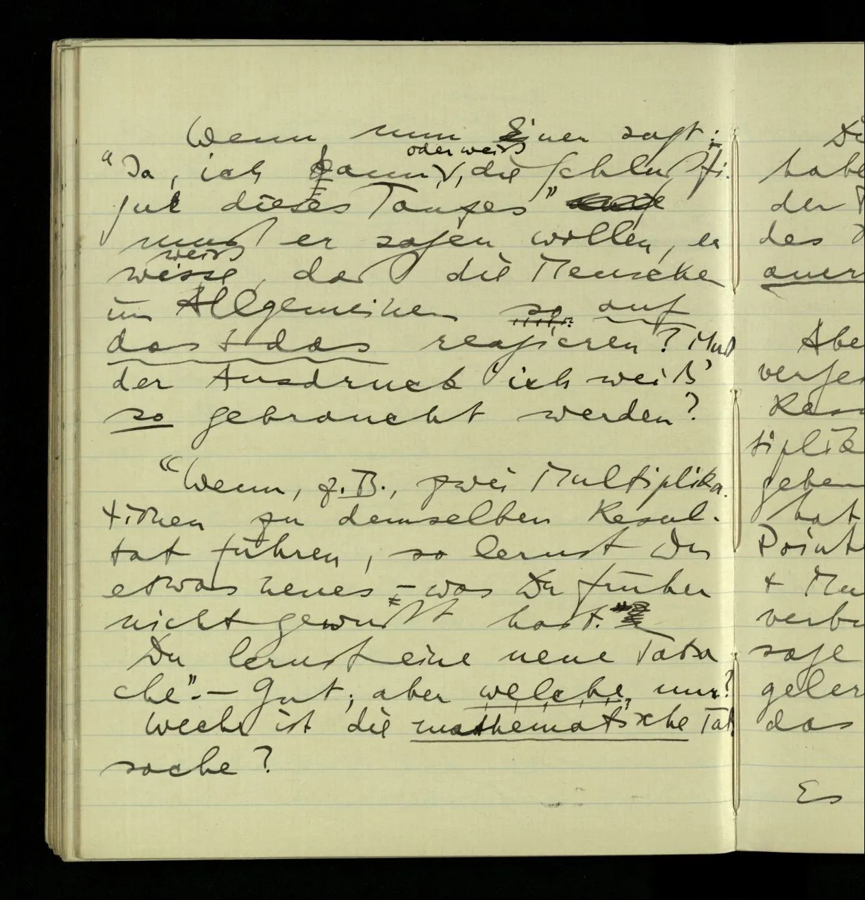 In jenem Sprachspiel – warum soll ich nicht sagen, daß der, welcher multiplizieren gelernt hat & dann eine Multiplikation ausführt, durch sie eine neue Tatsache gelernt habe? Und doch – welche ist es?