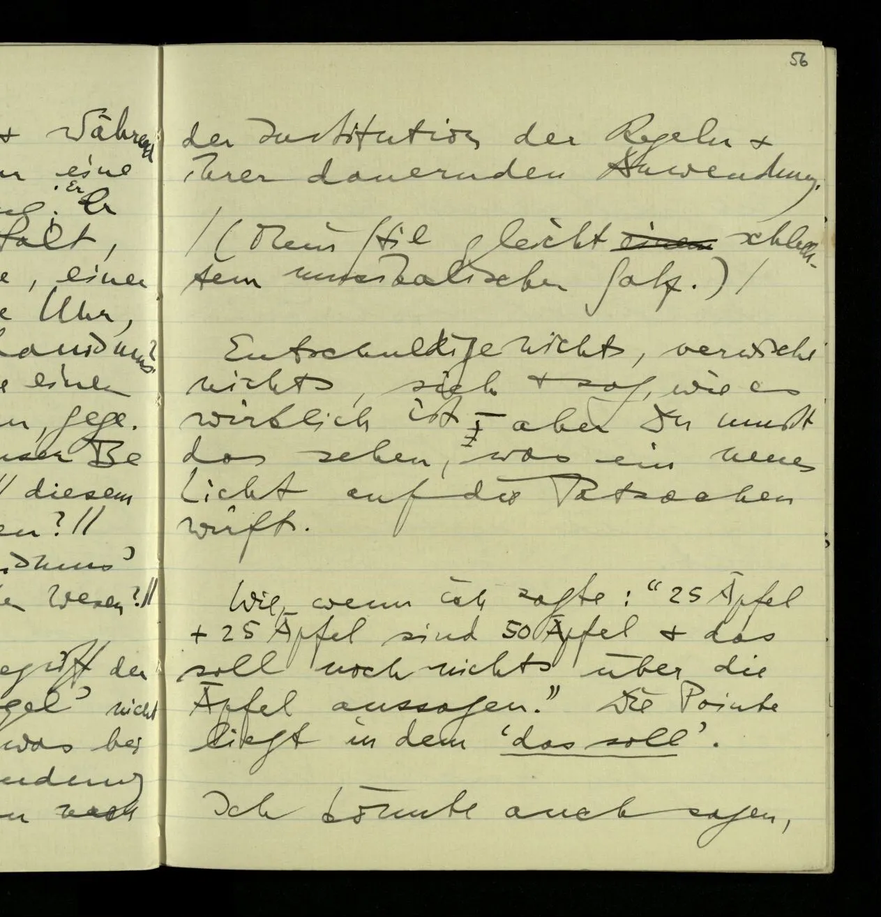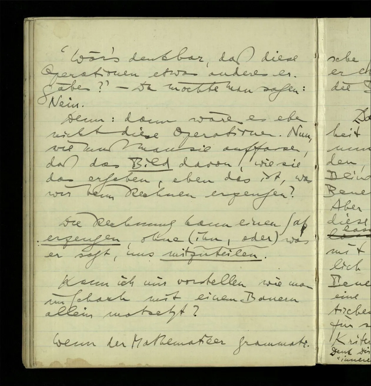 ‘Wär’s denkbar, daß diese Operationen etwas anderes ergäben?’ – Da möchte man sagen: Nein. Denn: dann wären es eben nicht diese Operationen. Nun, wie muß man sie auffassen, daß das Bild davon, wie sie das ergeben, eben das ist, was wir beim Rechnen erzeugen?
