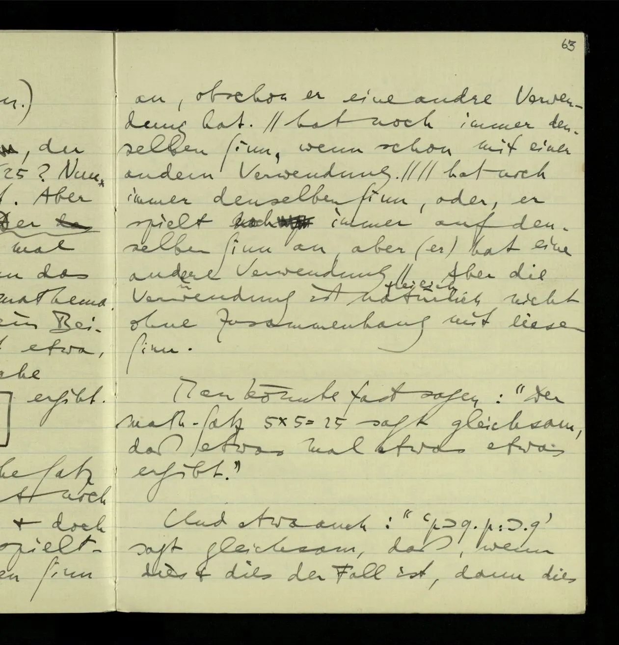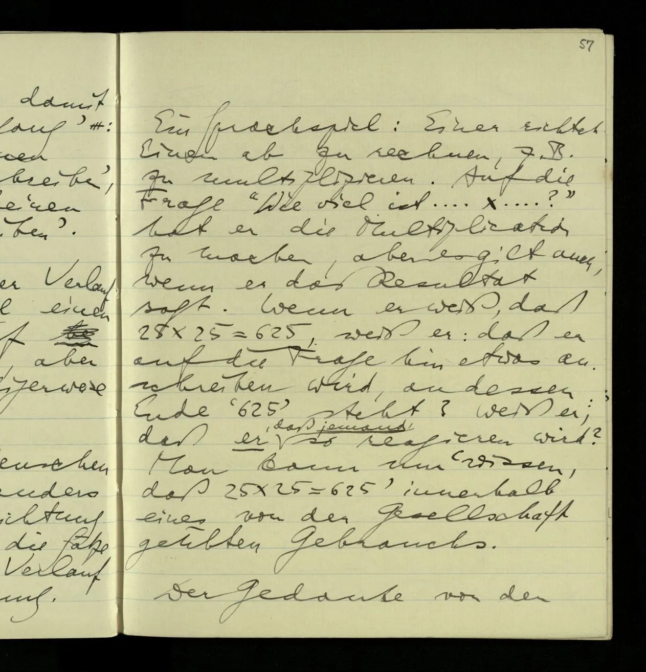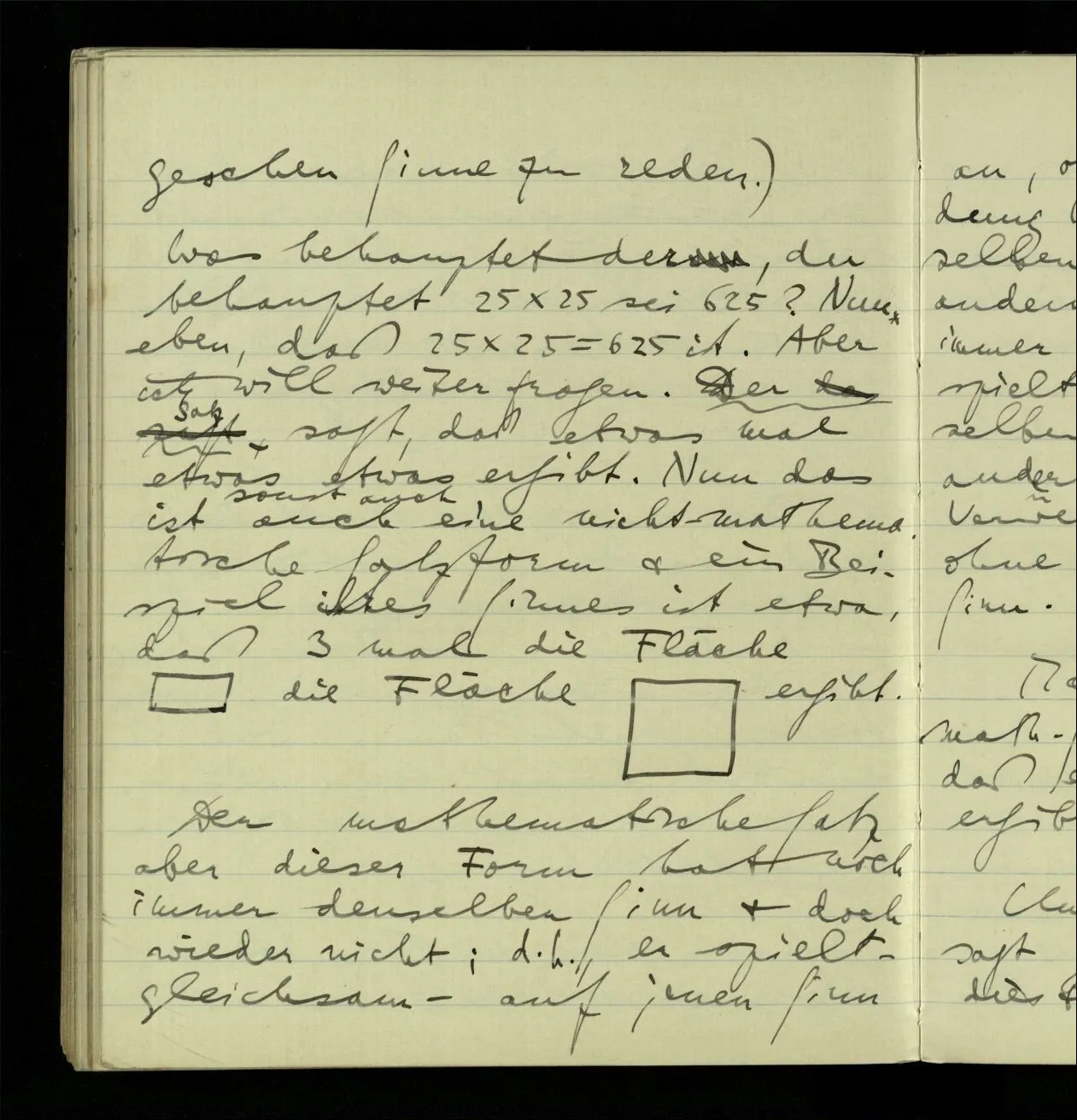 Was behauptet der, der behauptet 25 × 25 sei 625? Nun eben, daß 25 × 25 = 625 ist. Aber ich will weiter fragen. Der Satz sagt, daß etwas mal etwas etwas ergibt. Nun das ist auch eine nicht-mathematische Satzform & ein Beispiel ihres Sinnes ist etwa, daß 3 mal die Fläche