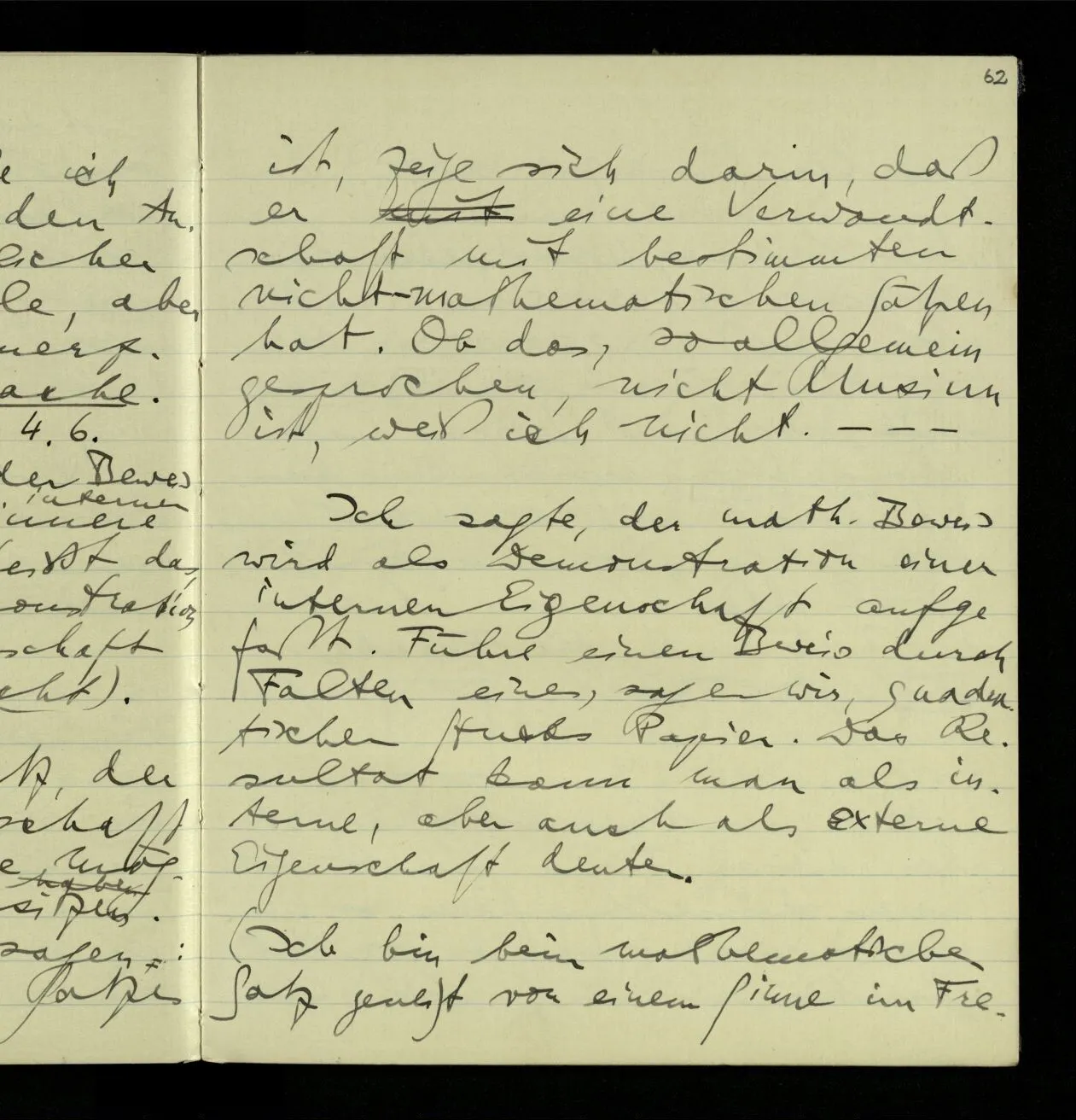Der bewiesene Satz, der die interne Eigenschaft hat kann alle möglichen Pointen besitzen. Und ich möchte sagen: was die Pointe des Satzes ist, zeige sich darin, daß er eine Verwandtschaft mit bestimmten nicht-mathematischen Sätzen hat. Ob das, so allgemein gesprochen, nicht Unsinn ist, weiß ich nicht. – – –