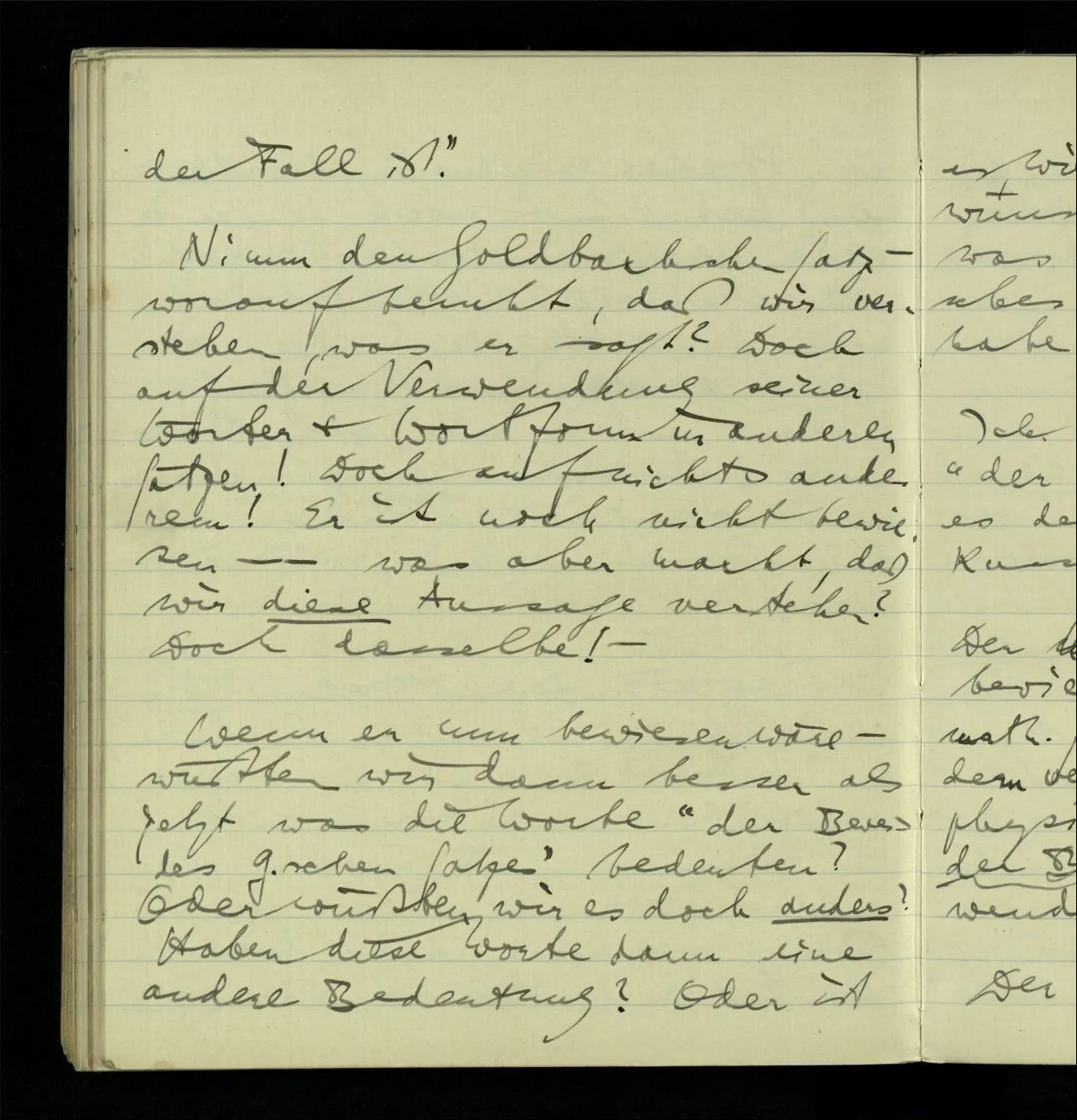Wenn er nun bewiesen wäre – wüßten wir dann besser als jetzt was die Worte “der Beweis des Goldbachschen Satzes” bedeuten? Oder wüßten wir es doch anders? Haben diese Worte dann eine andere Bedeutung? Oder ist es, wie wenn ich mir einen Apfel wünsche wo ich ebensogut weiß was der Gegenstand des Wunsches ist ehe ich ihn erhalten habe & nachher.