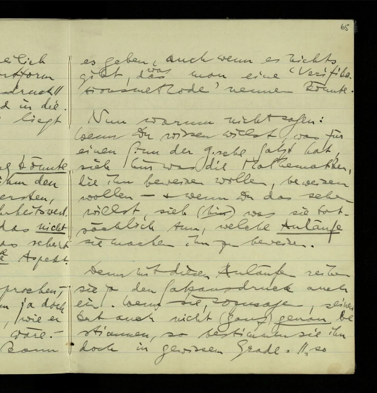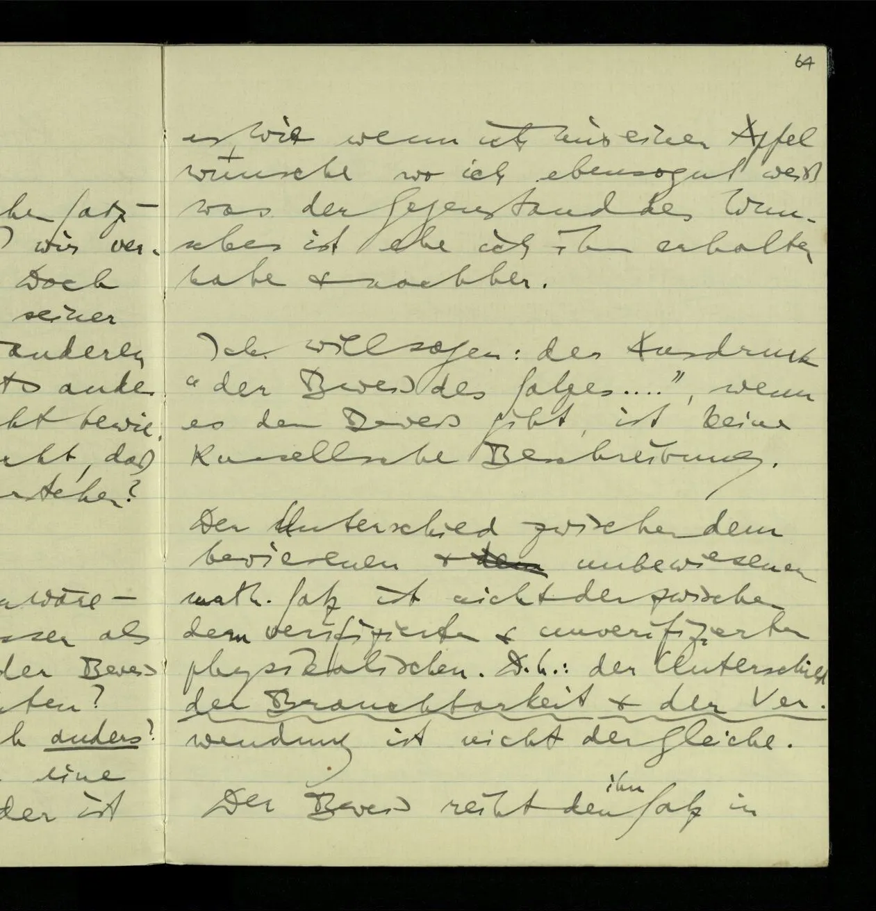 Denn, ungefähr gesprochen, den ‘Sinn’ sollte ihm ja doch die Art & Weise geben, wie er als wahr zu befinden wäre. – Einen Beweis des Satzes aber kann es geben, auch wenn es nichts gibt, das man eine ‘Verifikationsmethode’ nennen könnte.