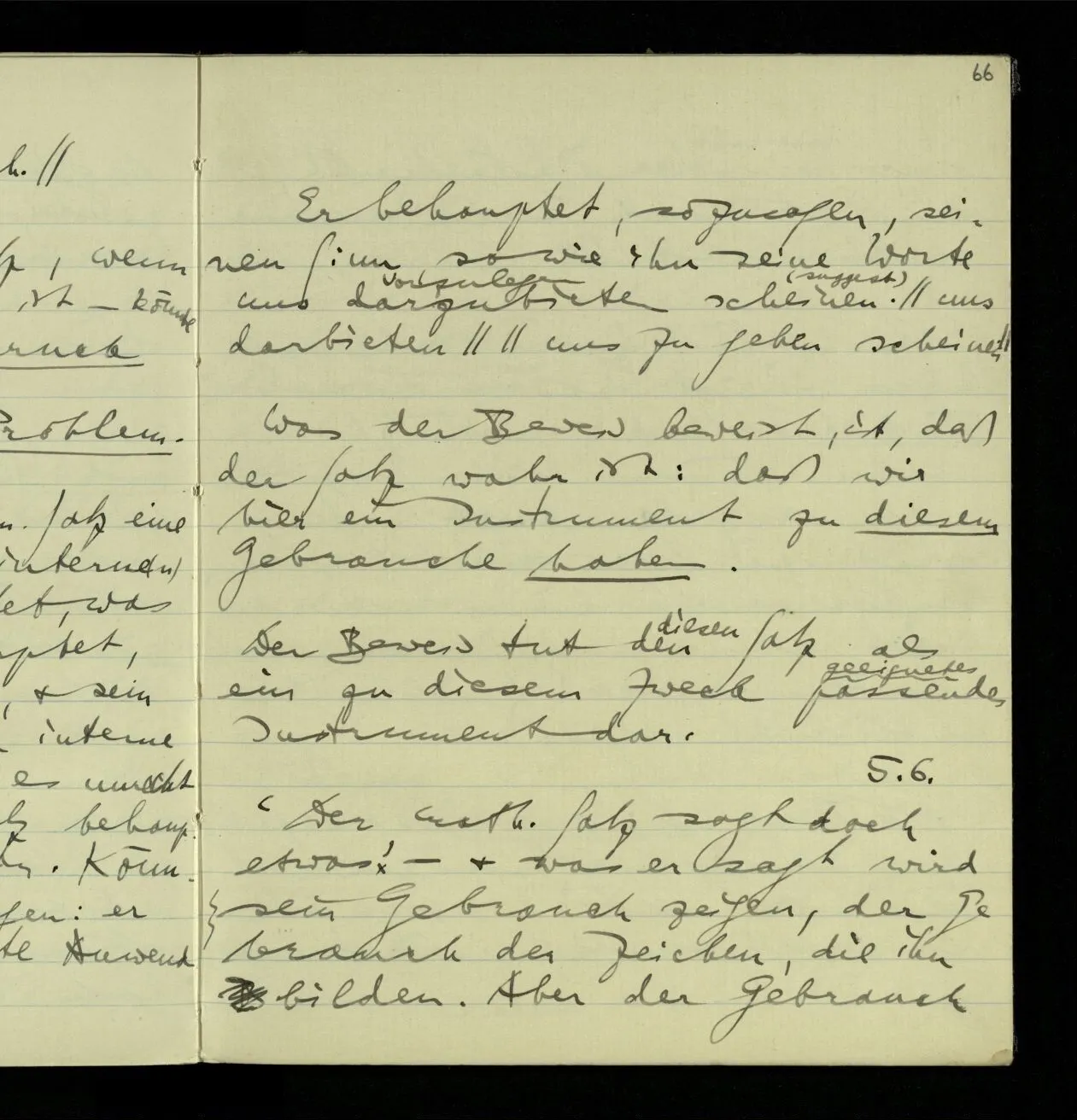 05.06.1941 ‘Der math. Satz sagt doch etwas’ – & was er sagt wird sein Gebrauch zeigen, der Gebrauch der Zeichen, die ihn bilden. Aber der Gebrauch nur in der Mathematik, oder der Gebrauch auch außerhalb?!