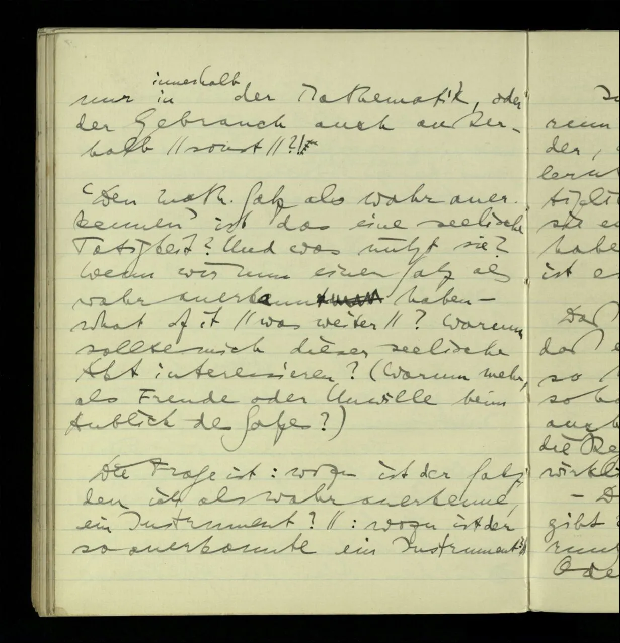 ‘Den math. Satz als wahr anerkennen’ ist das eine seelische Tätigkeit? Und was nützt sie? Wenn wir nun einen Satz als wahr anerkannt haben – what of it? Warum sollte mich dieser seelische Akt interessieren? (Warum mehr, als Freude oder Unwille beim Anblick des Satzes?)
