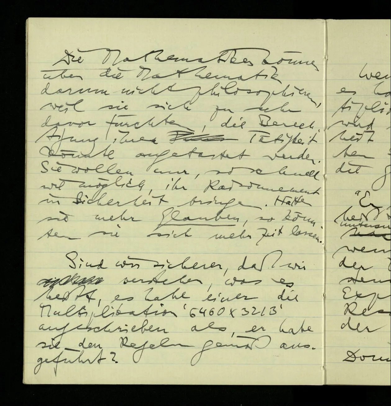 Die Mathematiker können über die Mathematik darum nicht philosophieren, weil sie sich zu sehr davor fürchten, die Berechtigung ihrer Tätigkeit könnte angetastet werden. Sie wollen nur, so schnell wie möglich, ihr Raisonnement in Sicherheit bringen. Hätten sie mehr Glauben, so könnten sie sich mehr Zeit lassen.
