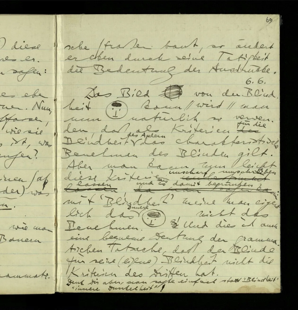 kann man nun natürlich so verwenden, daß als Kriterien für die Blindheit des Andern das charakteristische Benehmen des Blinden gilt. Aber man kann nun leicht diese Kriterien unscharf umschrieben lassen, und es damit begründen: mit ‘Blindheit’ meine man eigentlich das Innere