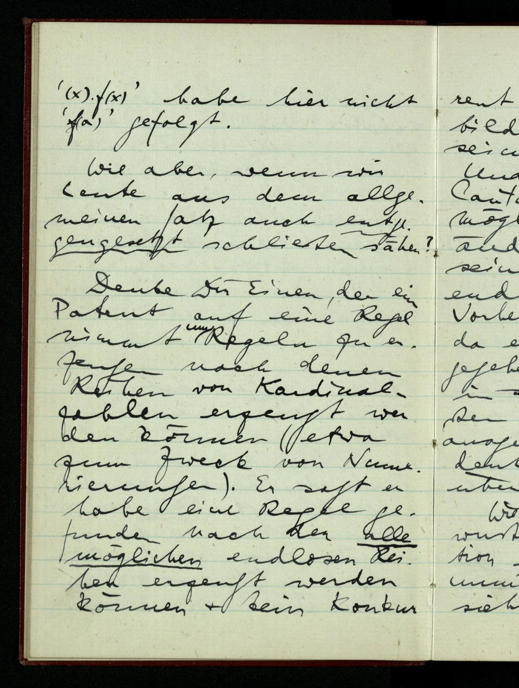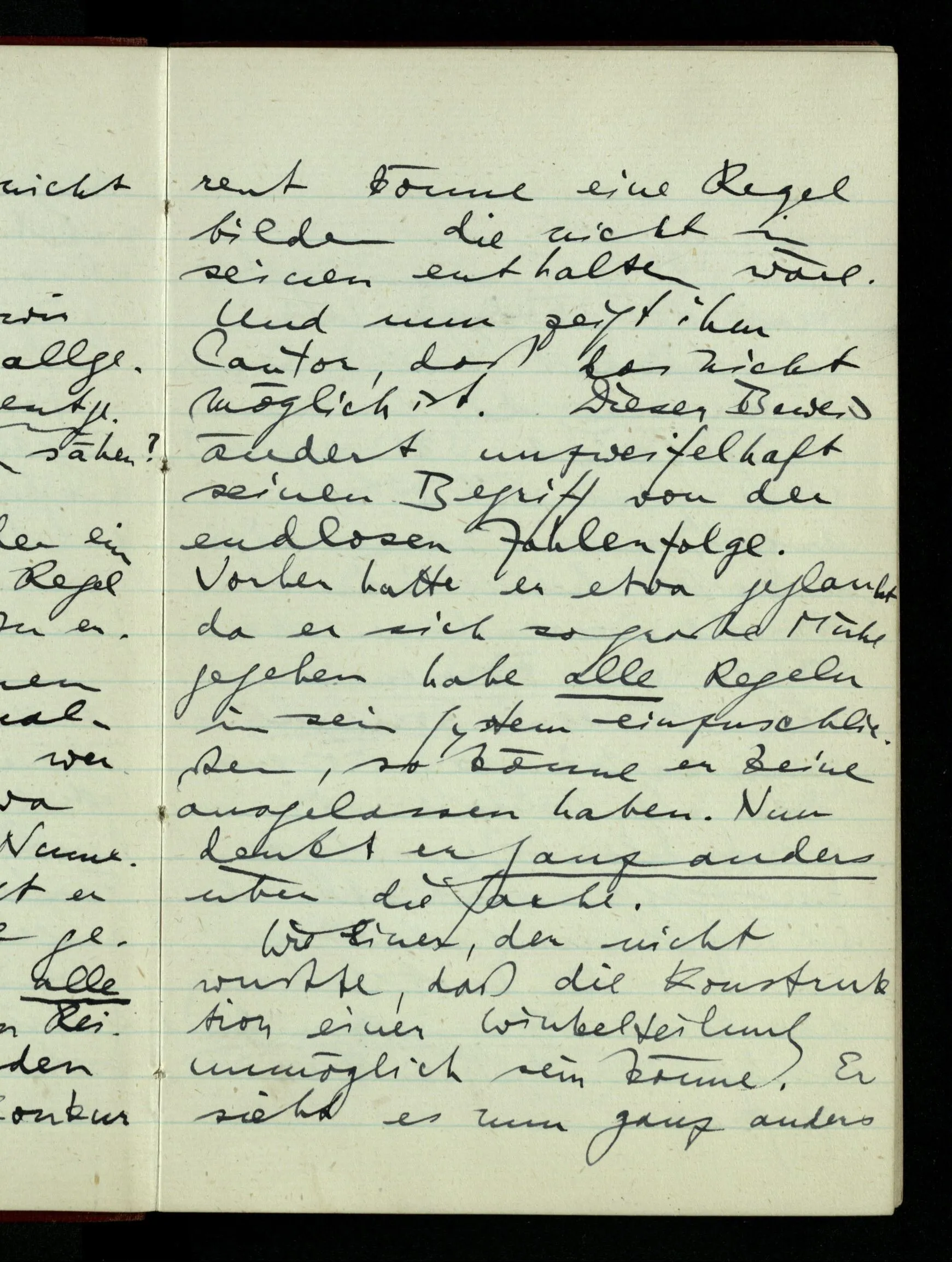 Denke Dir Einen, der ein Patent auf eine Regel nimmt um Regeln zu erzeugen nach denen Reihen von Kardinalzahlen erzeugt werden können (etwa zum Zweck von Numerierungen). Er sagt er habe eine Regel gefunden nach der alle möglichen endlosen Reihen erzeugt werden können & kein Konkurrent könne eine Regel bilden die nicht in der seinen enthalten wäre. Und nun zeigt ihm Cantor, daß das nicht möglich ist. Dieser Beweis ändert unzweifelhaft seinen Begriff von der endlosen Zahlenfolge. Vorher hatte er etwa geglaubt da er sich so große Mühe gegeben habe alle Regeln in sein System einzuschließen, so könne er keine ausgelassen haben. Nun denkt er ganz anders über die Sache. Wie Einer, der nicht wußte, daß die Konstruktion einer Winkelteilung unmöglich sein könne. Er sieht es nun ganz anders an.