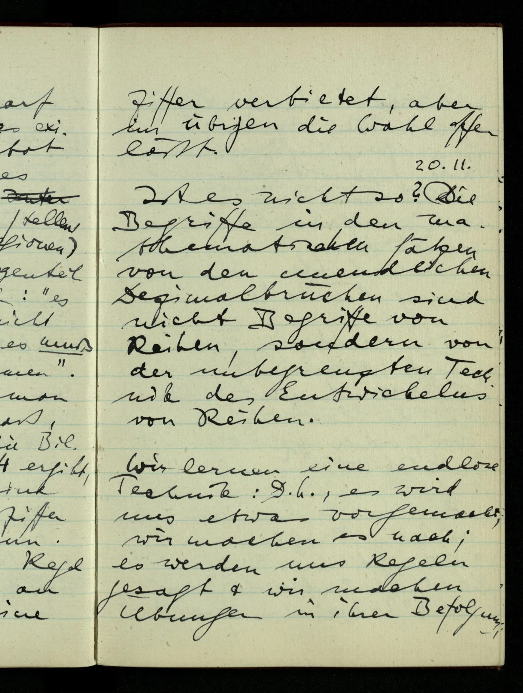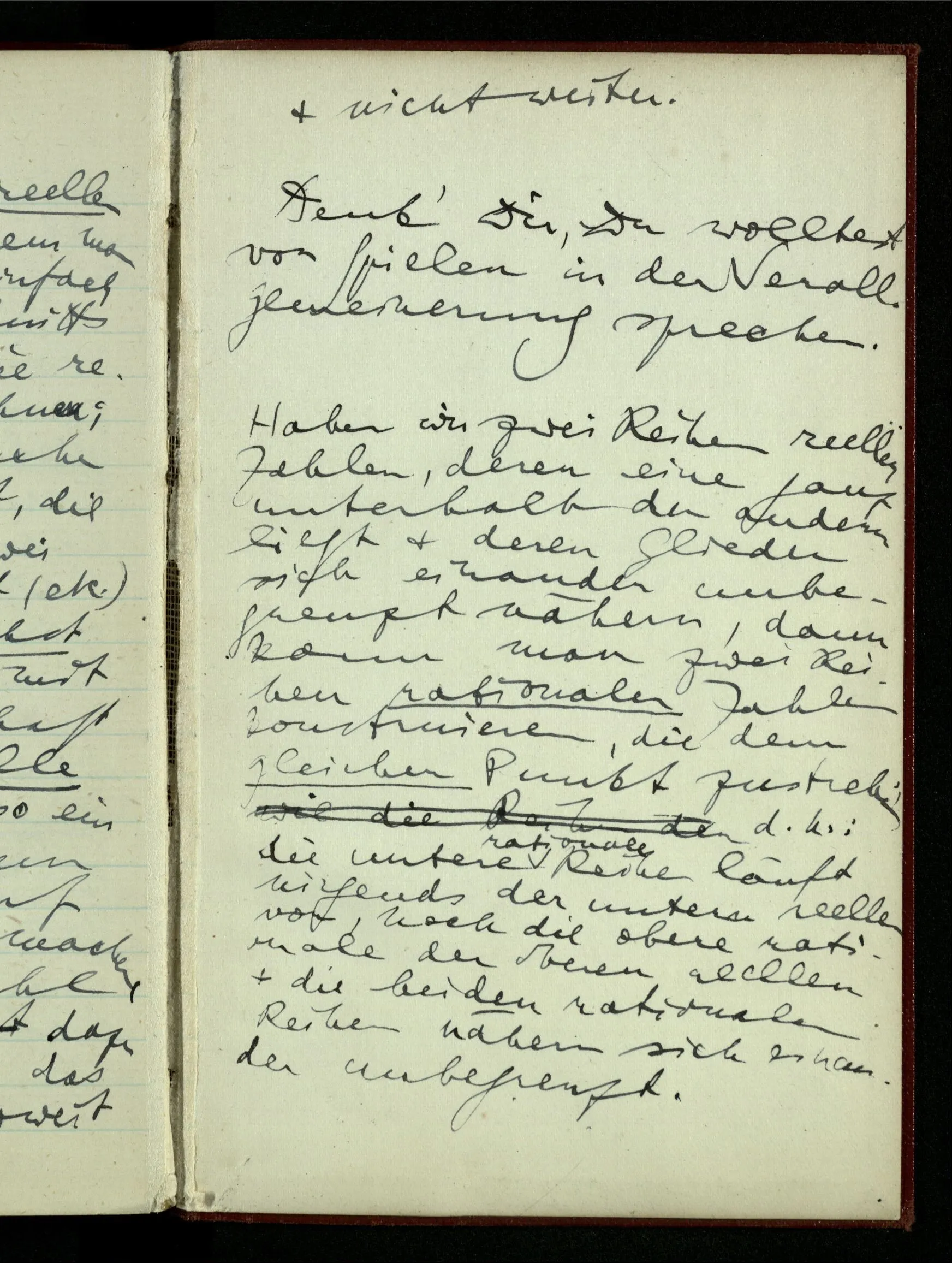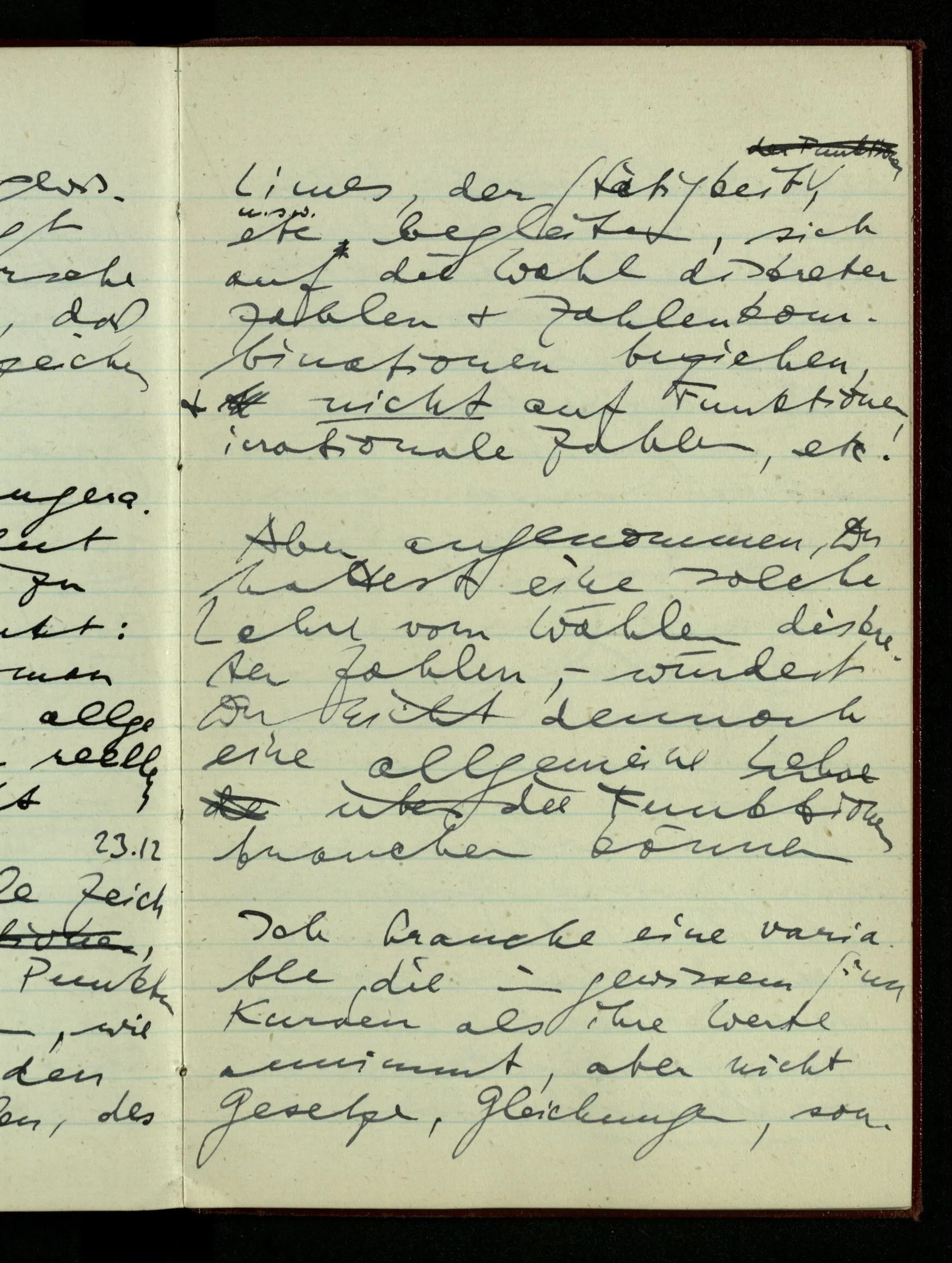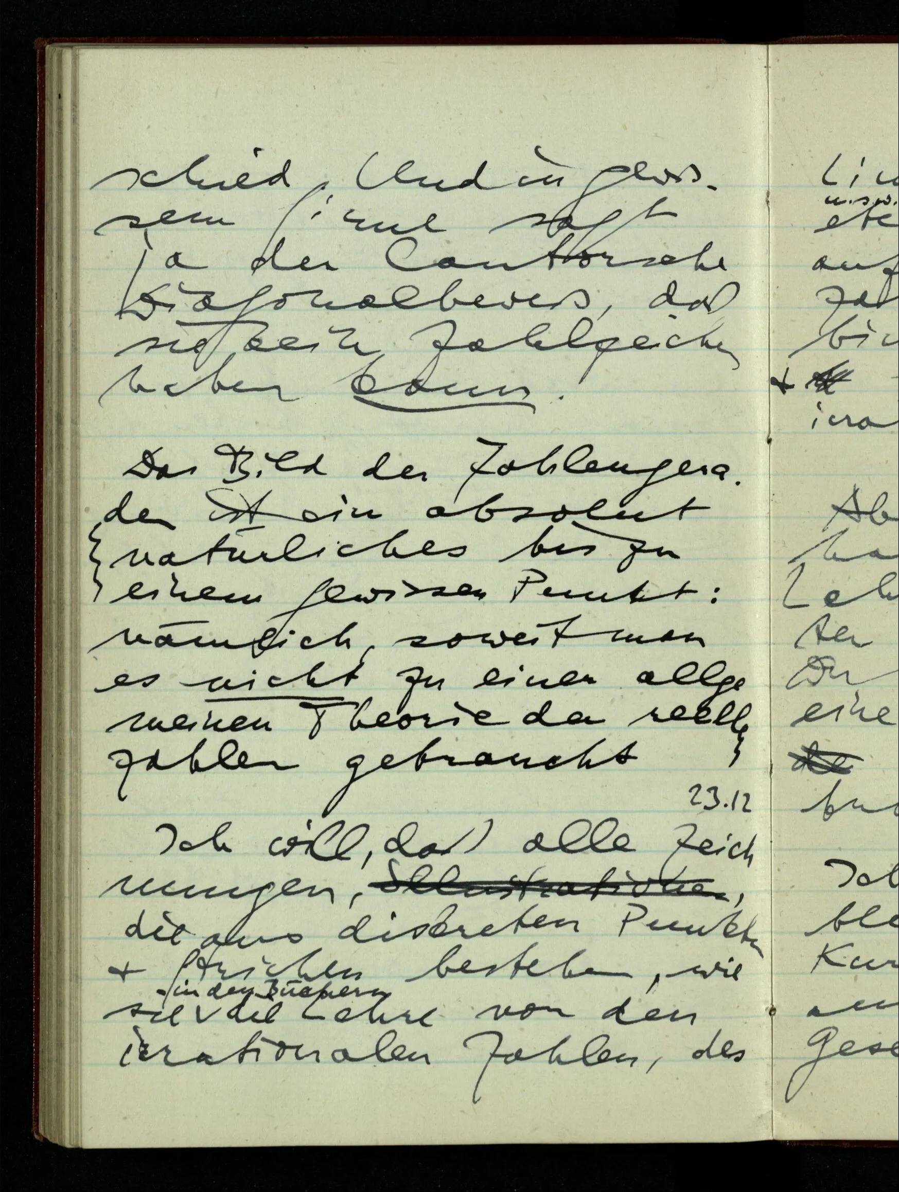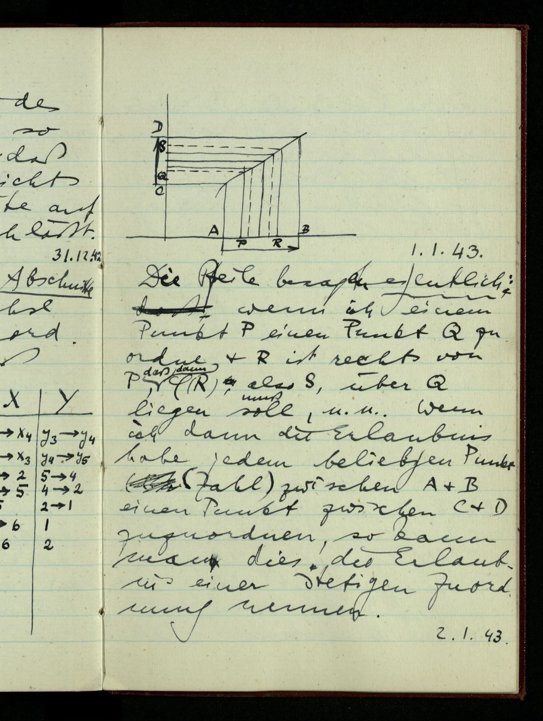 23.12.1942 Ich will, daß alle Zeichnungen, die aus diskreten Punkten & Strichen bestehen, wie sie in den Büchern die Lehre von den irrationalen Zahlen, des Limes, der Stätigkeit, etc. begleiten, sich auf die Wahl diskreter Zahlen & Zahlenkombinationen beziehen, & nicht auf Funktionen, irrationale Zahlen, etc.