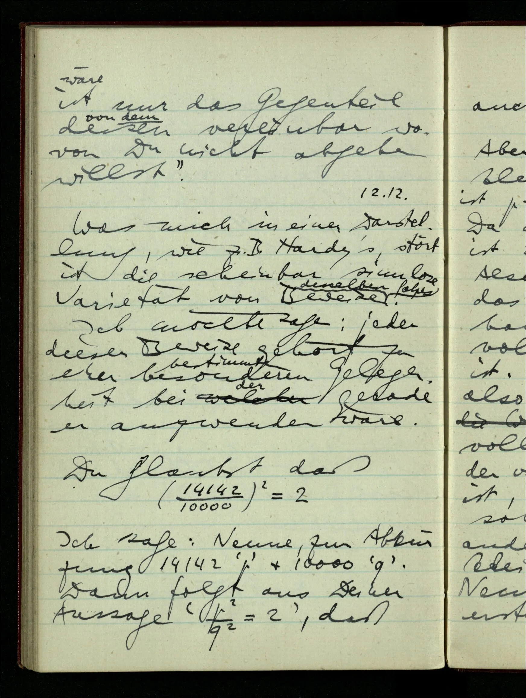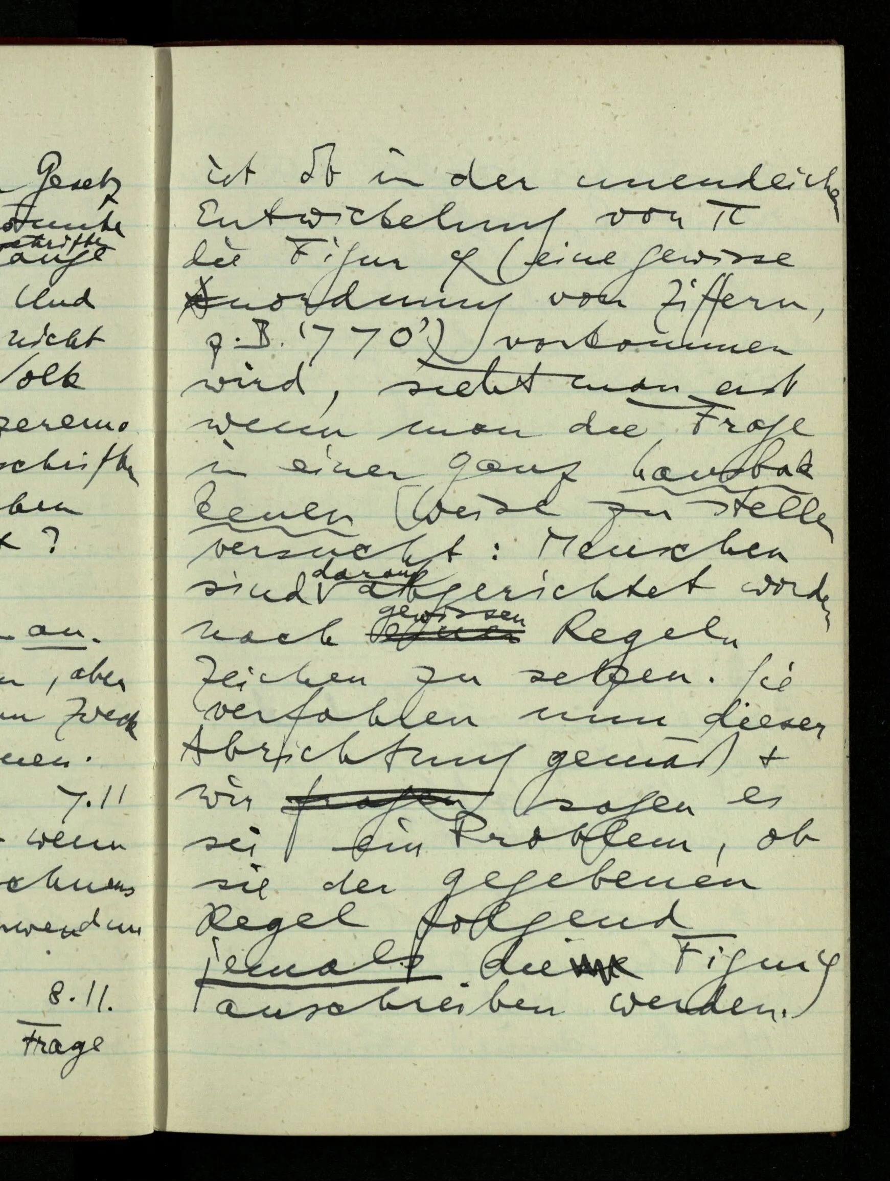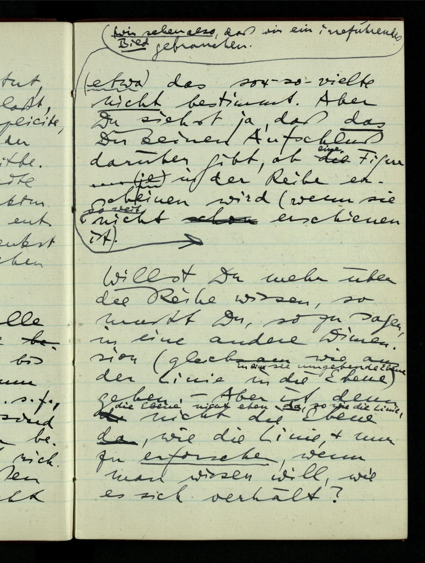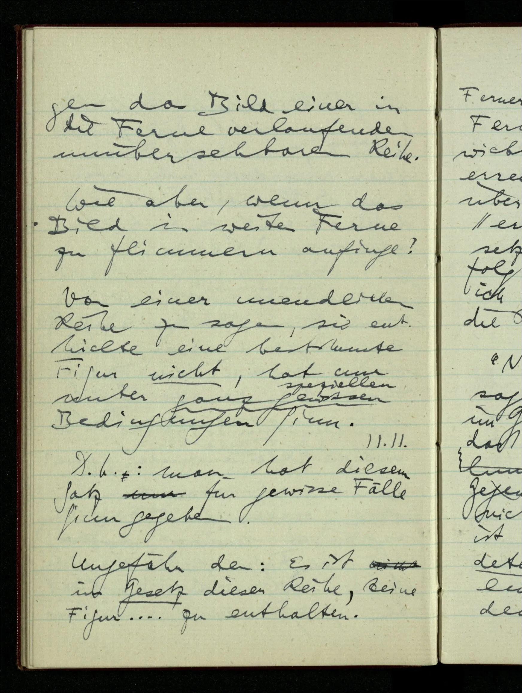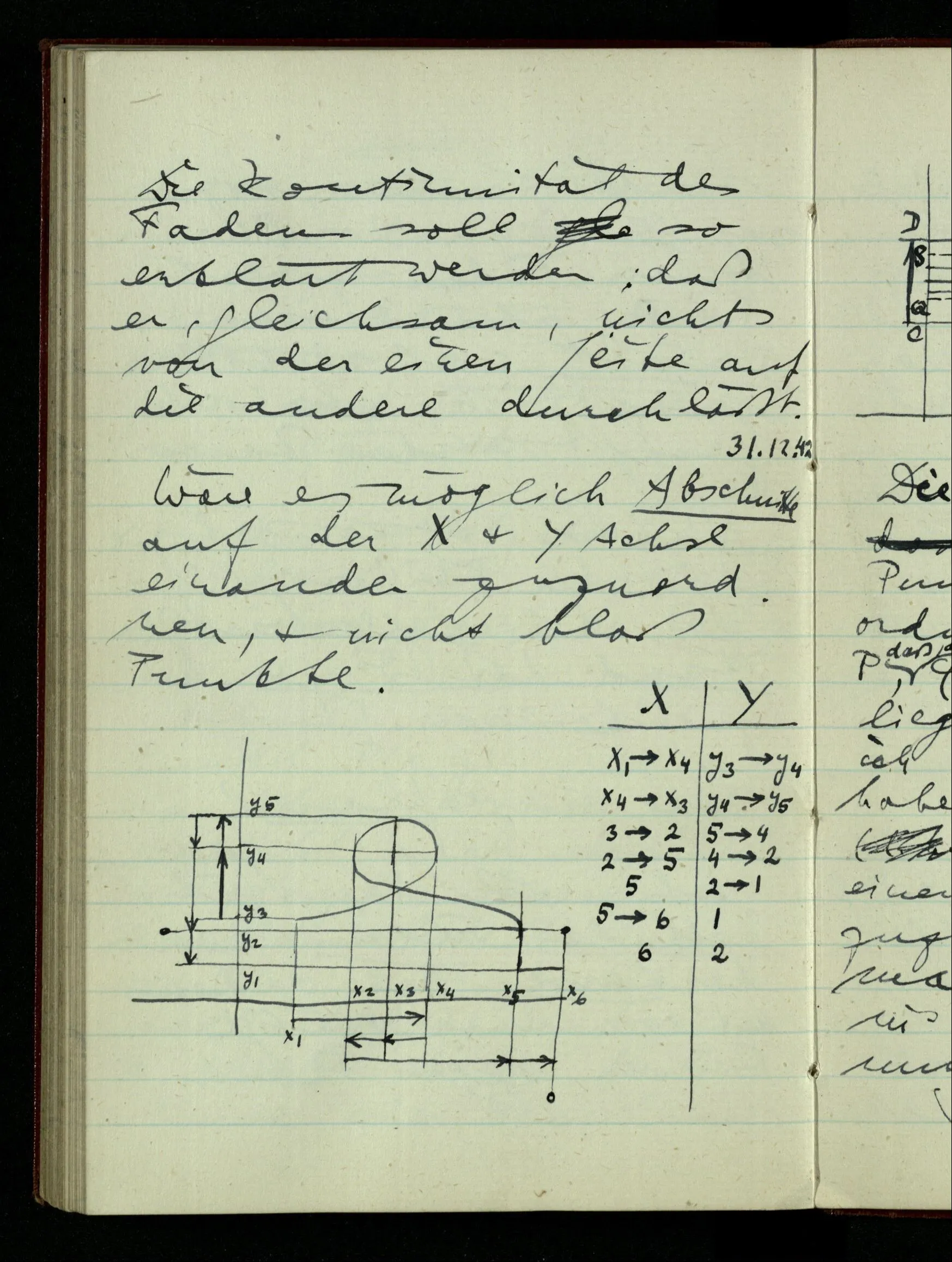 23.12.1942 Ich will, daß alle Zeichnungen, die aus diskreten Punkten & Strichen bestehen, wie sie in den Büchern die Lehre von den irrationalen Zahlen, des Limes, der Stätigkeit, etc. begleiten, sich auf die Wahl diskreter Zahlen & Zahlenkombinationen beziehen, & nicht auf Funktionen, irrationale Zahlen, etc.