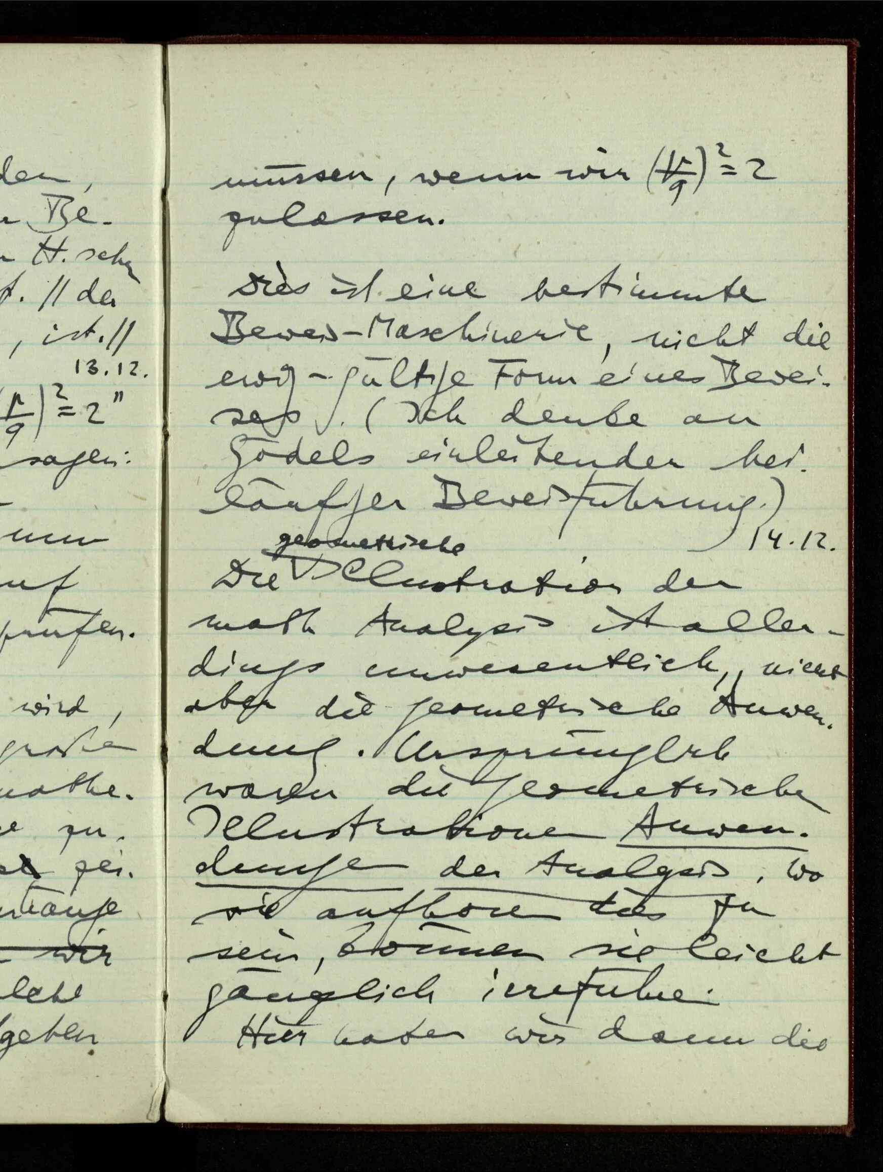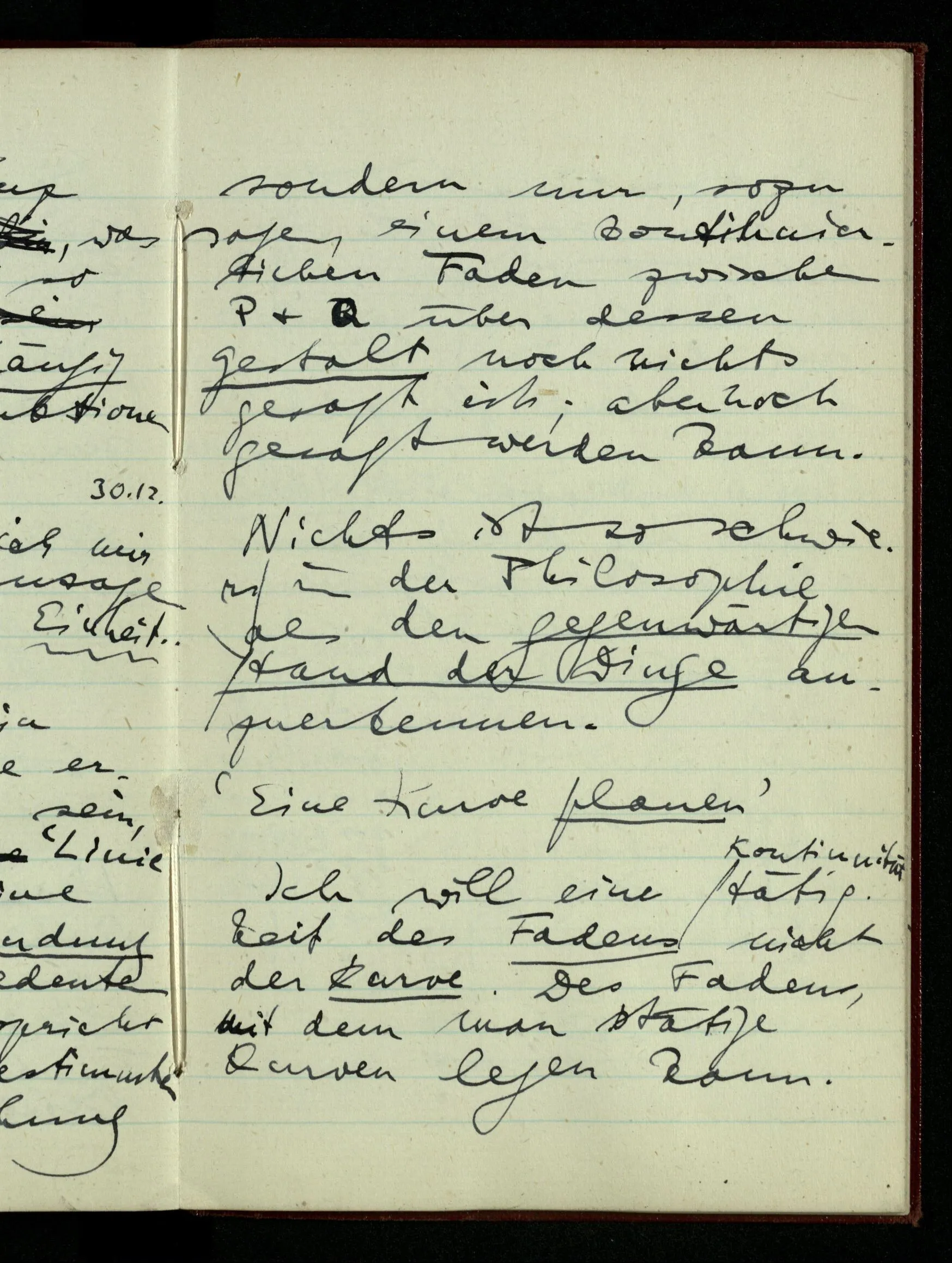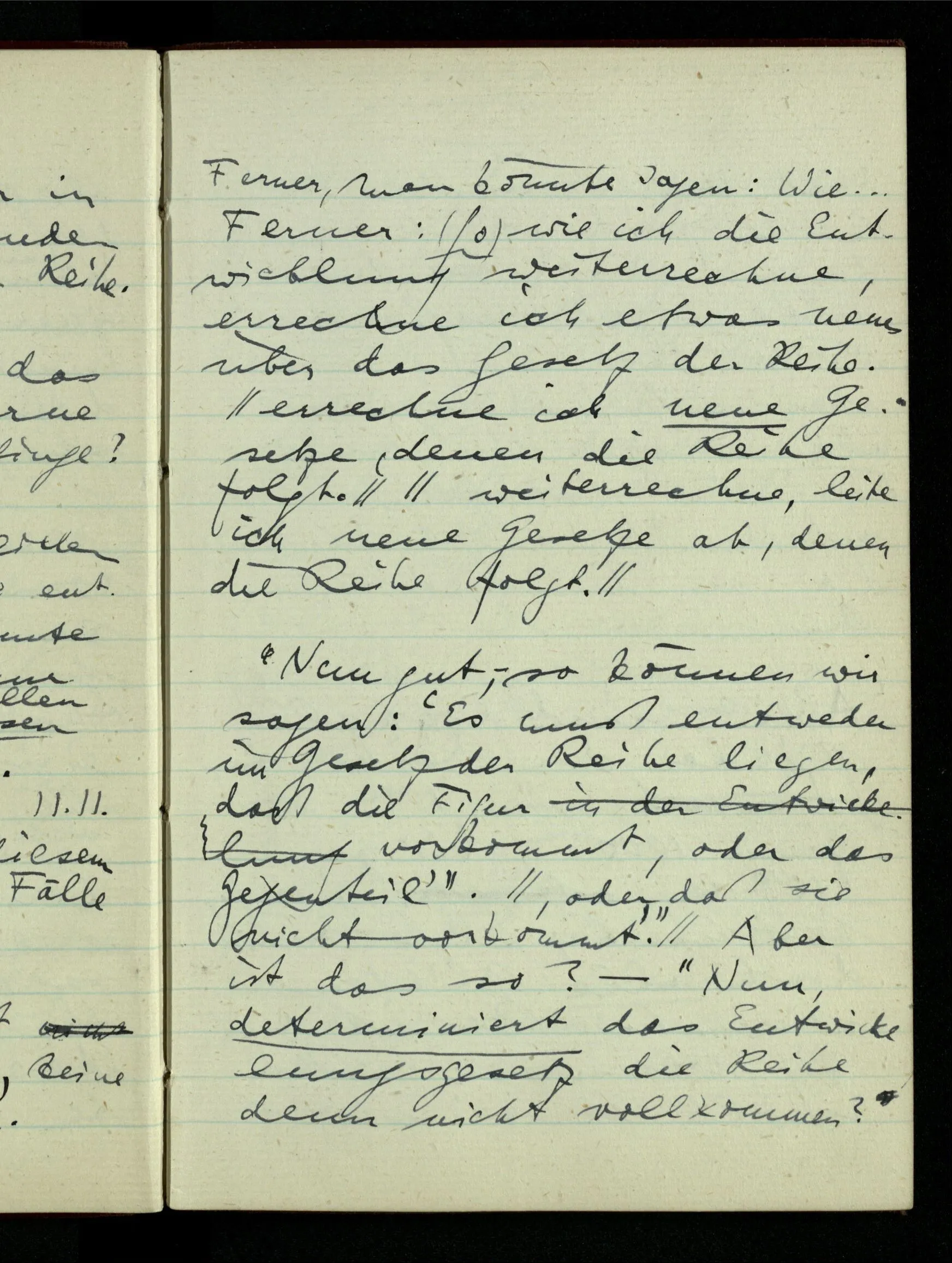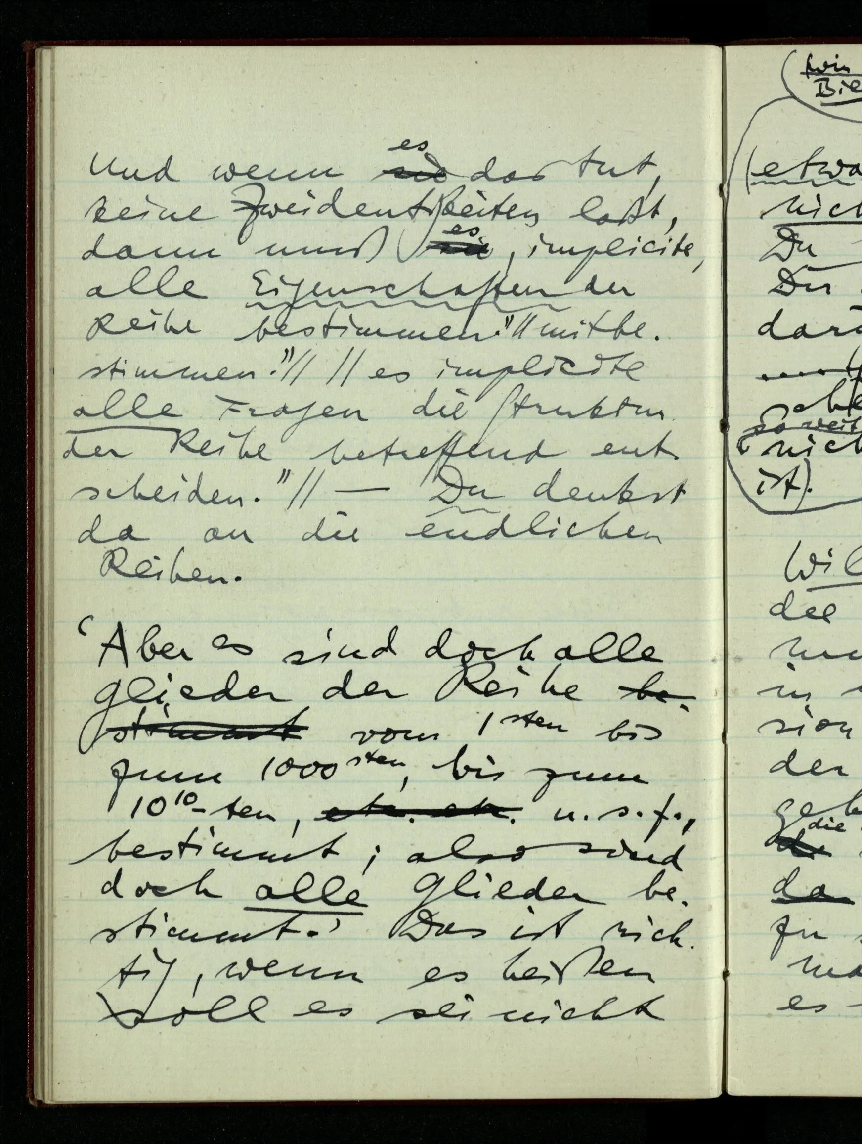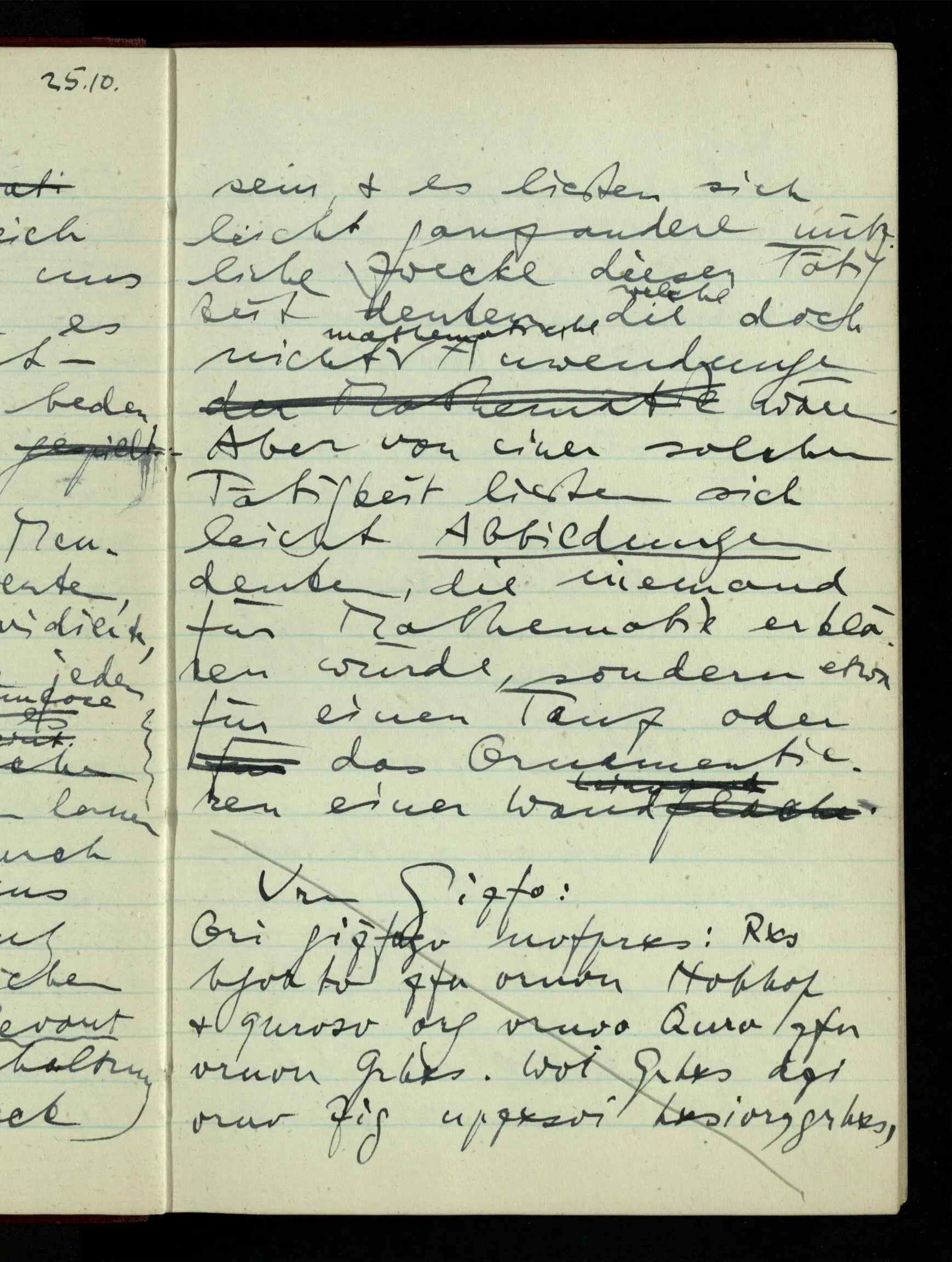 23.12.1942 Ich will, daß alle Zeichnungen, die aus diskreten Punkten & Strichen bestehen, wie sie in den Büchern die Lehre von den irrationalen Zahlen, des Limes, der Stätigkeit, etc. begleiten, sich auf die Wahl diskreter Zahlen & Zahlenkombinationen beziehen, & nicht auf Funktionen, irrationale Zahlen, etc.