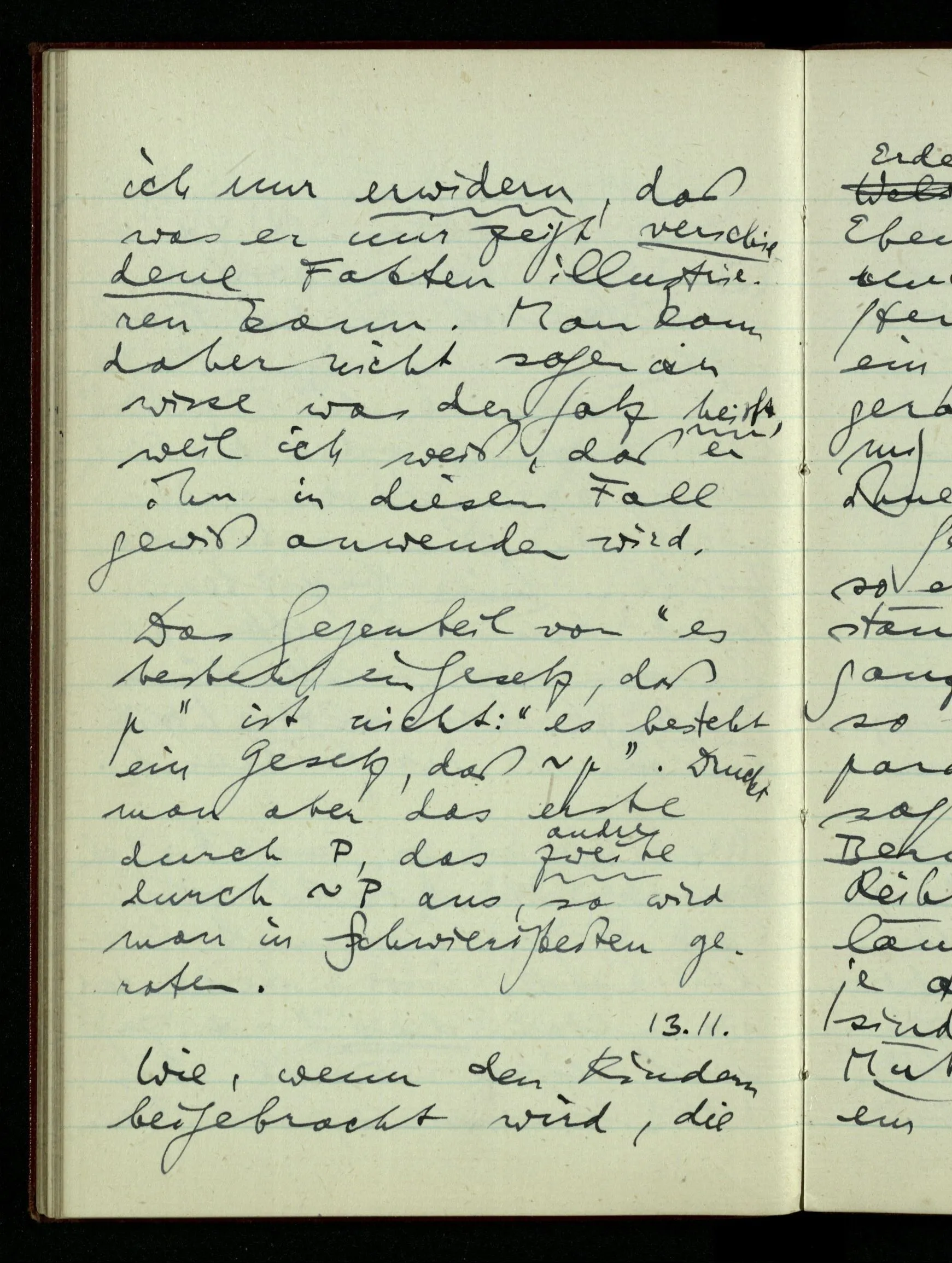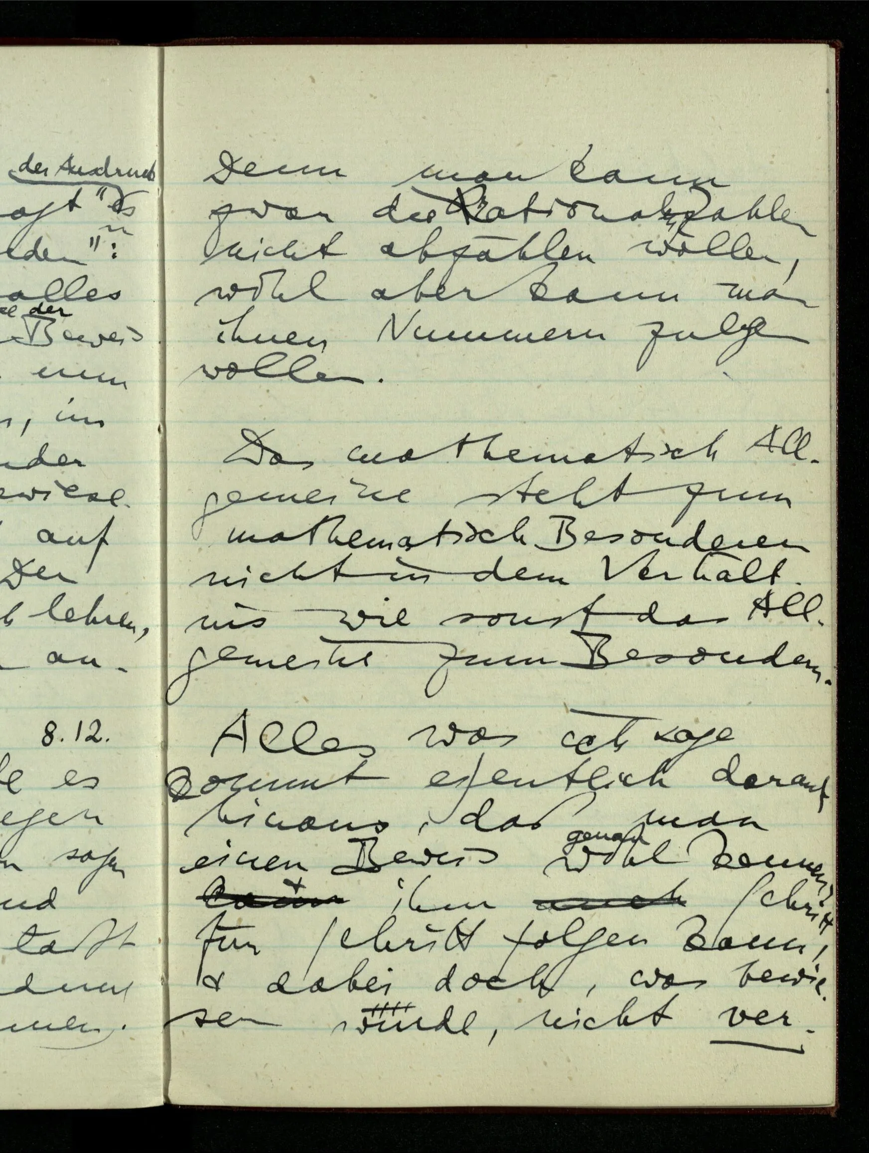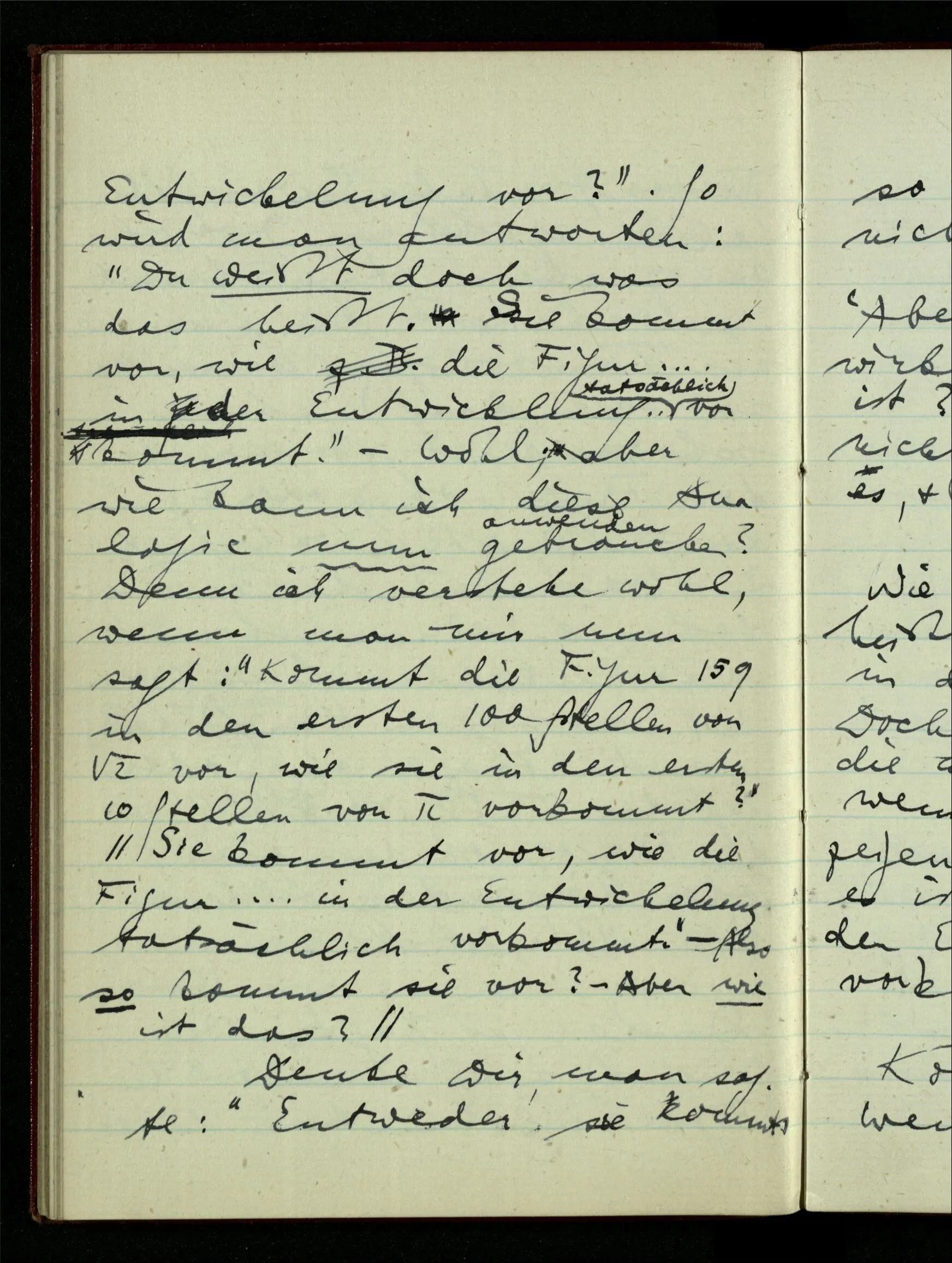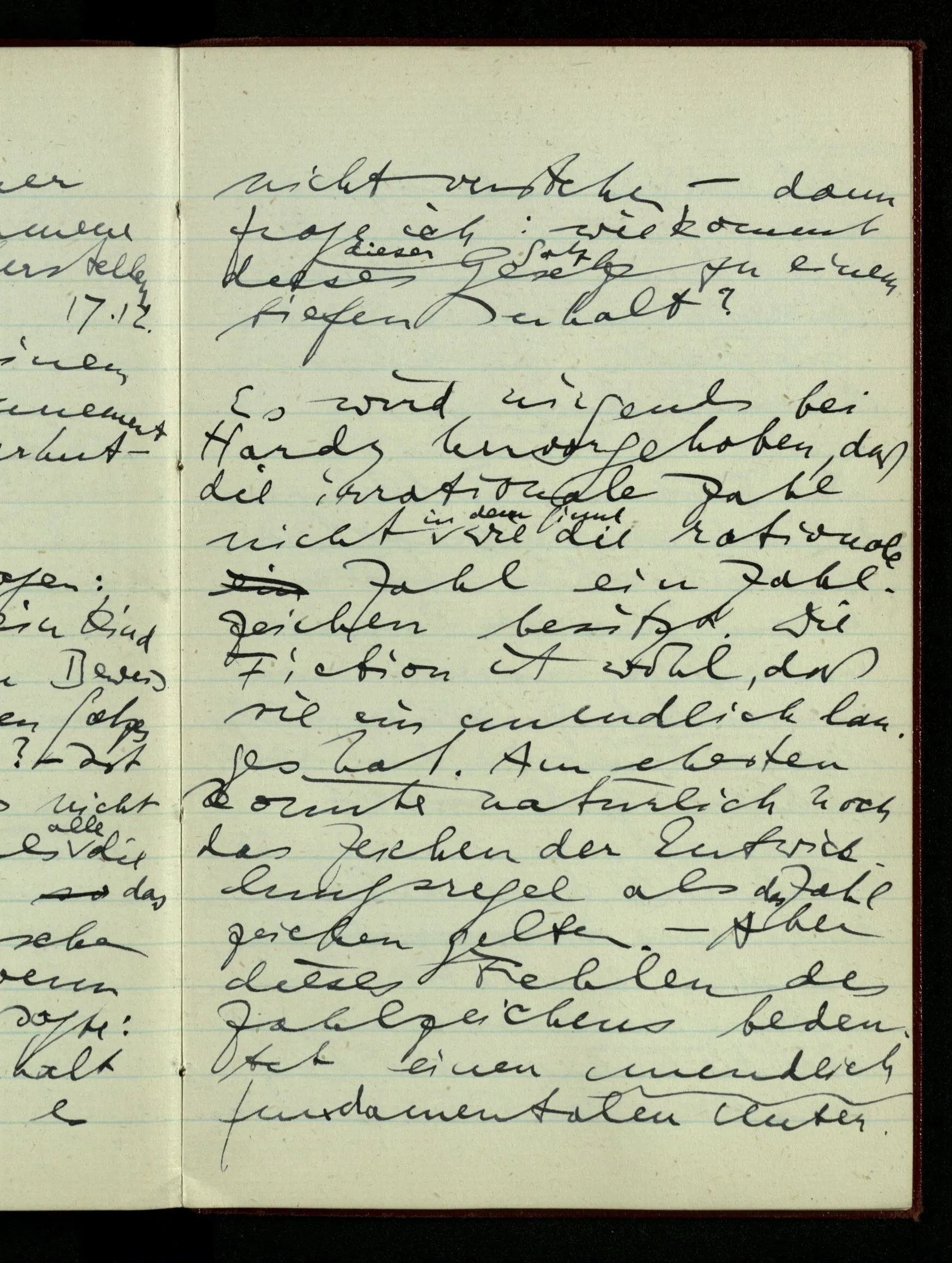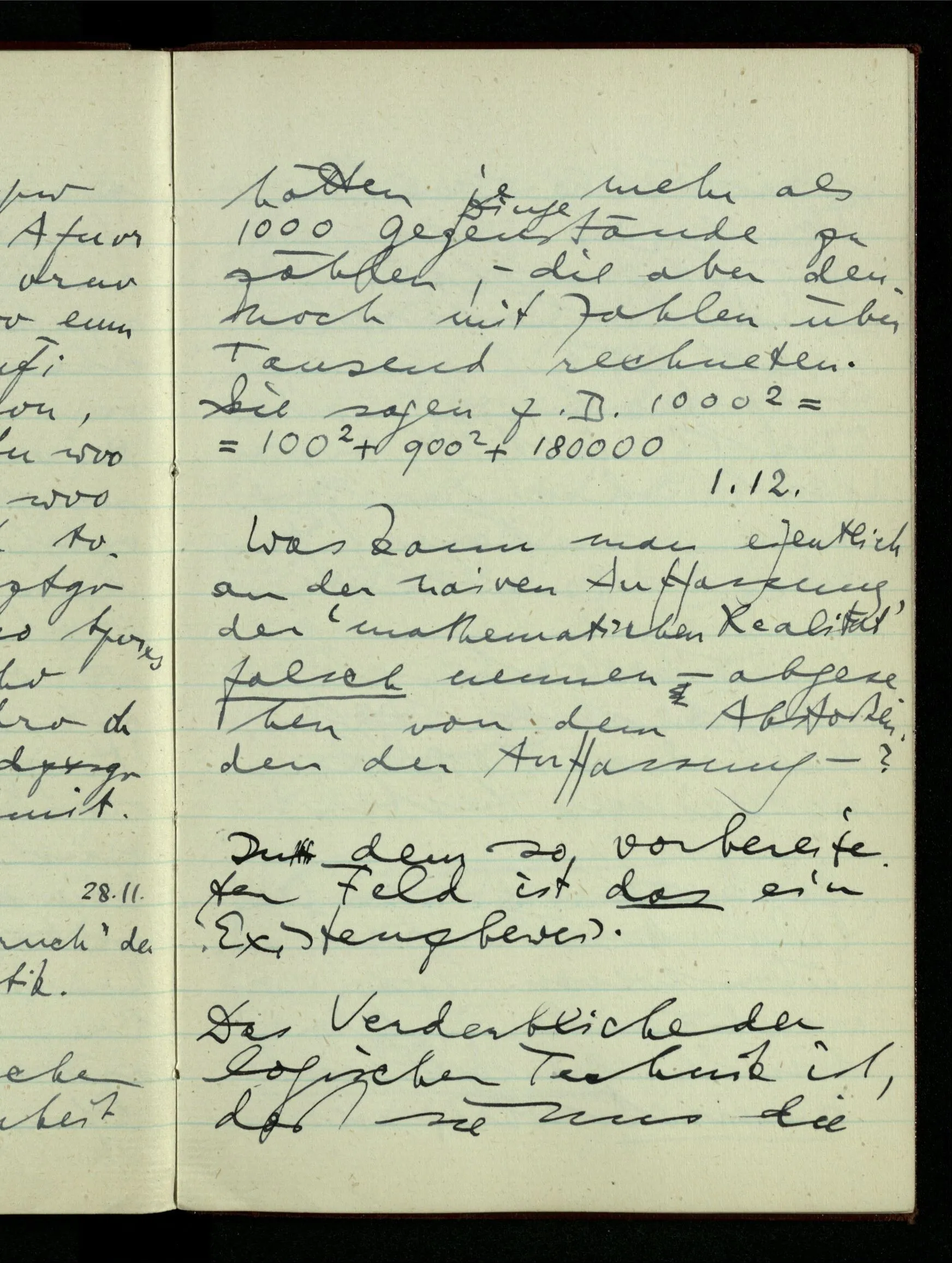 23.12.1942 Ich will, daß alle Zeichnungen, die aus diskreten Punkten & Strichen bestehen, wie sie in den Büchern die Lehre von den irrationalen Zahlen, des Limes, der Stätigkeit, etc. begleiten, sich auf die Wahl diskreter Zahlen & Zahlenkombinationen beziehen, & nicht auf Funktionen, irrationale Zahlen, etc.