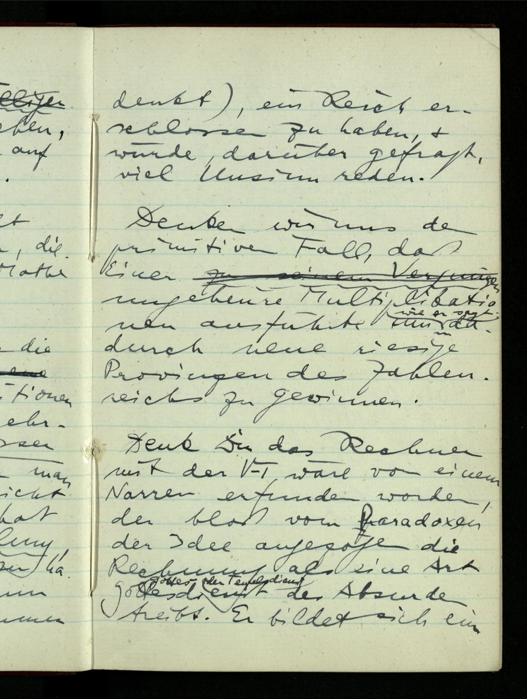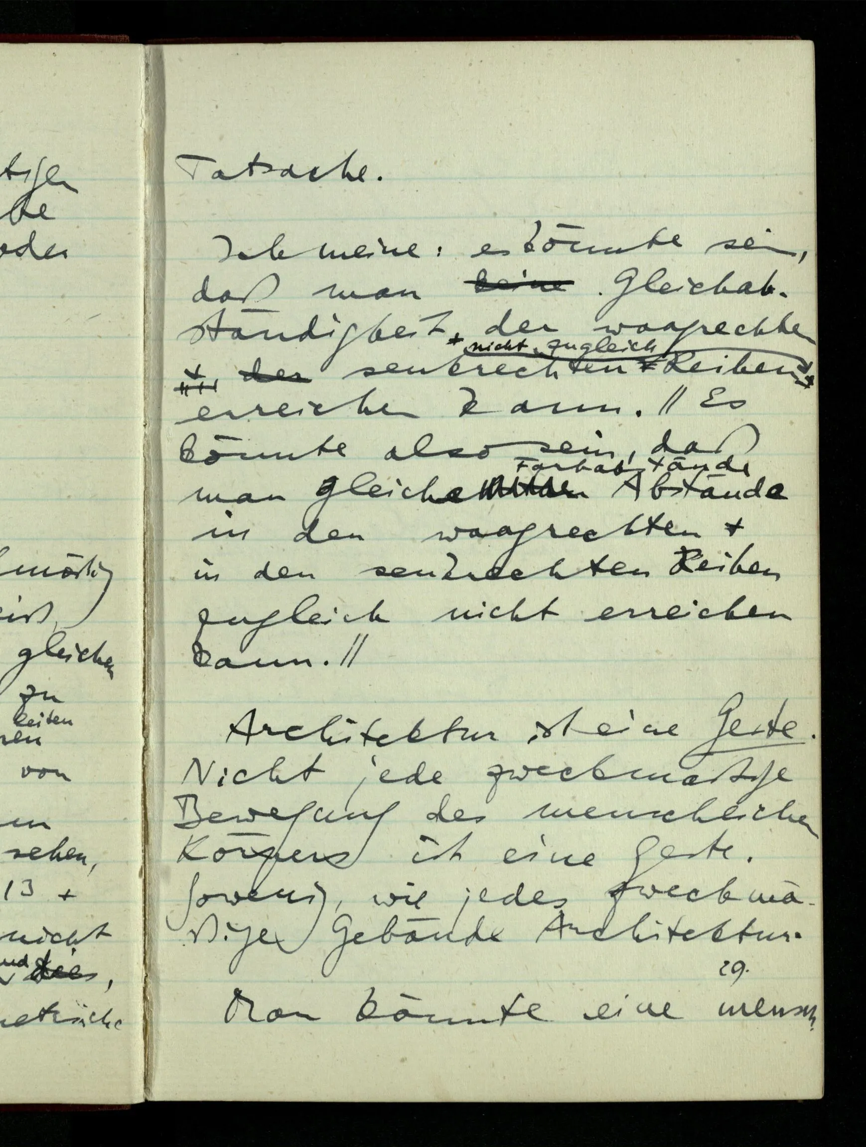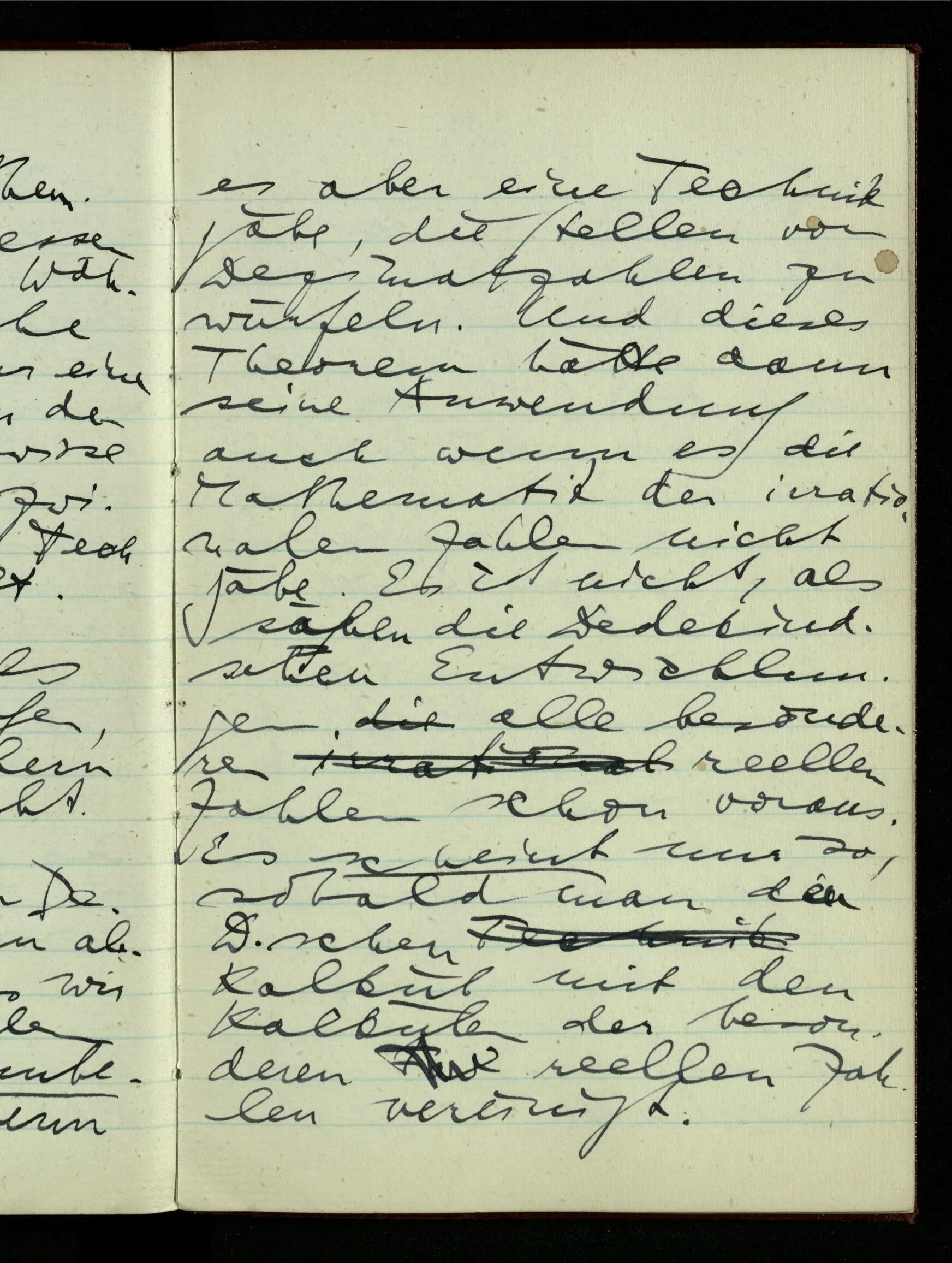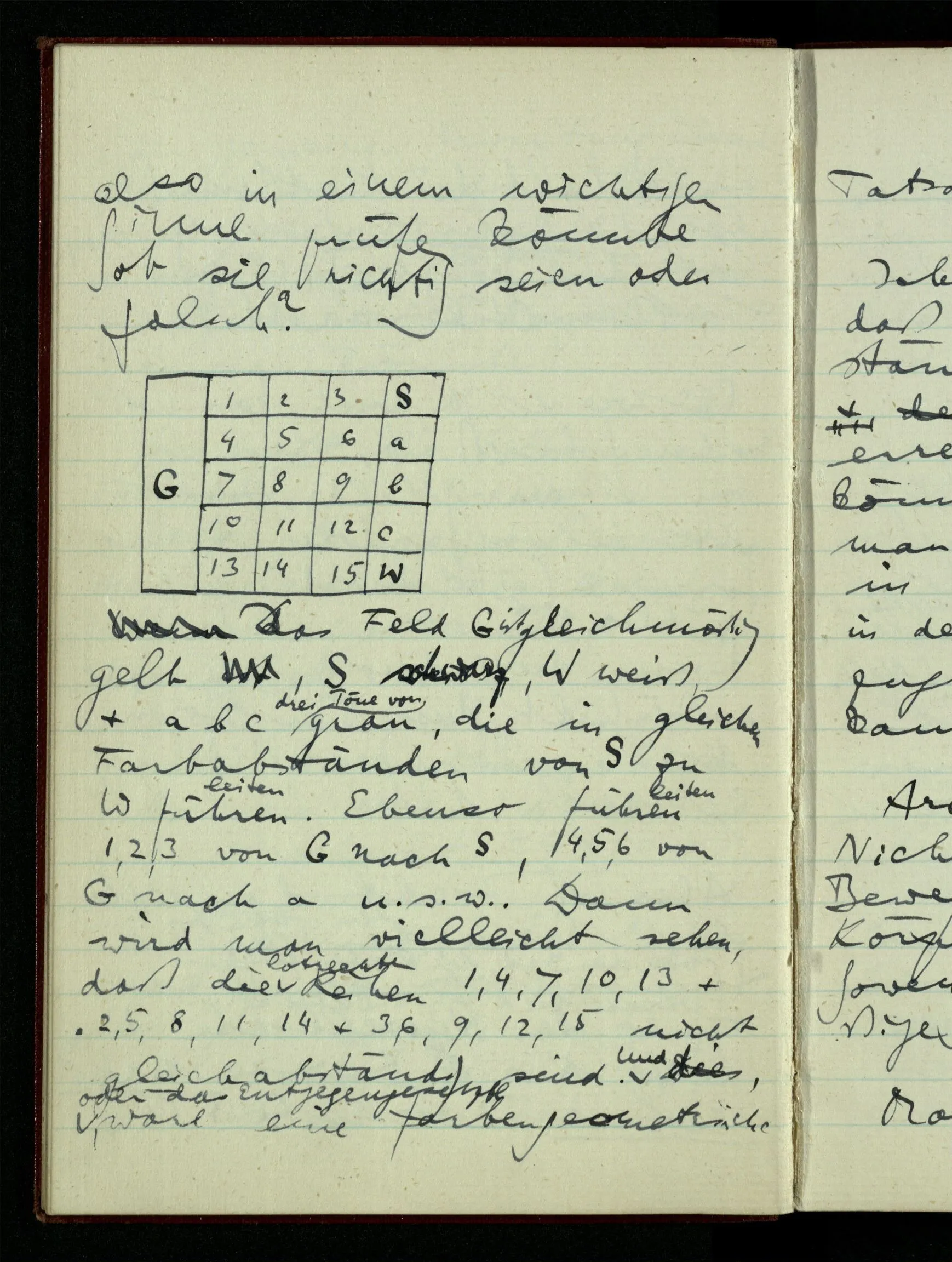 23.12.1942 Ich will, daß alle Zeichnungen, die aus diskreten Punkten & Strichen bestehen, wie sie in den Büchern die Lehre von den irrationalen Zahlen, des Limes, der Stätigkeit, etc. begleiten, sich auf die Wahl diskreter Zahlen & Zahlenkombinationen beziehen, & nicht auf Funktionen, irrationale Zahlen, etc.
