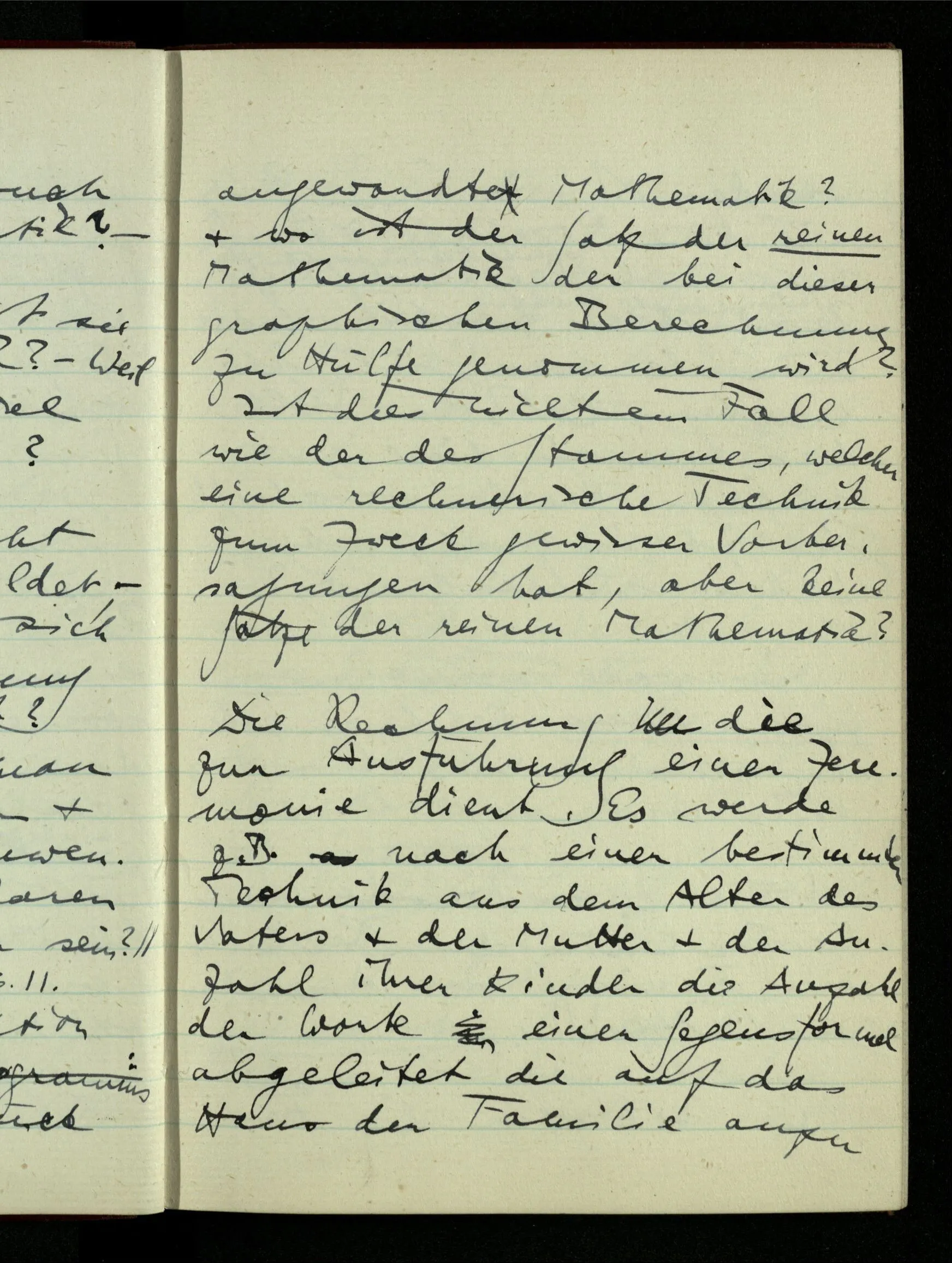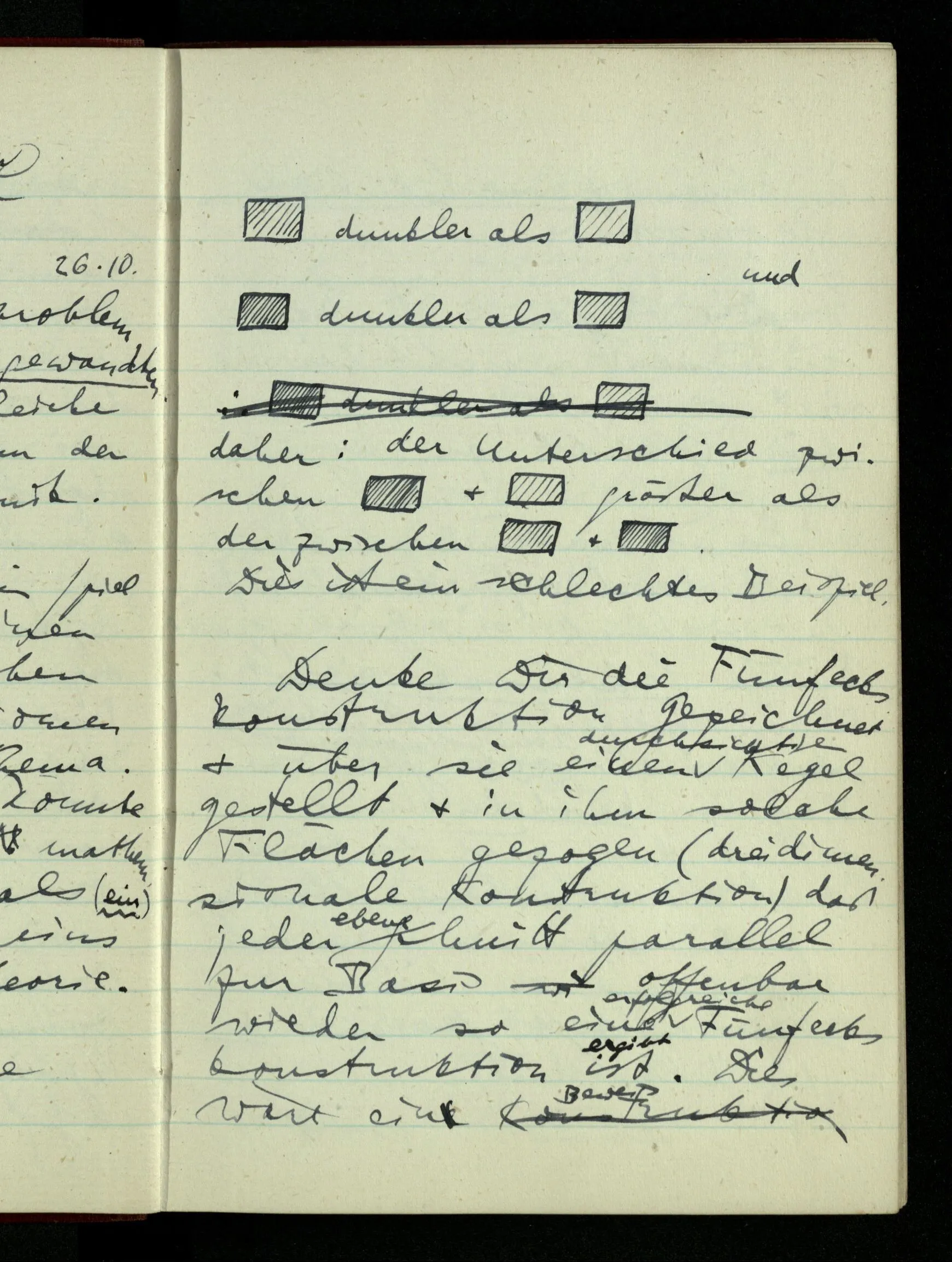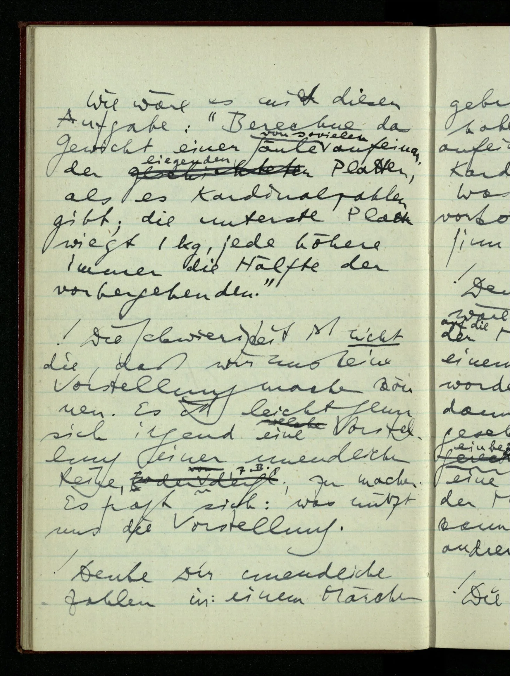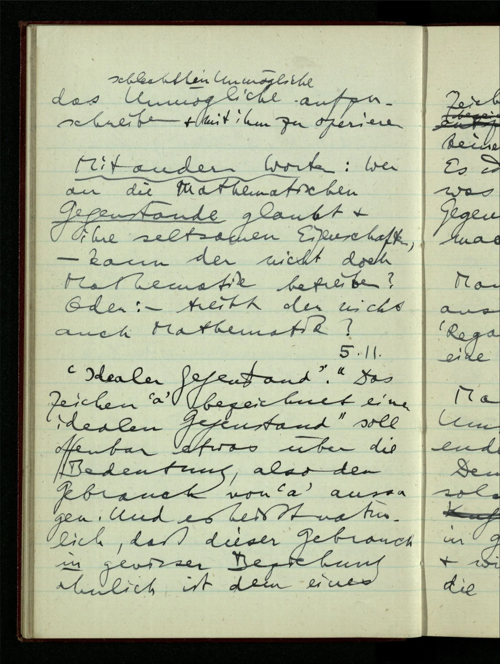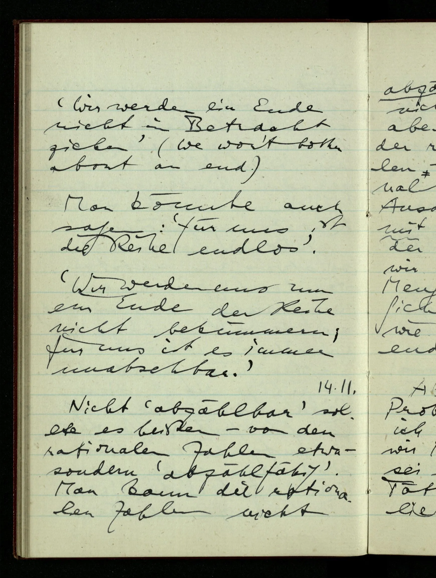 23.12.1942 Ich will, daß alle Zeichnungen, die aus diskreten Punkten & Strichen bestehen, wie sie in den Büchern die Lehre von den irrationalen Zahlen, des Limes, der Stätigkeit, etc. begleiten, sich auf die Wahl diskreter Zahlen & Zahlenkombinationen beziehen, & nicht auf Funktionen, irrationale Zahlen, etc.