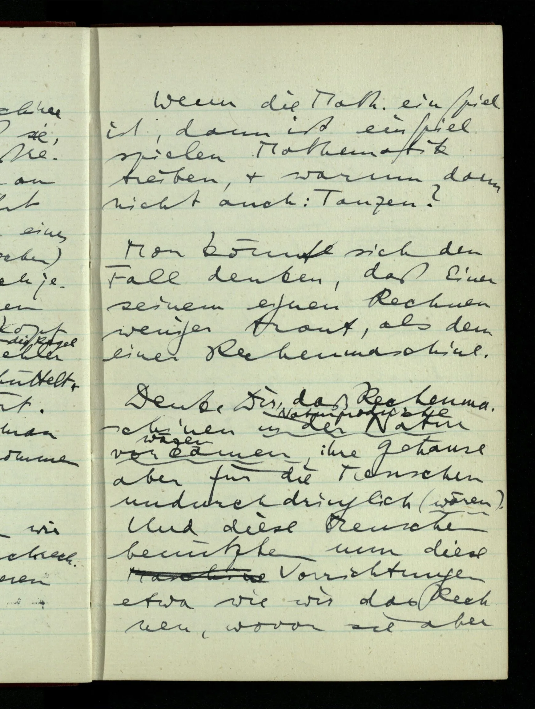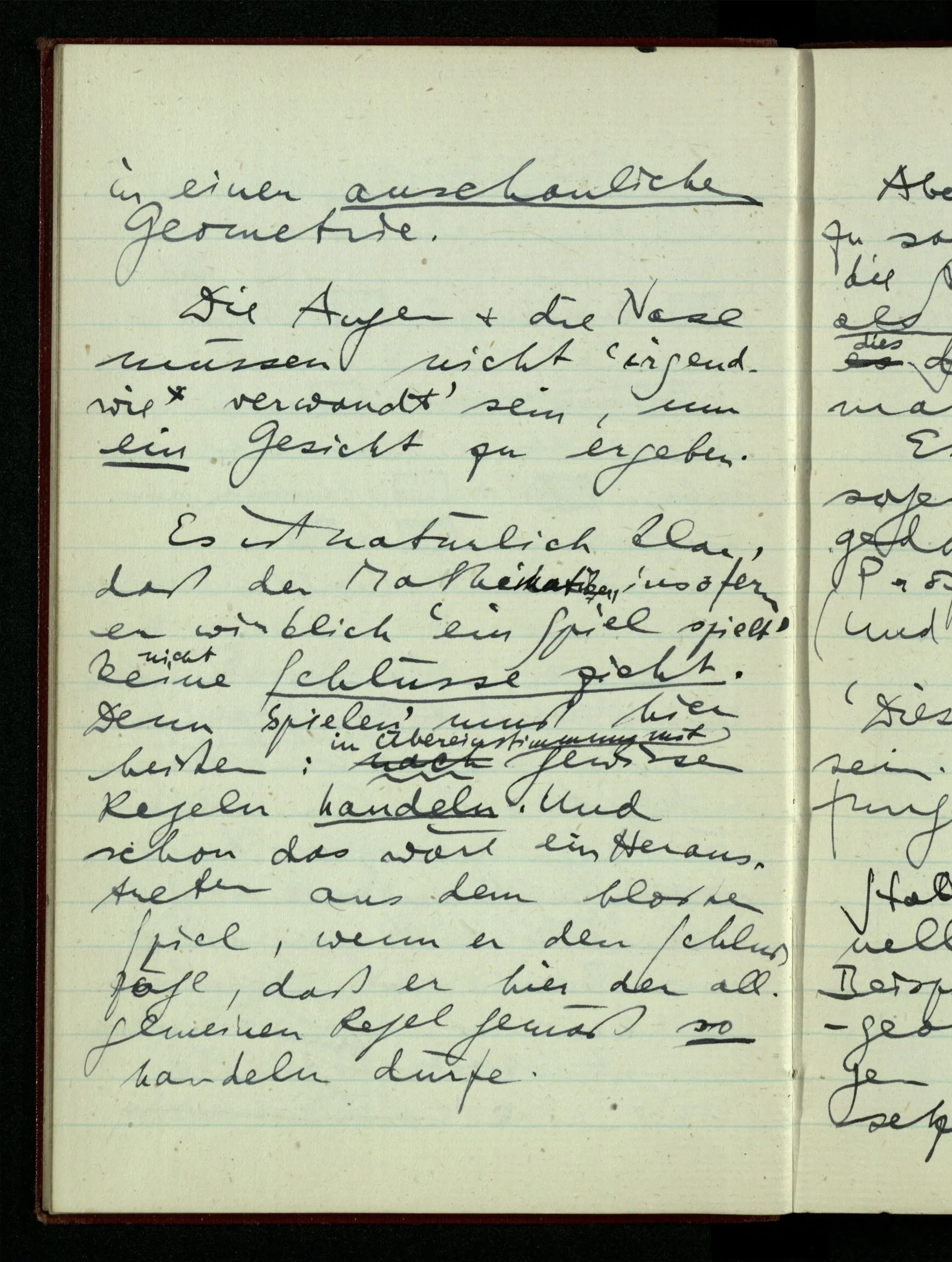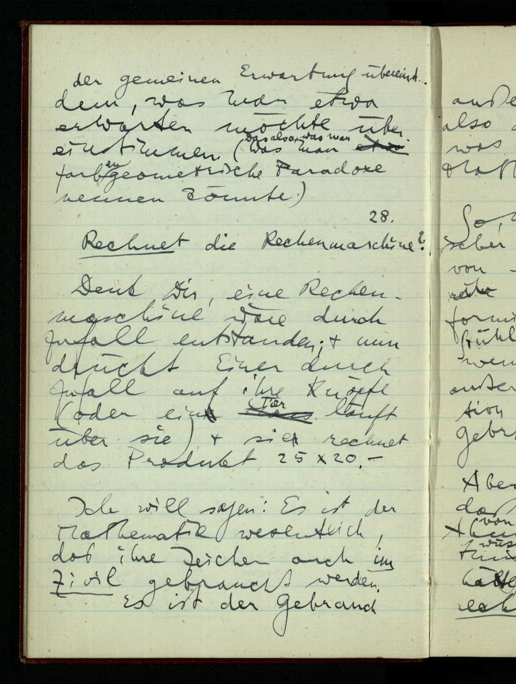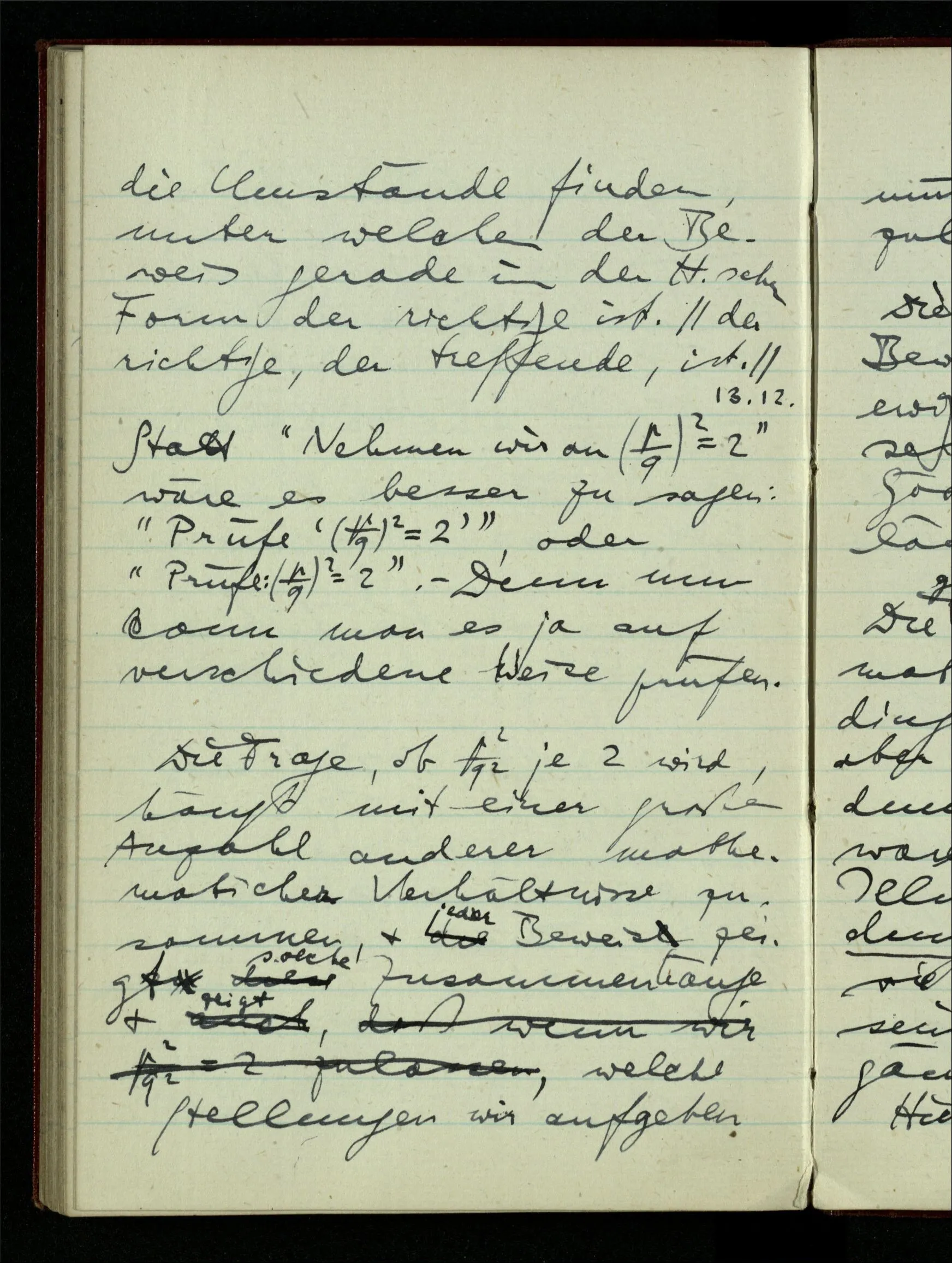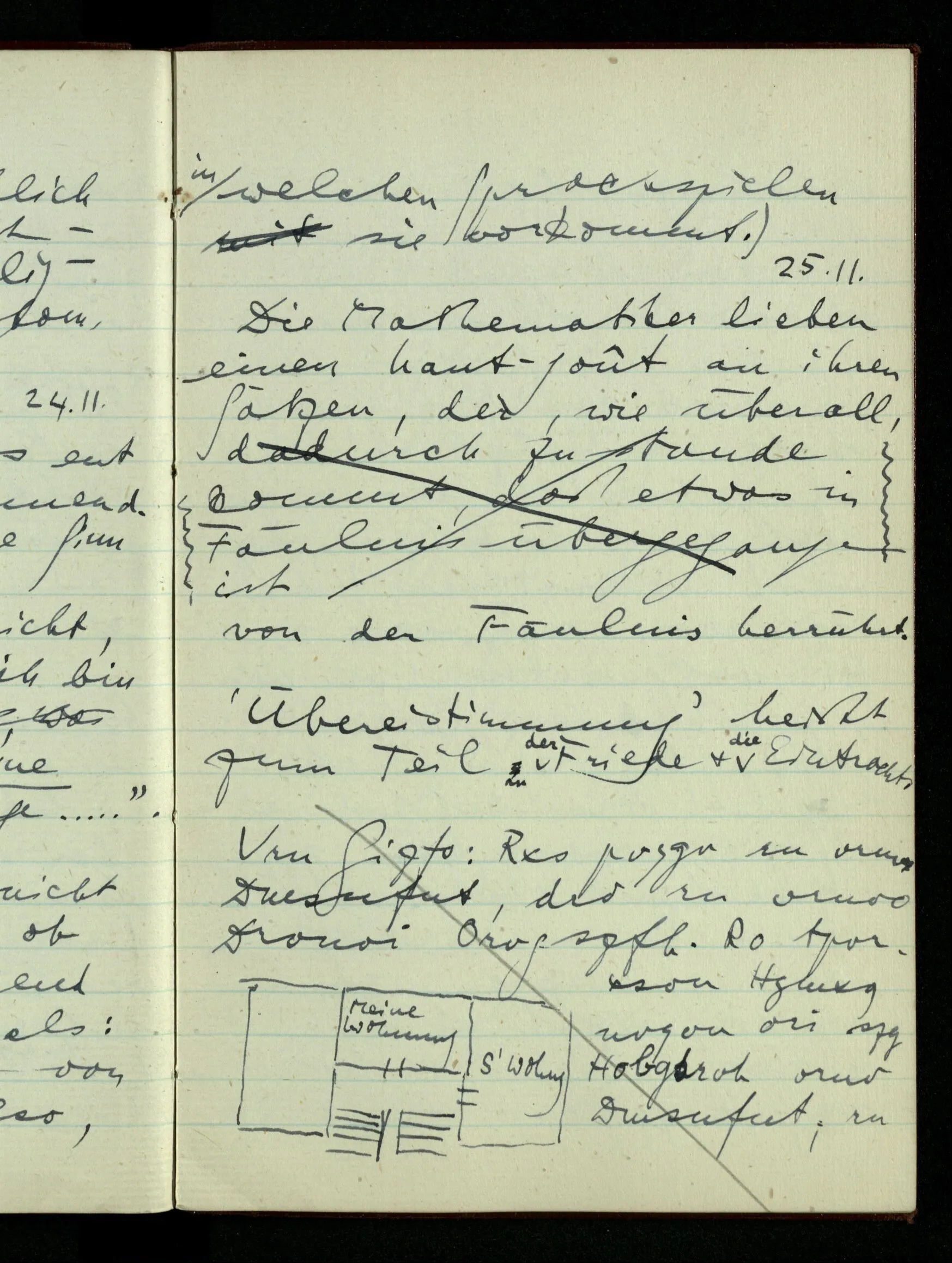 23.12.1942 Ich will, daß alle Zeichnungen, die aus diskreten Punkten & Strichen bestehen, wie sie in den Büchern die Lehre von den irrationalen Zahlen, des Limes, der Stätigkeit, etc. begleiten, sich auf die Wahl diskreter Zahlen & Zahlenkombinationen beziehen, & nicht auf Funktionen, irrationale Zahlen, etc.