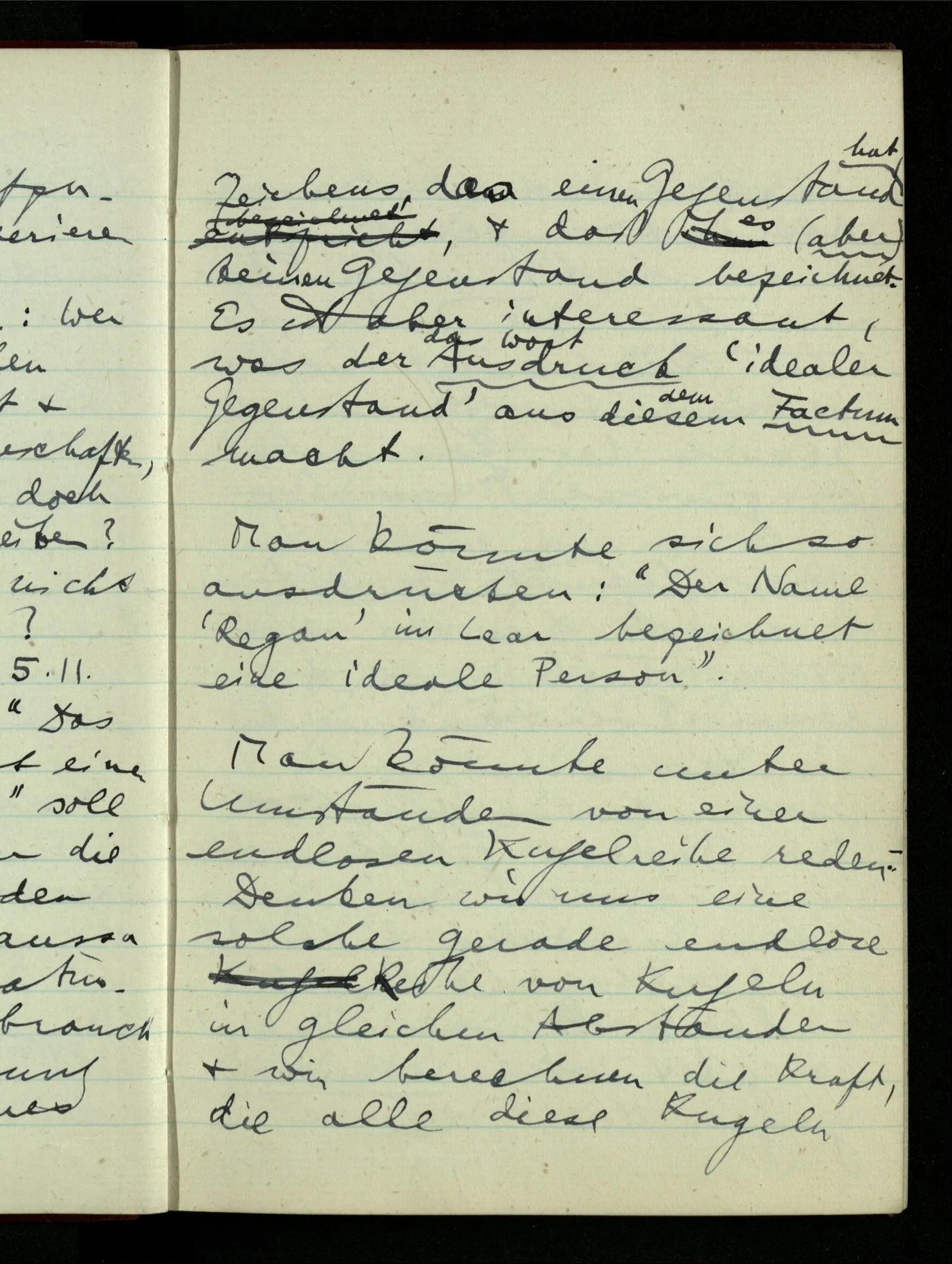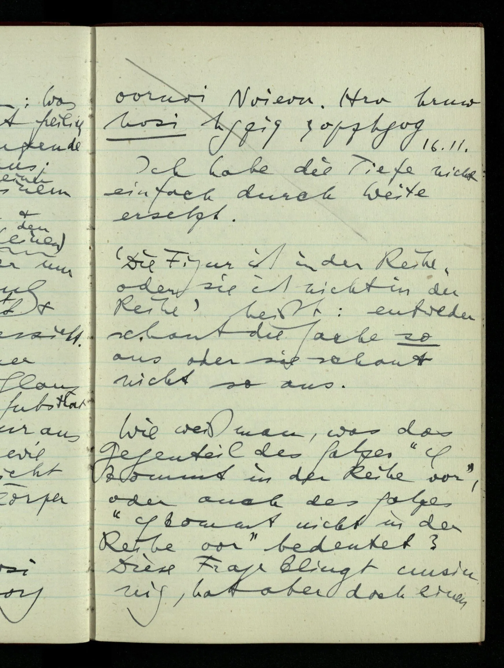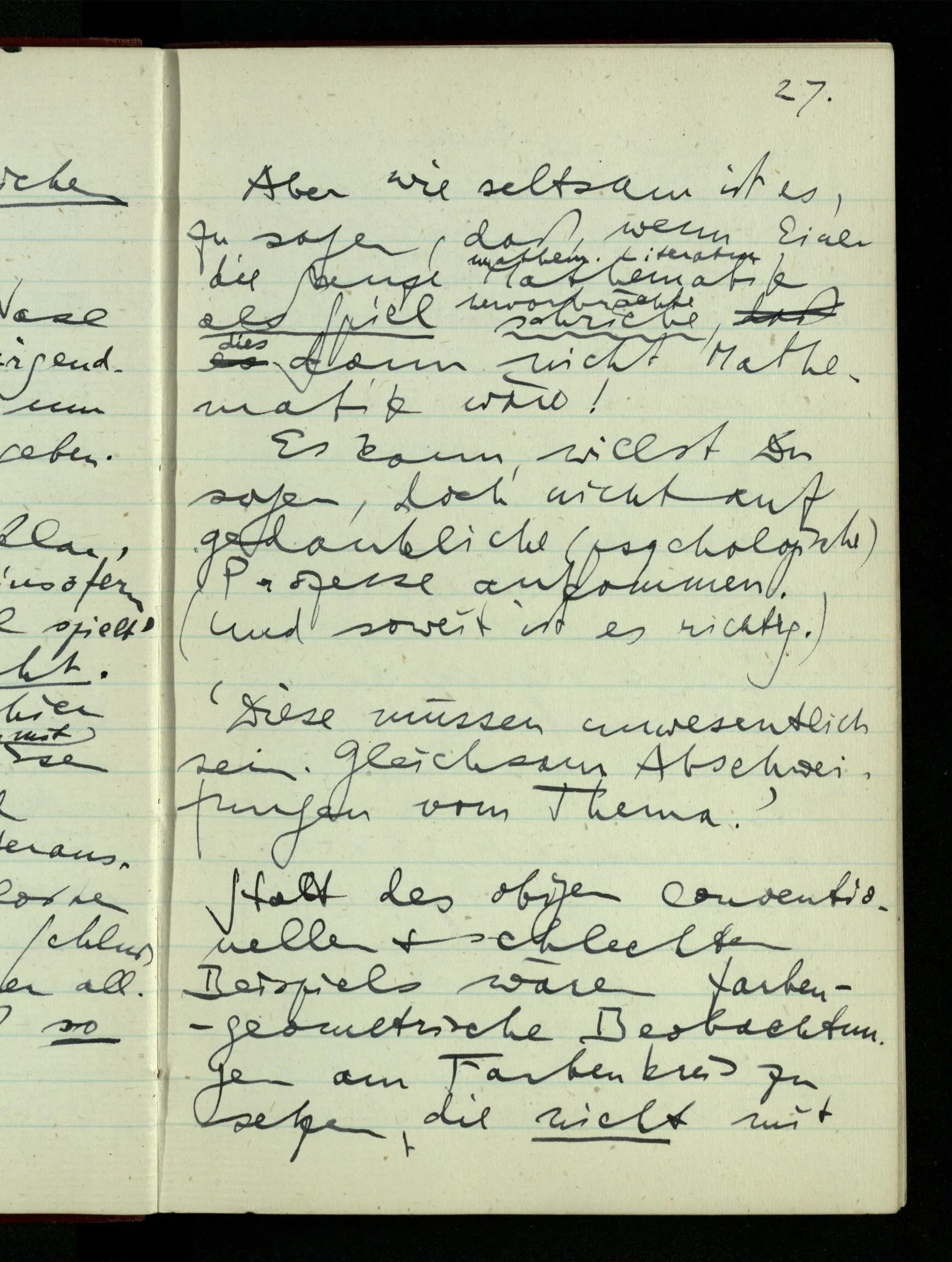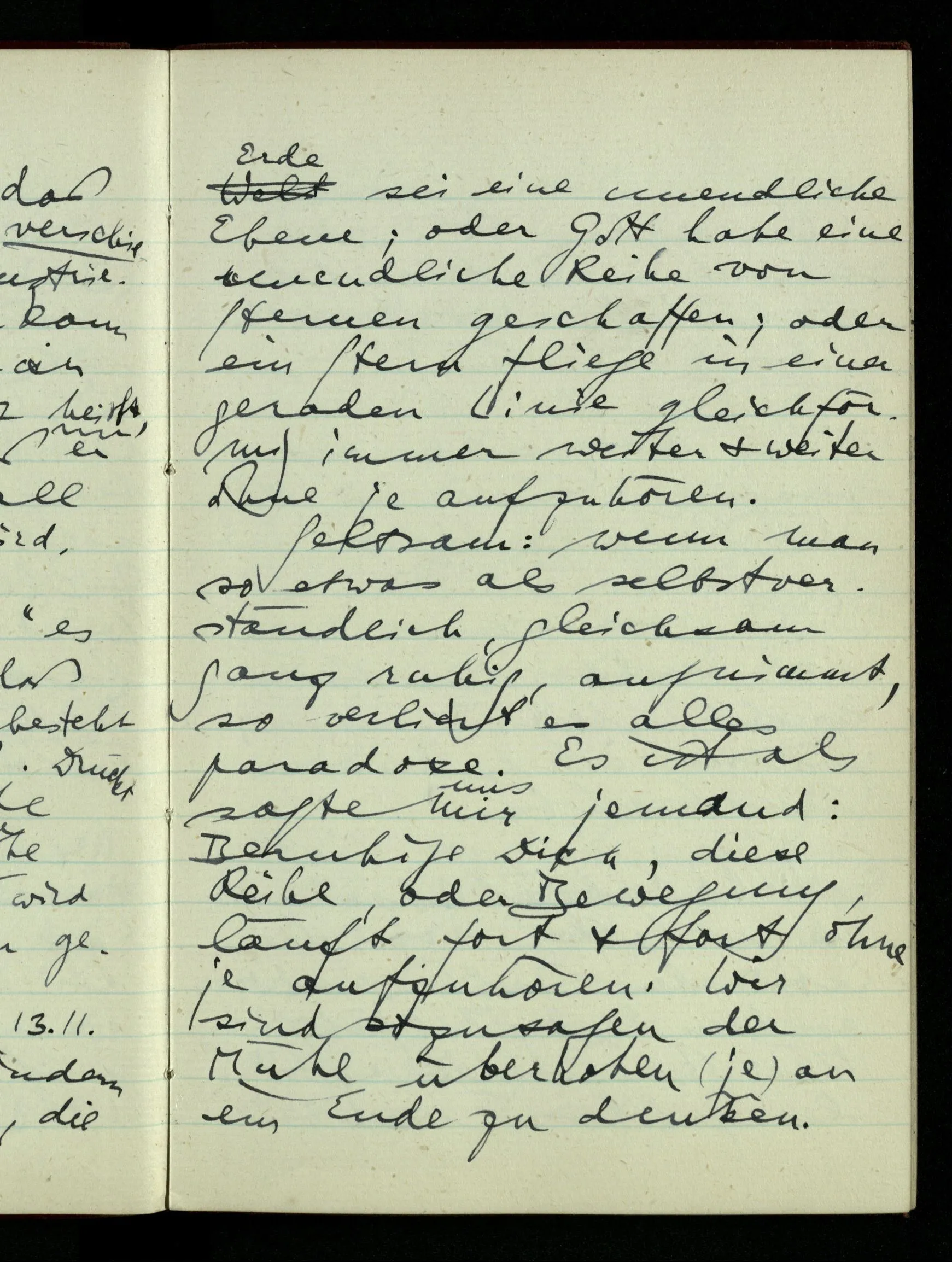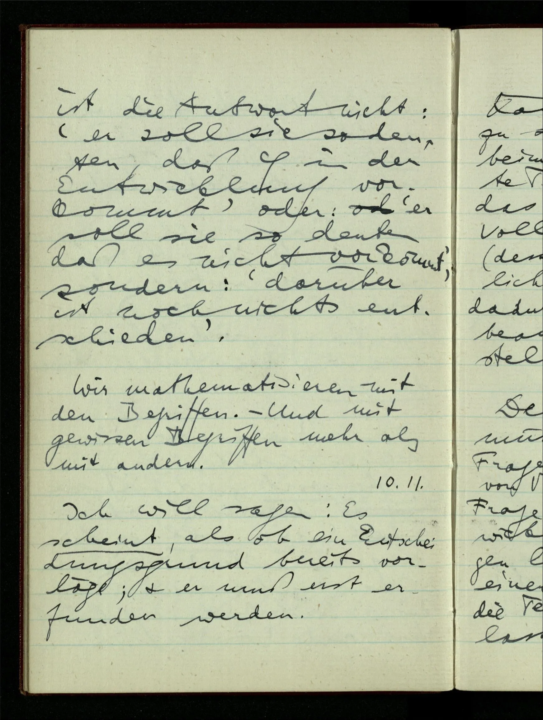 23.12.1942 Ich will, daß alle Zeichnungen, die aus diskreten Punkten & Strichen bestehen, wie sie in den Büchern die Lehre von den irrationalen Zahlen, des Limes, der Stätigkeit, etc. begleiten, sich auf die Wahl diskreter Zahlen & Zahlenkombinationen beziehen, & nicht auf Funktionen, irrationale Zahlen, etc.