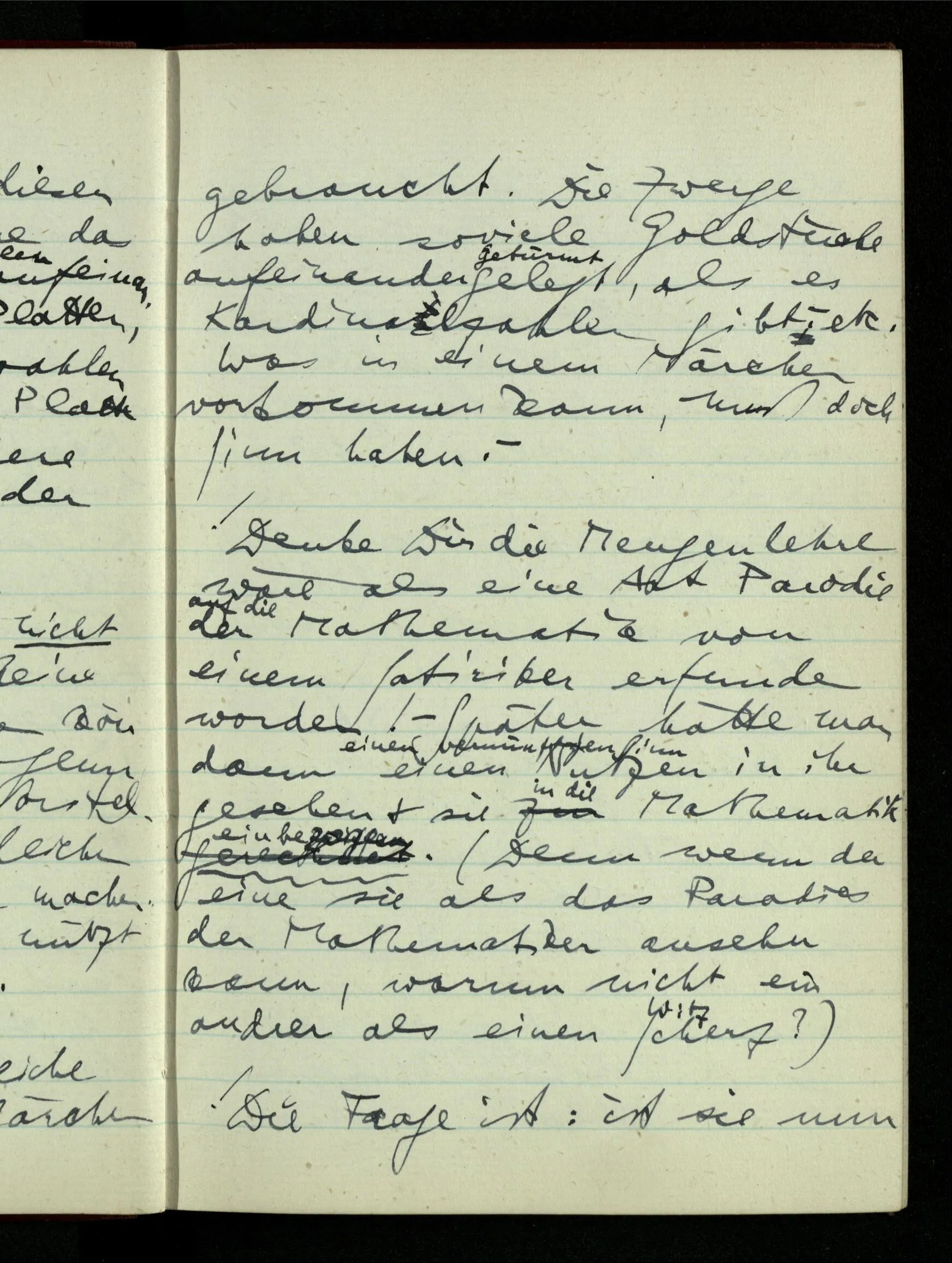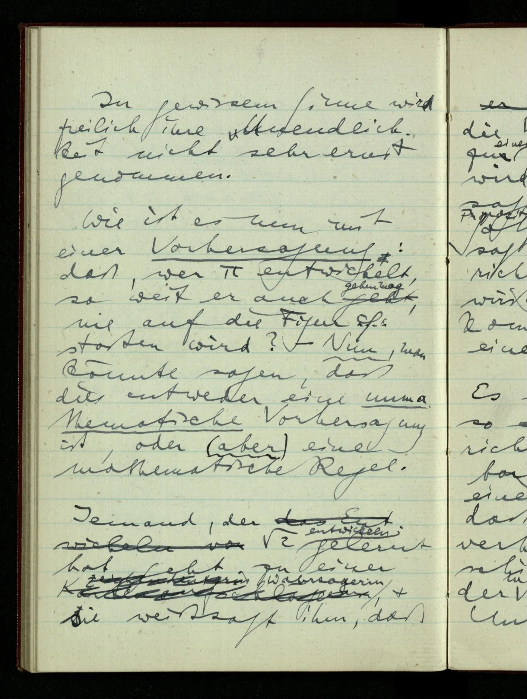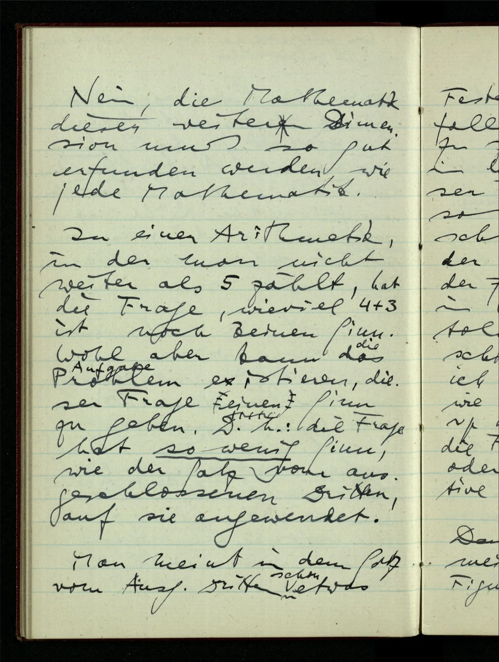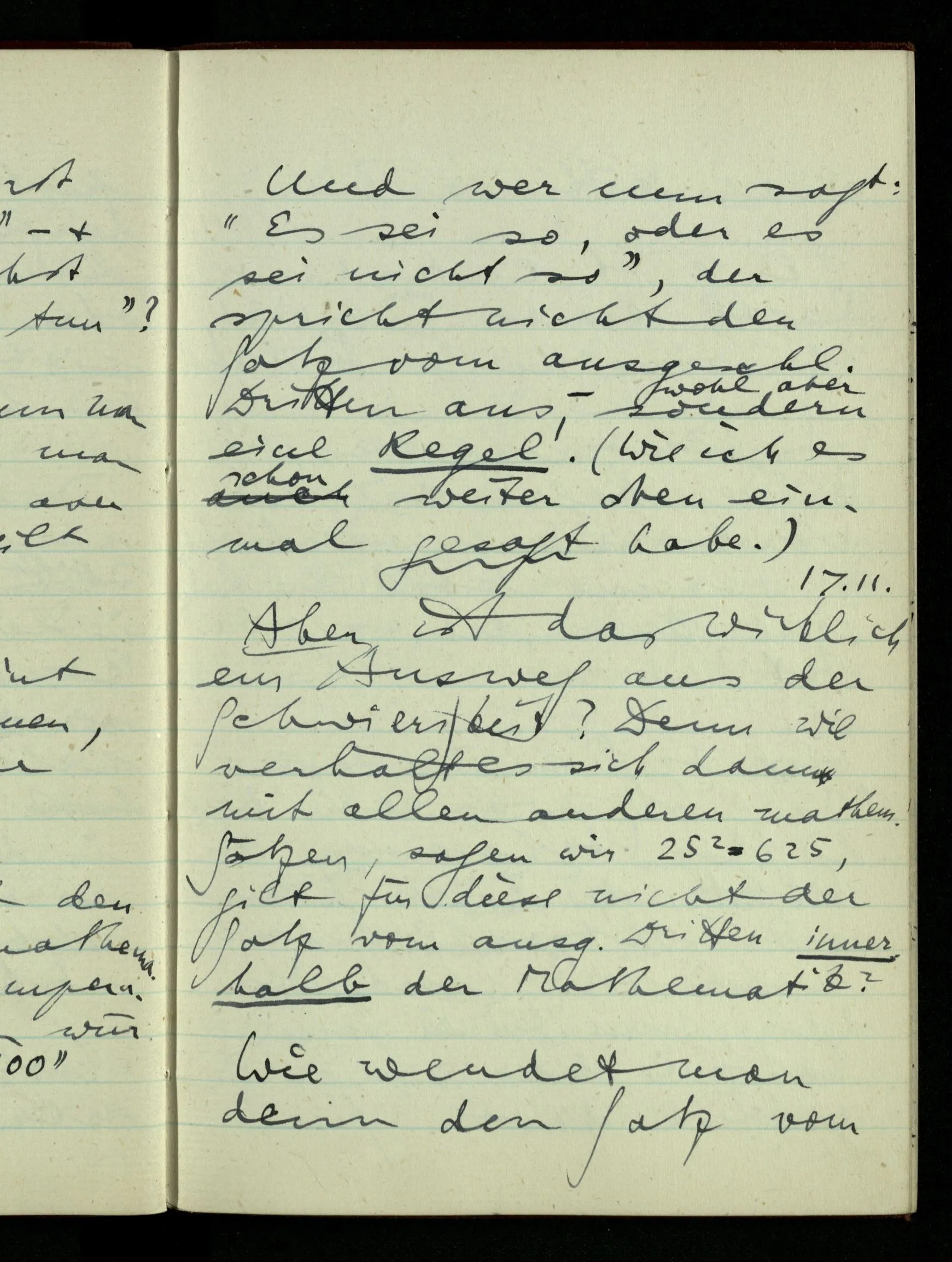 06.01.1943 Vergessen wir nicht, daß ursprünglich die Teilung der rationalen Zahlen in zwei Klassen keinen Sinn hatte, bis wir auf Gewisses aufmerksam machten, was man so bezeichnen konnte. Der Begriff ist vom täglichen Sprachgebrauch hergenommen & scheint darum auch für die Zahlen unmittelbar einen Sinn haben zu müssen.