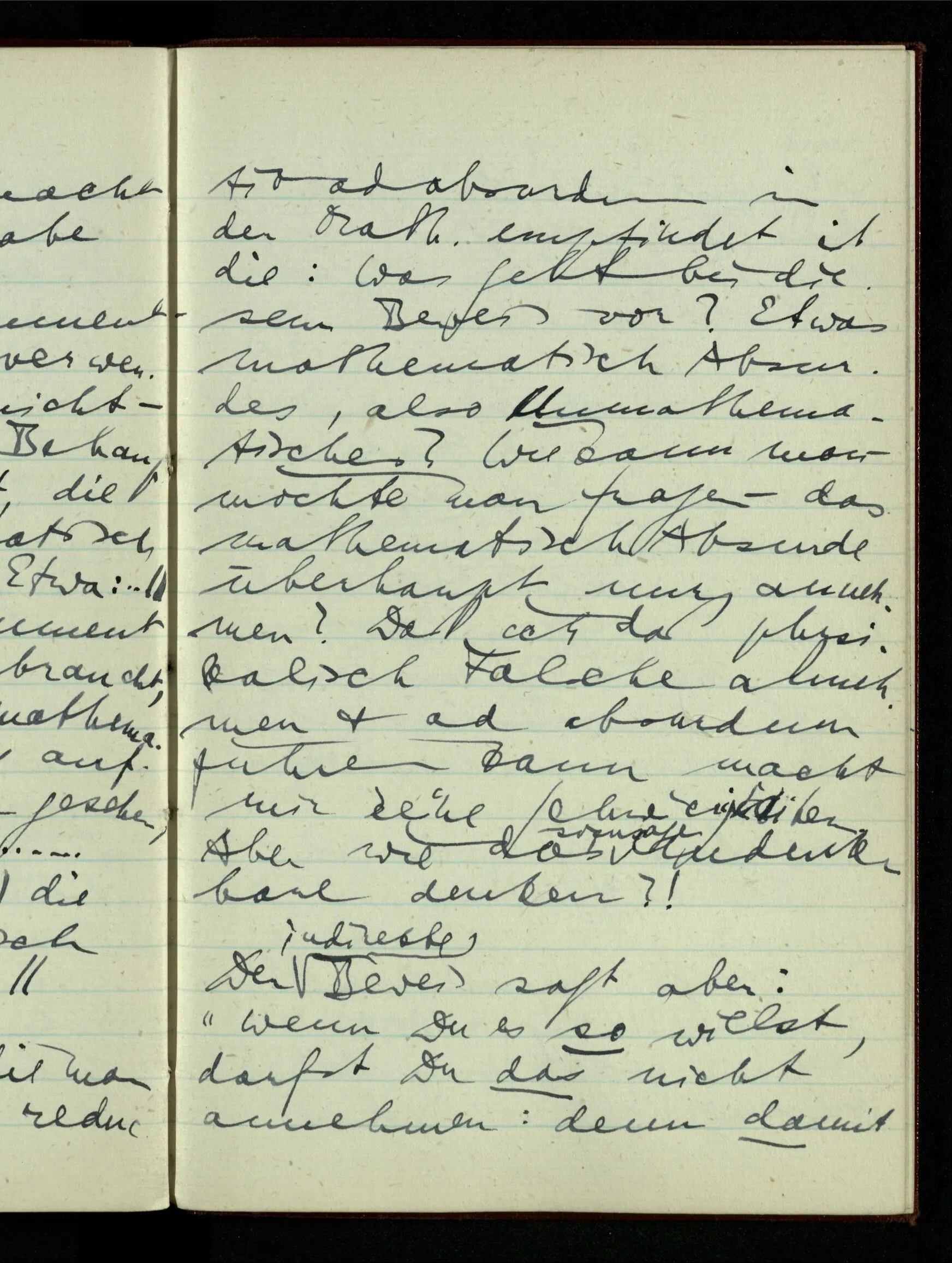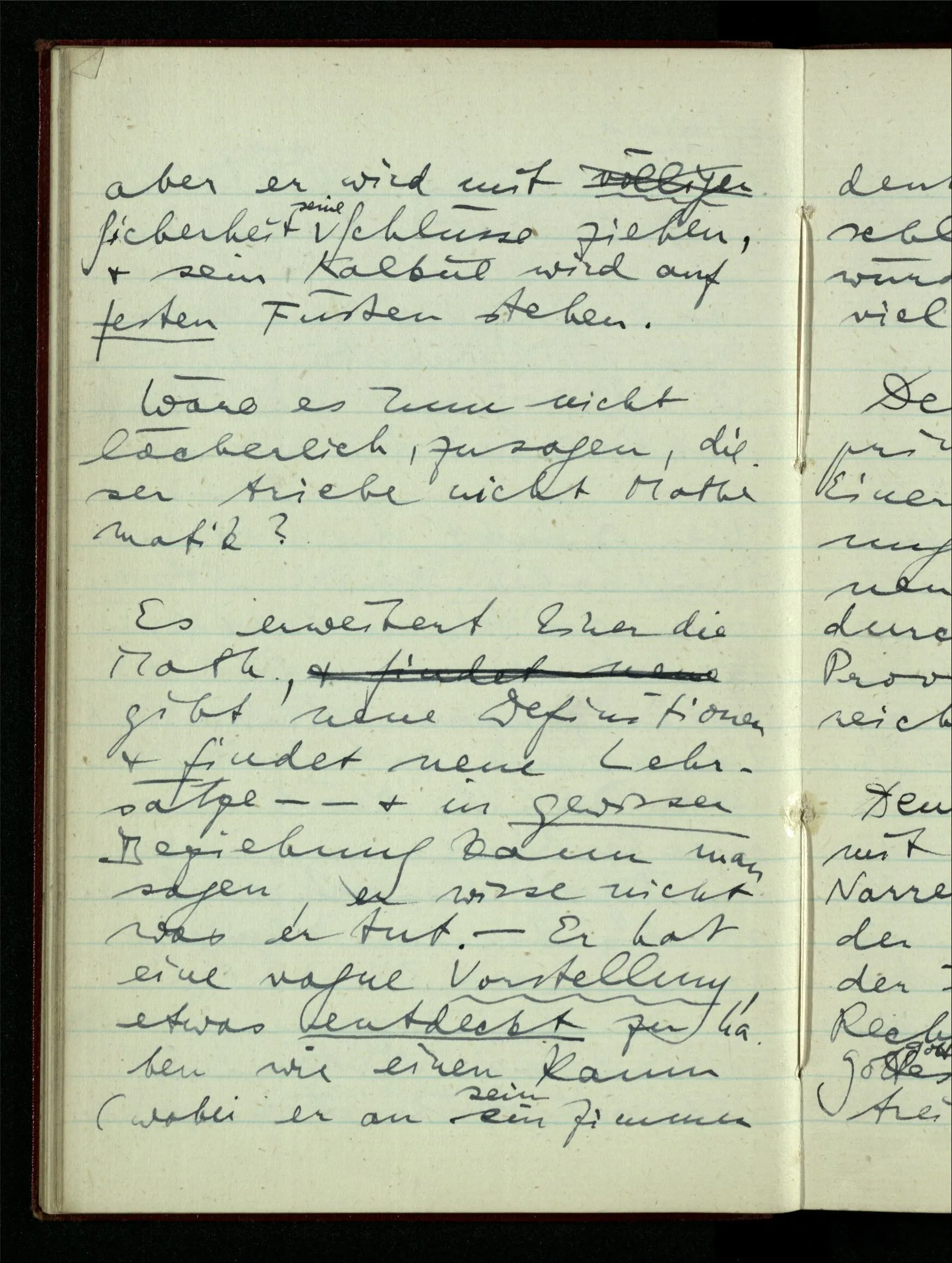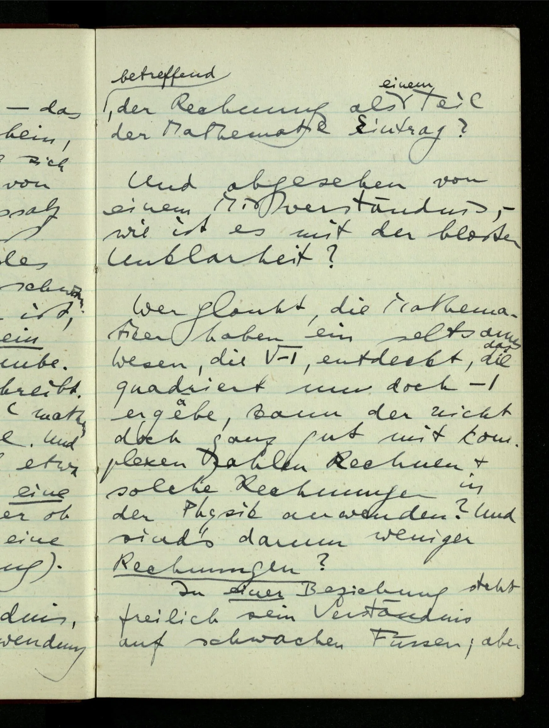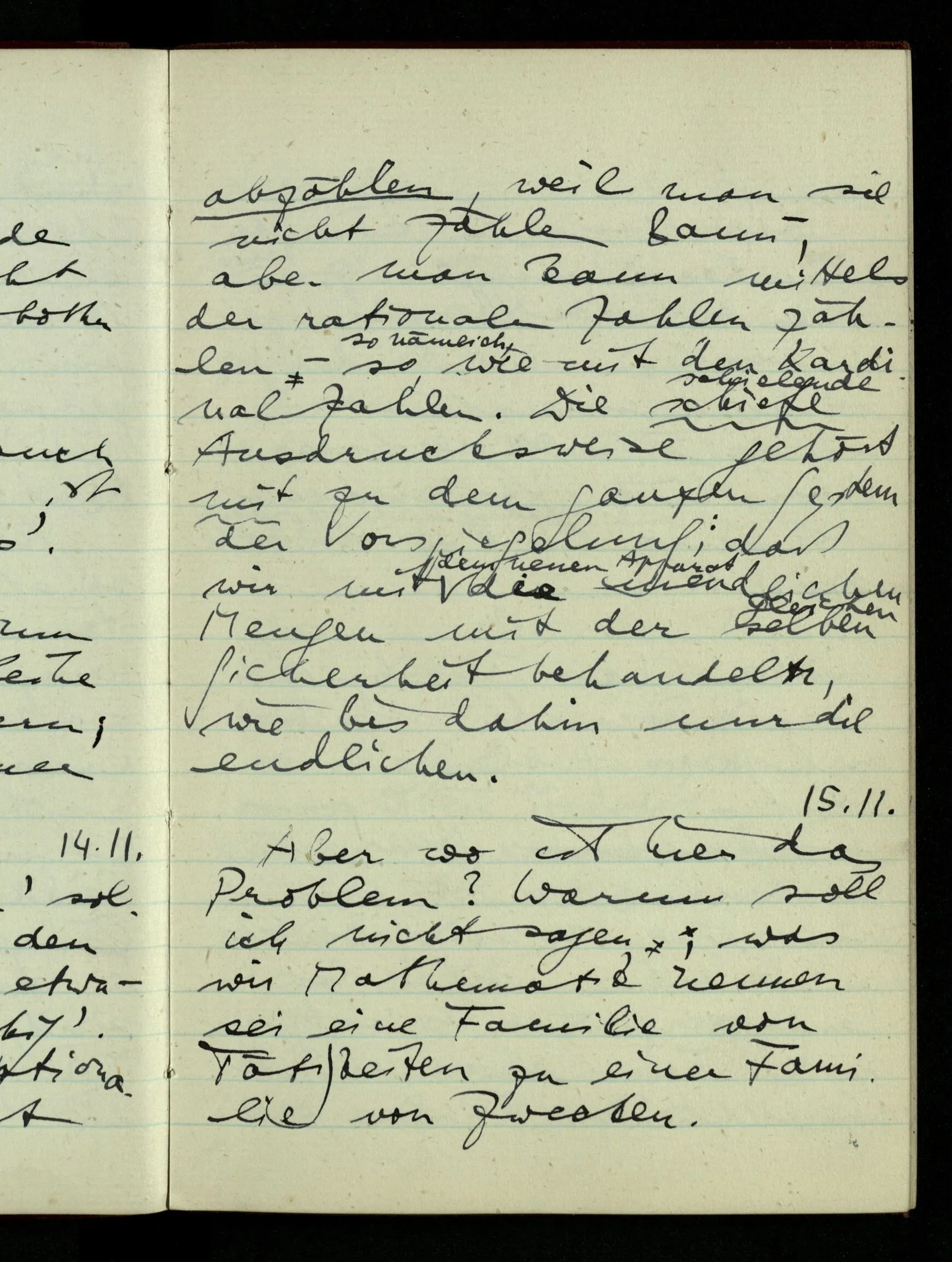 06.01.1943 Vergessen wir nicht, daß ursprünglich die Teilung der rationalen Zahlen in zwei Klassen keinen Sinn hatte, bis wir auf Gewisses aufmerksam machten, was man so bezeichnen konnte. Der Begriff ist vom täglichen Sprachgebrauch hergenommen & scheint darum auch für die Zahlen unmittelbar einen Sinn haben zu müssen.