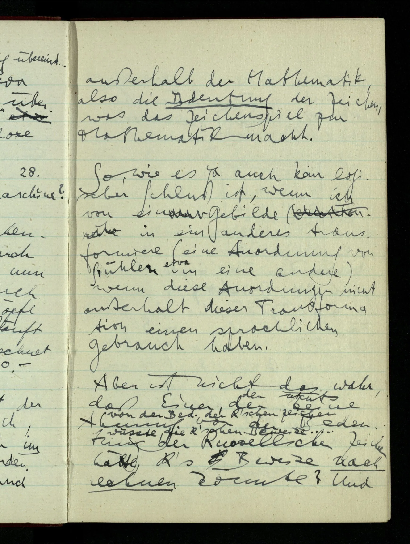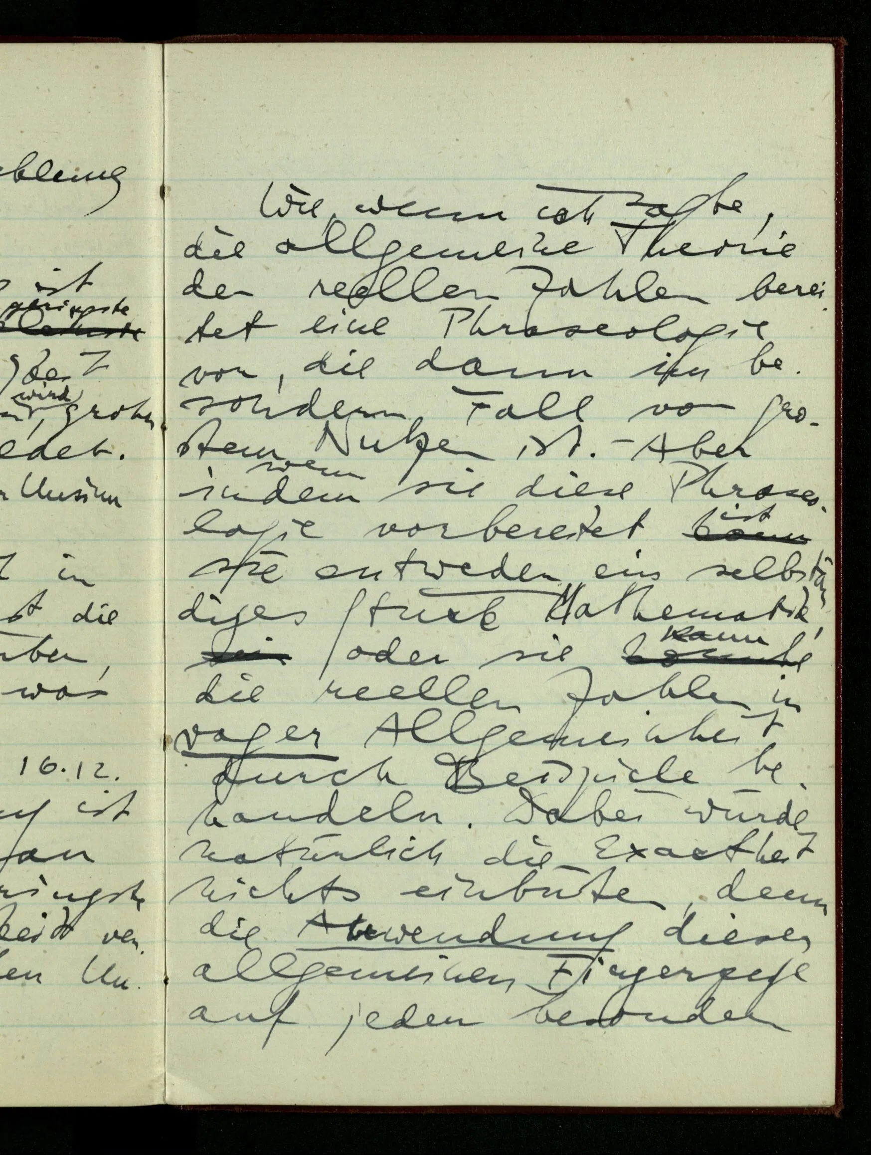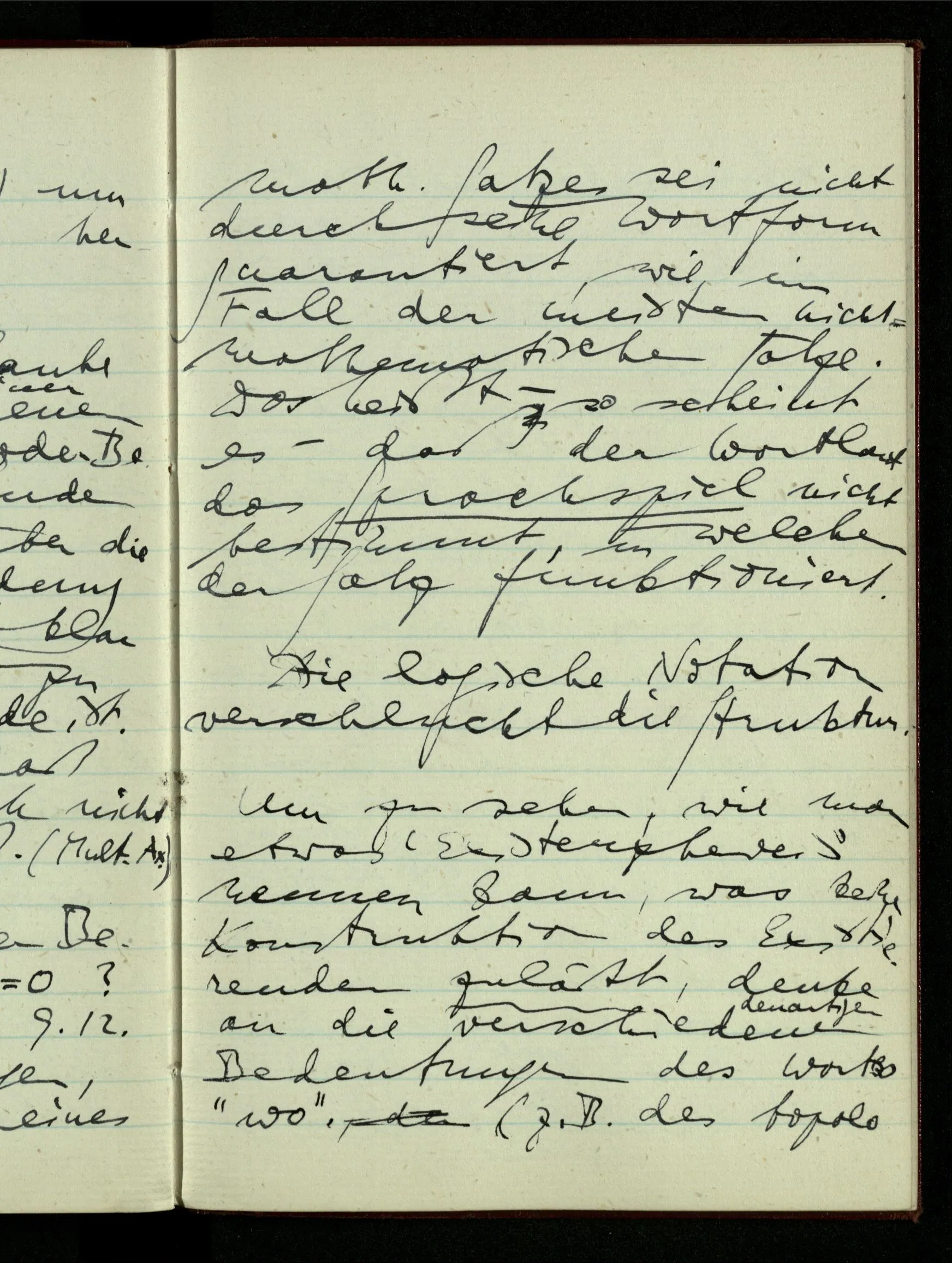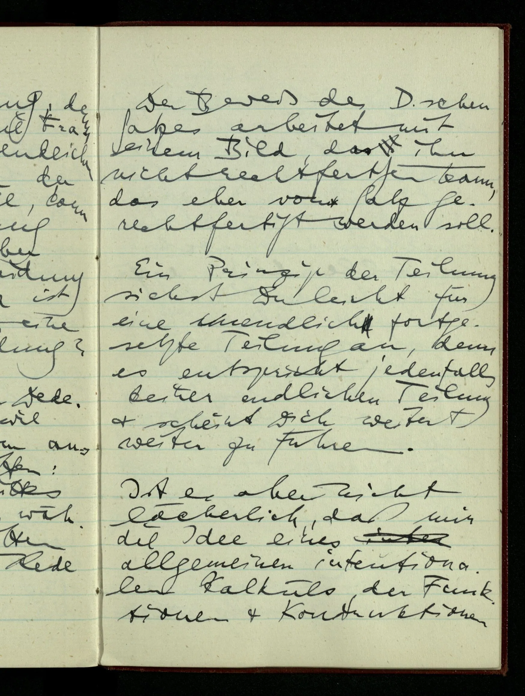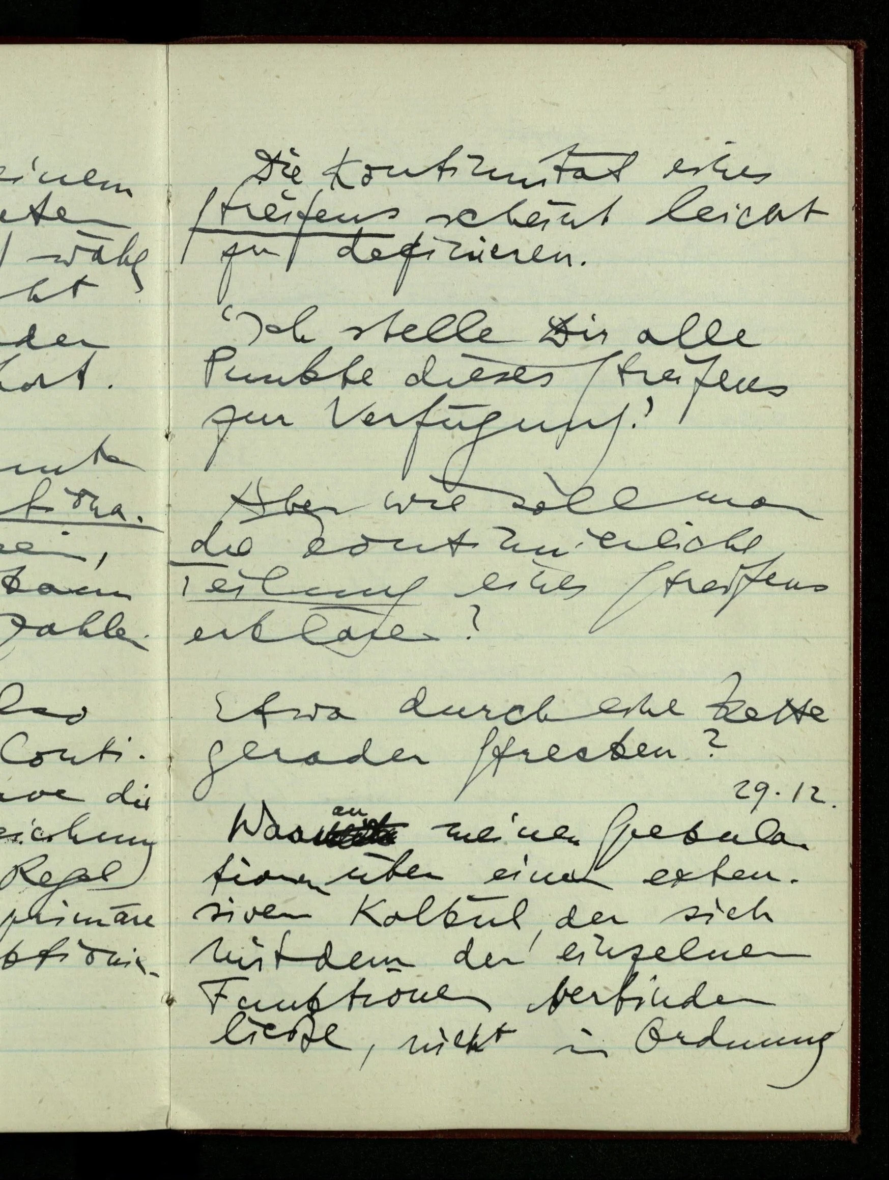 29.12.1942 Was an meinen Spekulationen über einen extensiven Kalkül, der sich mit dem der einzelnen Funktionen verbinden ließe, nicht in Ordnung ist: ich bin ganz unklar darüber, was die Anwendung so eines Kalküls unabhängig von den Funktionen sein könnte.