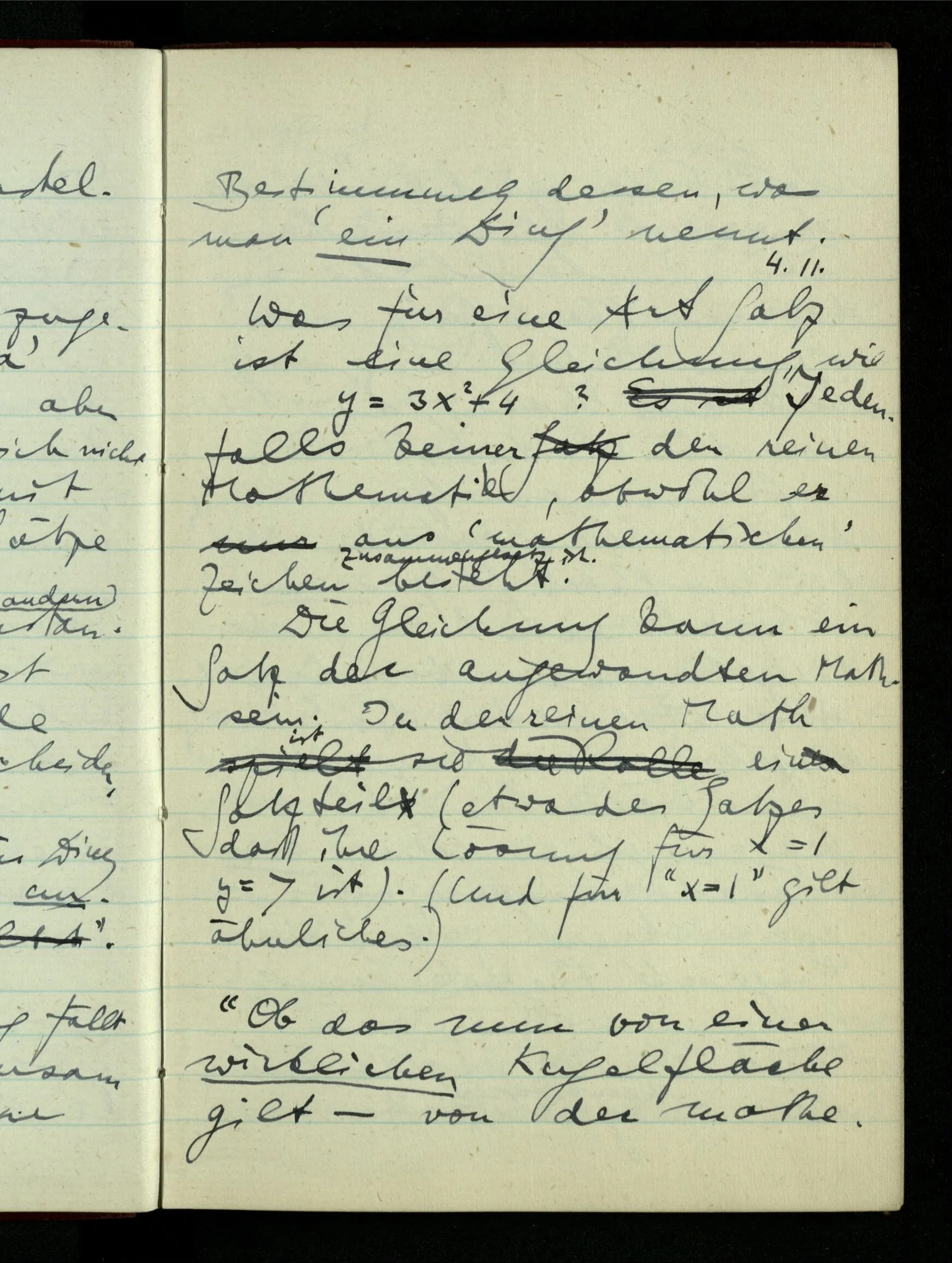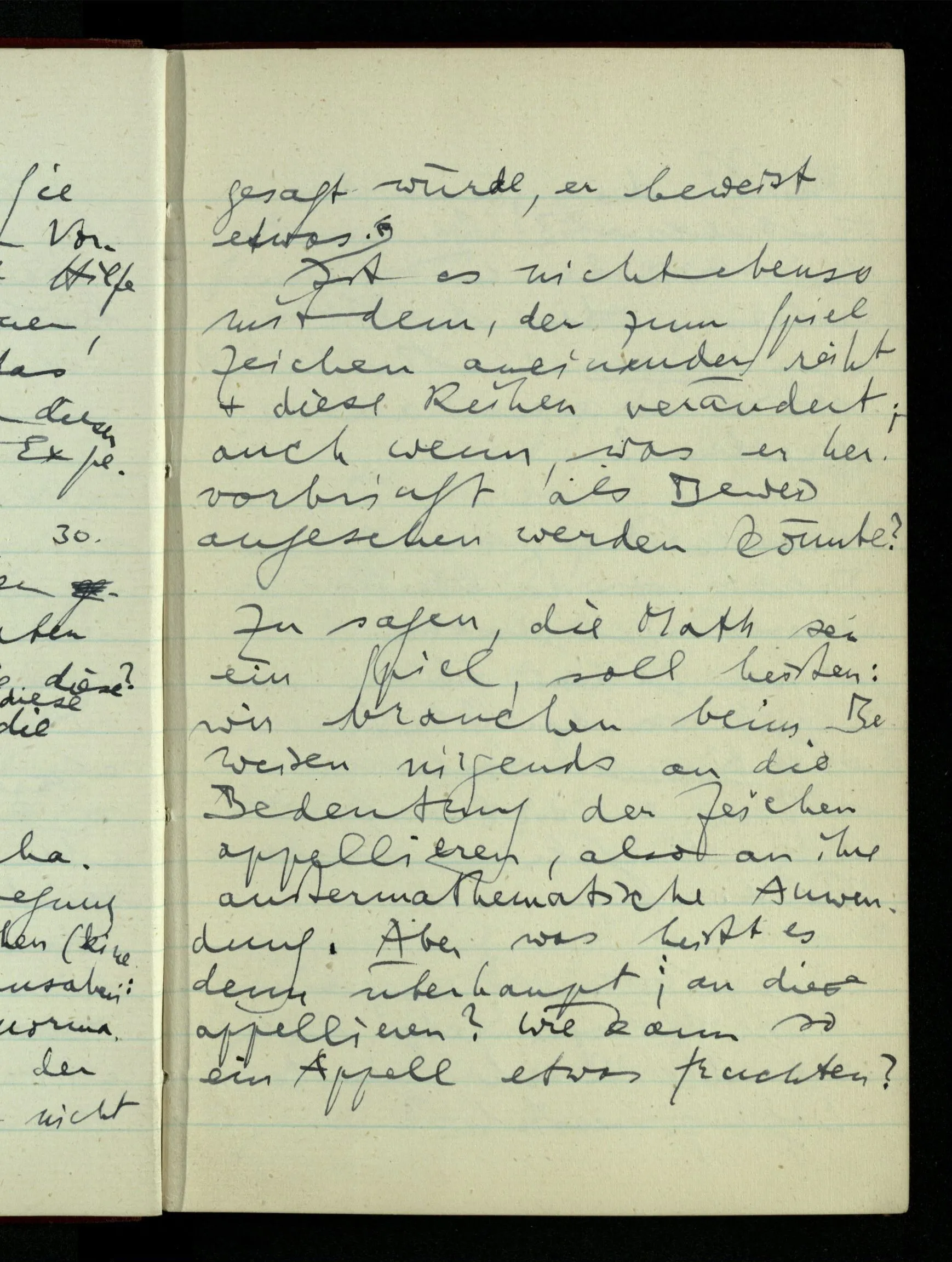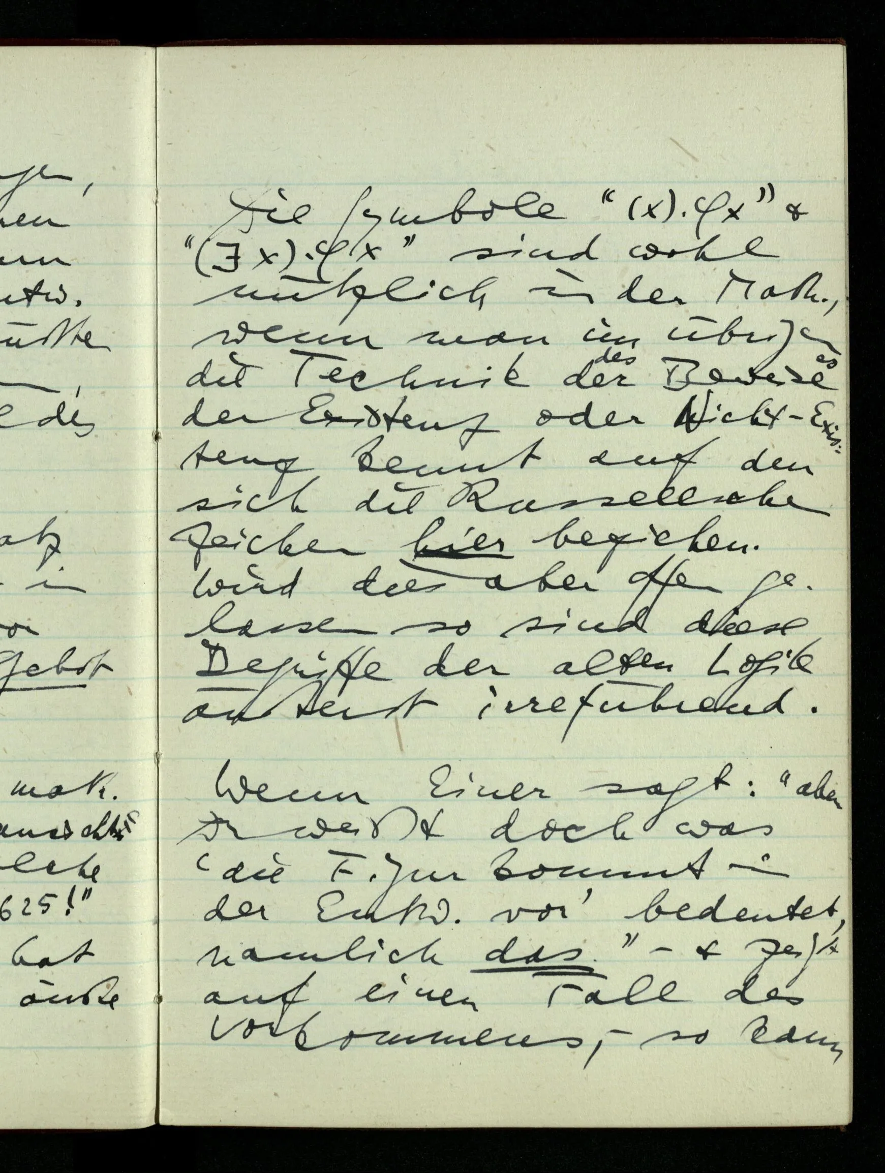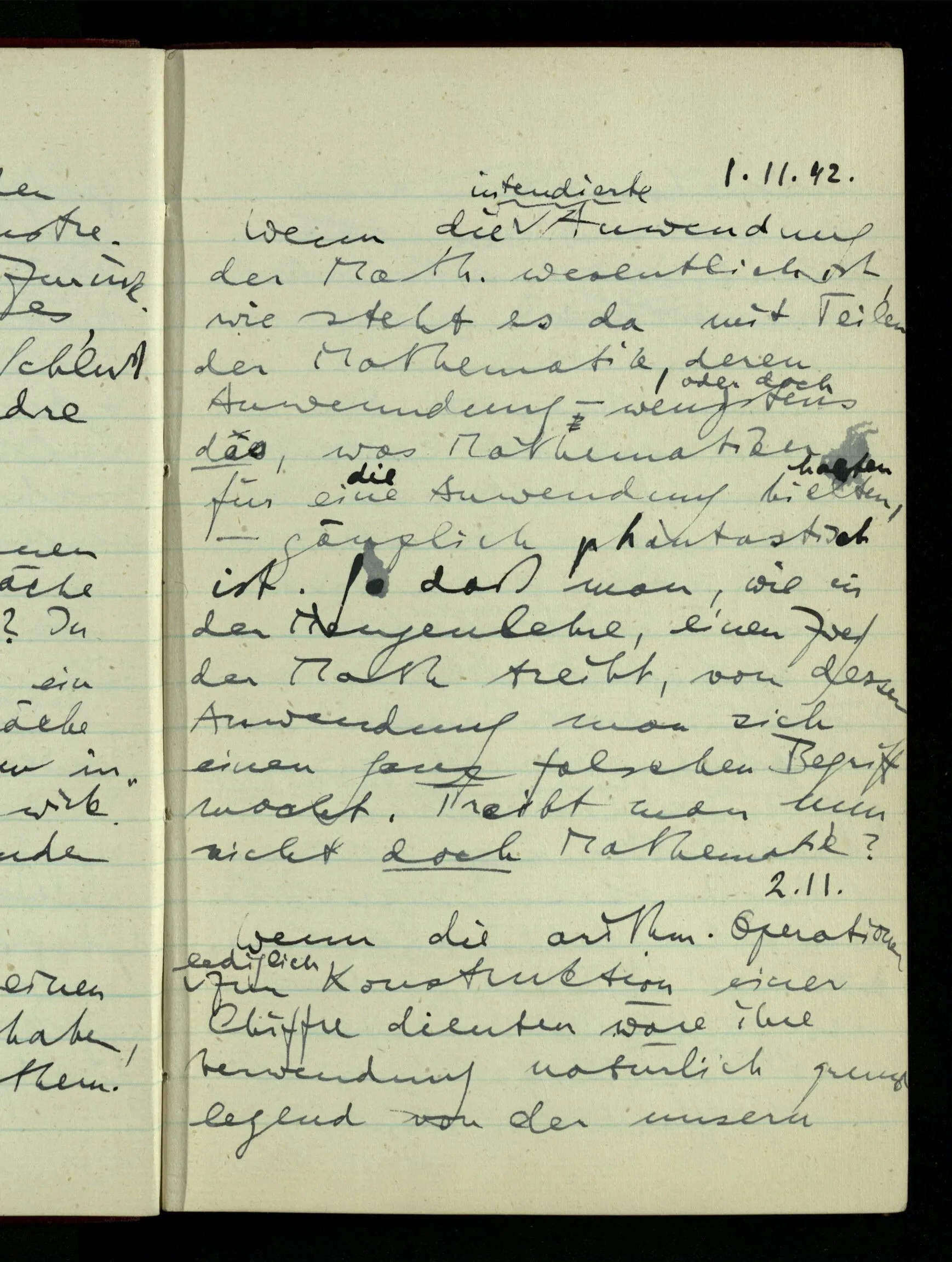 29.12.1942 Was an meinen Spekulationen über einen extensiven Kalkül, der sich mit dem der einzelnen Funktionen verbinden ließe, nicht in Ordnung ist: ich bin ganz unklar darüber, was die Anwendung so eines Kalküls unabhängig von den Funktionen sein könnte.