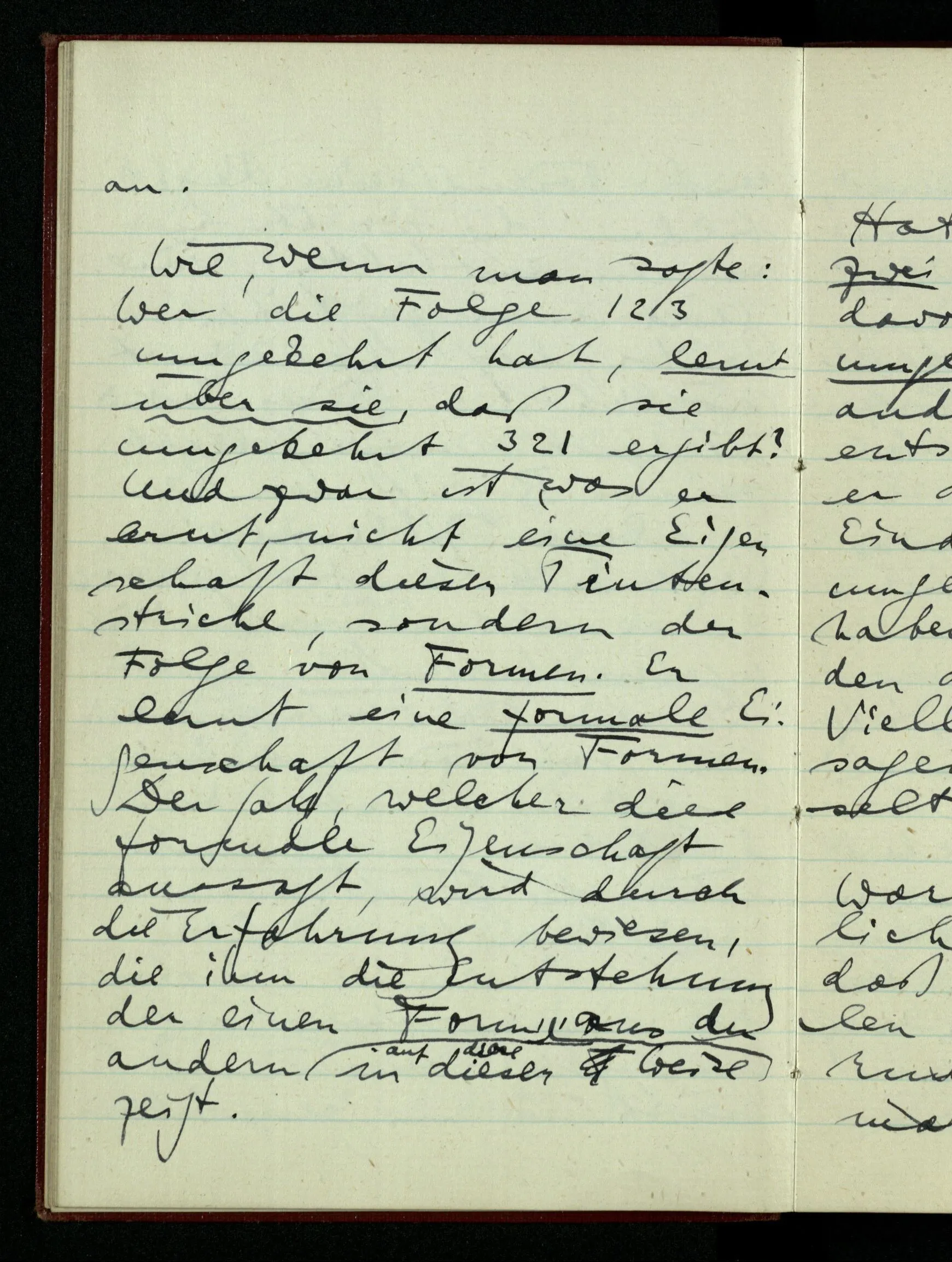 Wie, wenn man sagte: Wer die Folge 1 2 3 umgekehrt hat, lernt über sie, daß sie umgekehrt 3 2 1 ergibt? Und zwar ist, was er lernt, nicht eine Eigenschaft dieser Tintenstriche, sondern der Folge von Formen. Er lernt eine formale Eigenschaft von Formen. Der Satz, welcher diese formale Eigenschaft aussagt, wird durch die Erfahrung bewiesen, die ihm die Entstehung der einen Form, in dieser Weise, aus der andern zeigt.